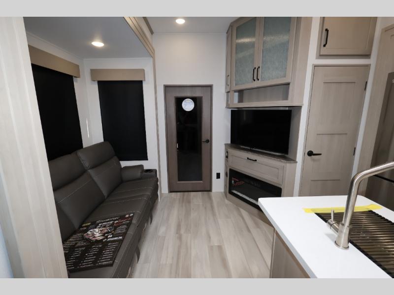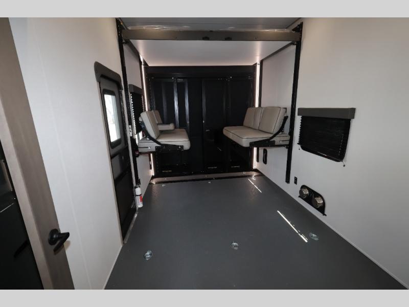 Just imagine the fun you will have with this Momentum G-Class toy hauler set up at any off-road park. With the 14' 6" separate garage that includes a half bath, a second exterior entry door, rollover sofas, a power bunk, and a loft, you will have your own area to do what you like. The rear ramp door can even be converted into a patio if you need more outdoor living space. The main living area offers a fireplace, theater seating, and kitchen appliances to make delicious home cooked meals. You will also be able to stay clean and ready for the next ride with the walk-in shower in the full bathroom, and the front master bedroom has plenty of storage for clothing with the wardrobe slide and overhead cabinets.