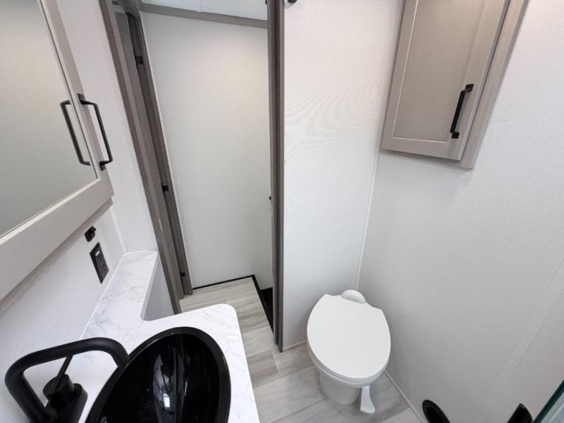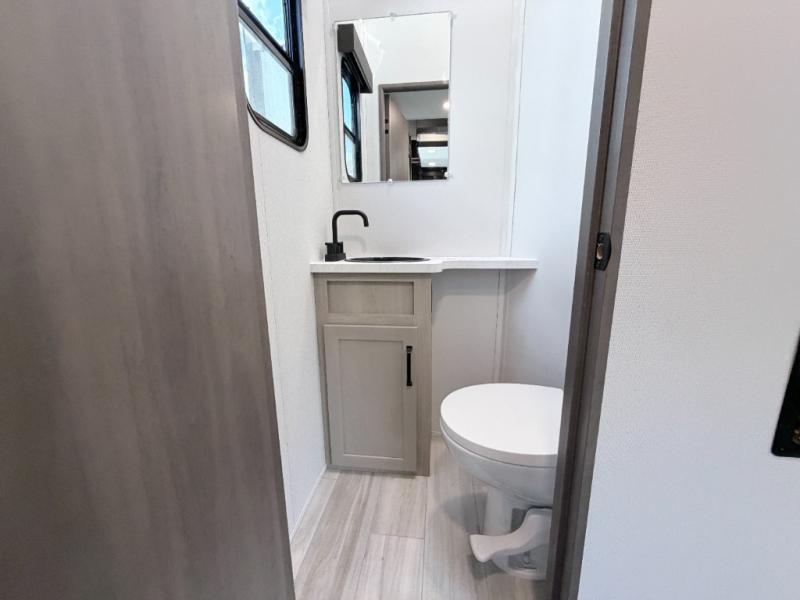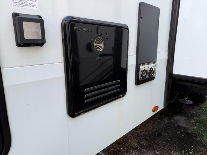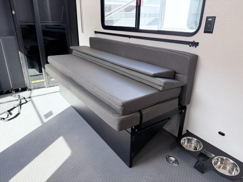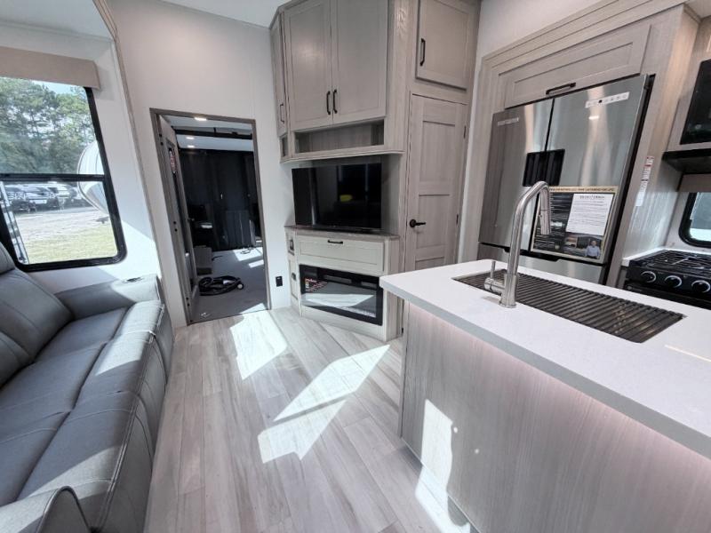 Inside, the main living area offers theater seating directly across from the entertainment center with a fireplace. The kitchen includes all the essentials to prepare meals after a full day of riding. A walk-in shower provides a refreshing place to clean up, and the front bedroom includes a wardrobe slide, overhead storage, and a comfortable bed for a great night's rest.