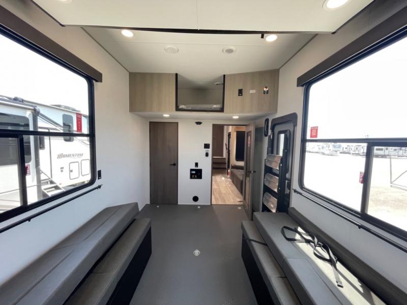 Are you looking for adventure and fun? The Momentum G-Class toy hauler by Grand Design will help you find it! You can explore during any season you choose with the Insulation Package that includes a heated and enclosed underbelly with suspended tanks, a high-capacity furnace, a moisture barrier floor enclosure, and cabinet-mounted heat ducts. Each model includes a fuel station with an interior and exterior gauge, a dovetail rear rend, and 2,500-LB tie-downs anchored into the chassis. Throughout the Momentum G-Class interior, you'll enjoy many comfortable features like large panoramic windows, a shower skylight, USB chargers in the bedroom, and residential cabinetry.