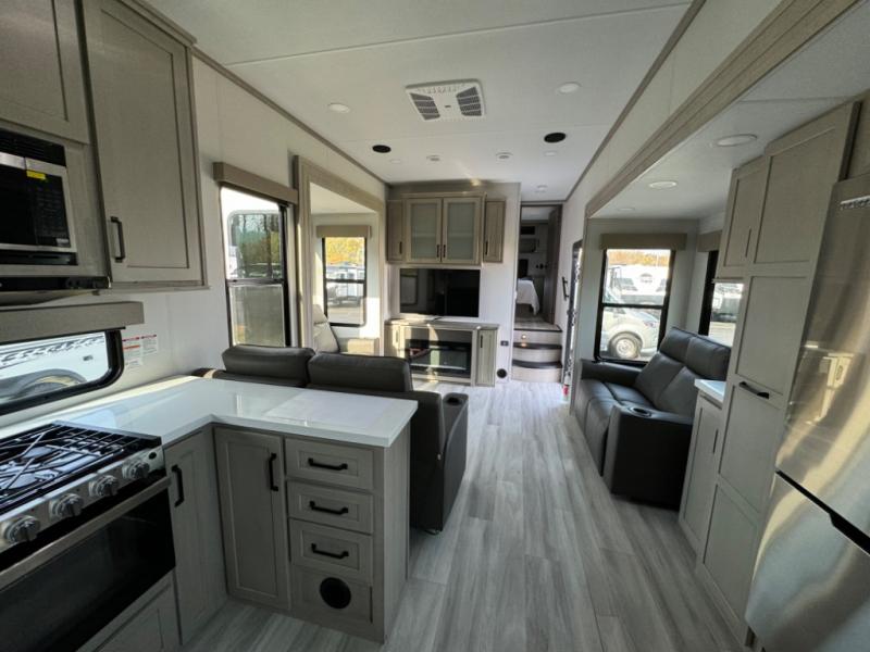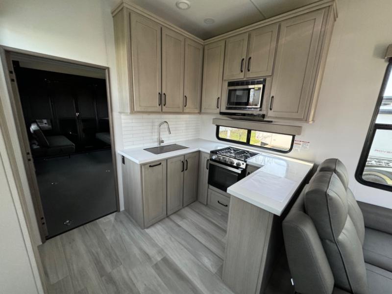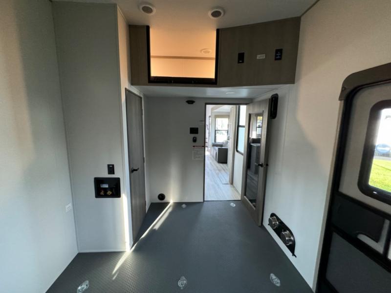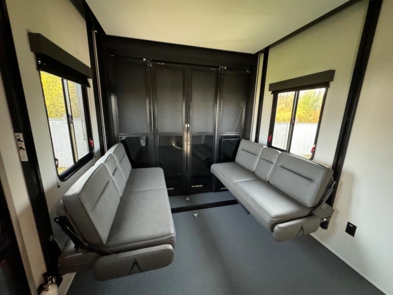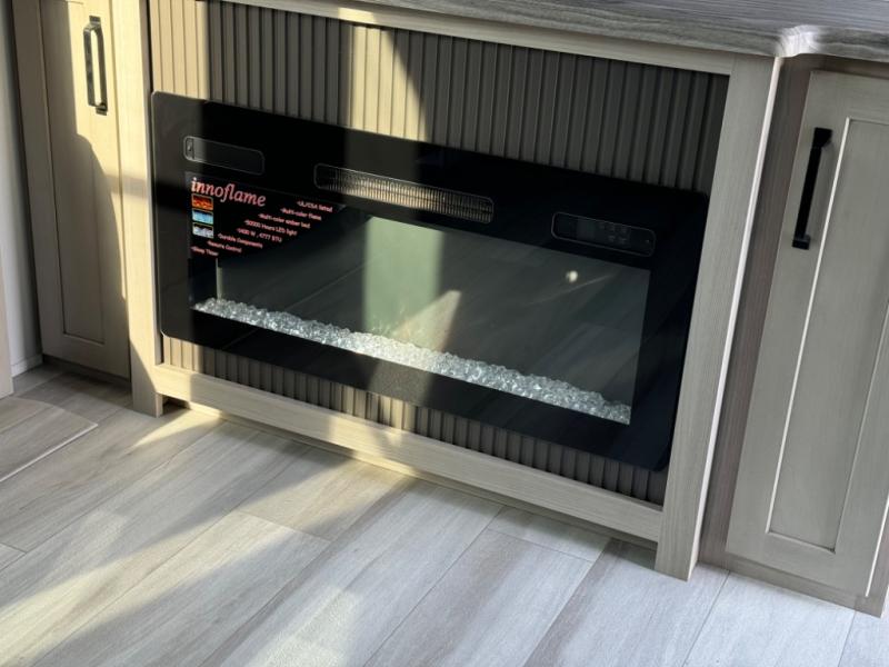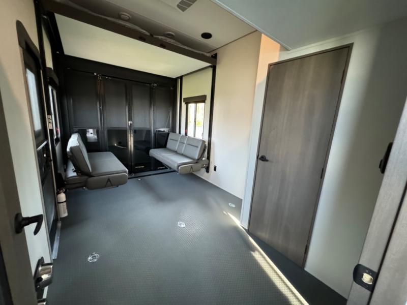 A 14' separate garage in this toy hauler offers plenty of space for your off-road toys! You will appreciate the convenience of having a full bathroom with a walk-in shower and you can even add an optional half bath to the garage area. You will also appreciate the two entry doors, and flip-up pet dish. The rear ramp door can even be converted into a patio, plus there are exterior speakers to keep the party going. Everyone will love hanging out in the separate living area with a fireplace at the entertainment center, two theater seating slides, and a third theater seating. The fully equipped kitchen has everything you need to prepare delicious home cooked meals. The front private bedroom offers an escape to rest and relax on a queen bed for the next ride!