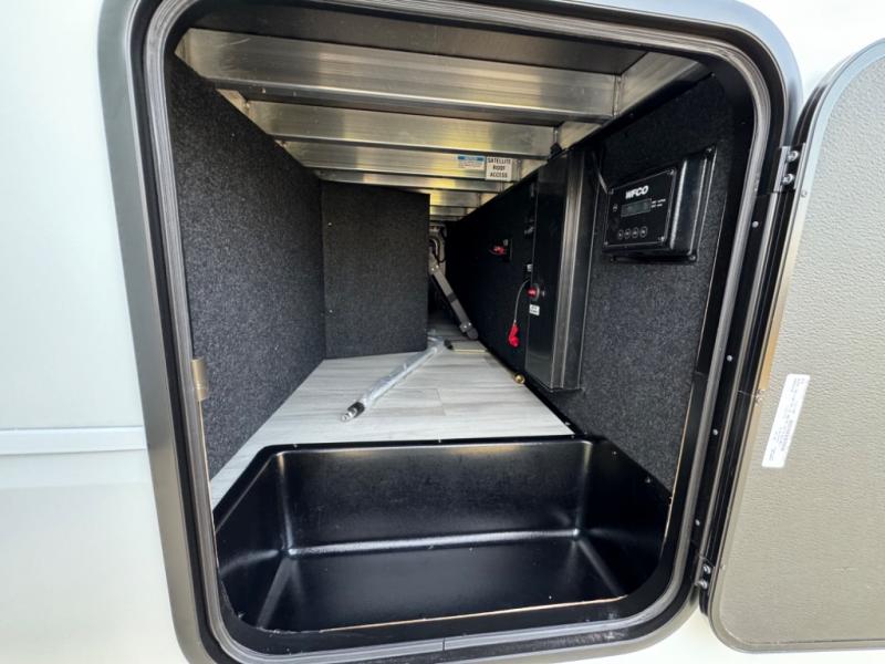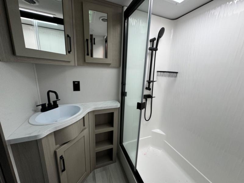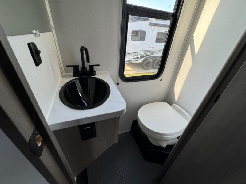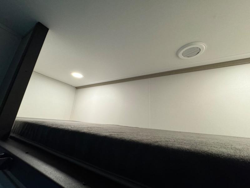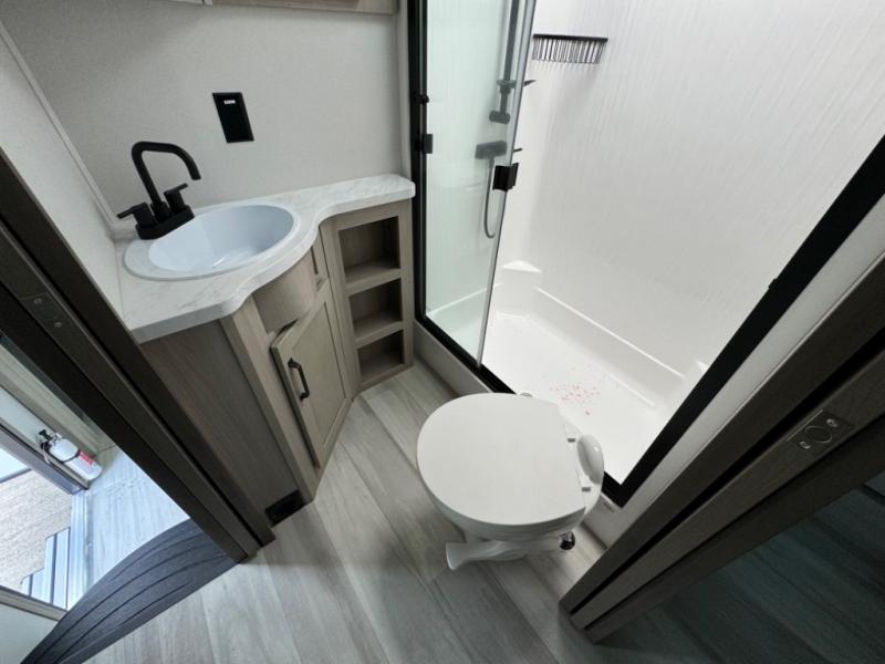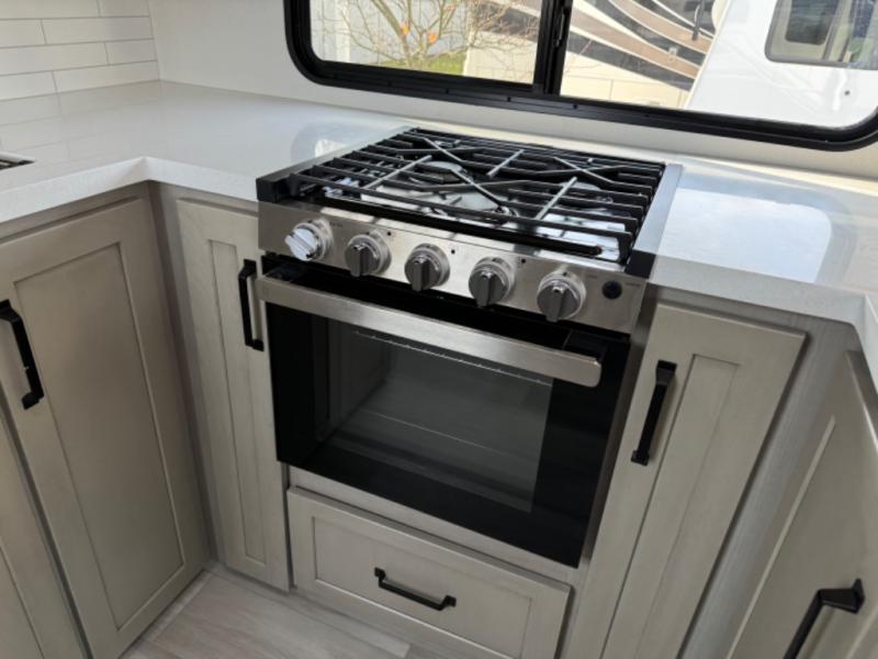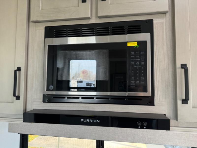 A 14' separate garage in this toy hauler offers plenty of space for your off-road toys! You will appreciate the convenience of having a full bathroom with a walk-in shower and you can even add an optional half bath to the garage area. You will also appreciate the two entry doors, and flip-up pet dish. The rear ramp door can even be converted into a patio, plus there are exterior speakers to keep the party going. Everyone will love hanging out in the separate living area with a fireplace at the entertainment center, two theater seating slides, and a third theater seating. The fully equipped kitchen has everything you need to prepare delicious home cooked meals. The front private bedroom offers an escape to rest and relax on a queen bed for the next ride!