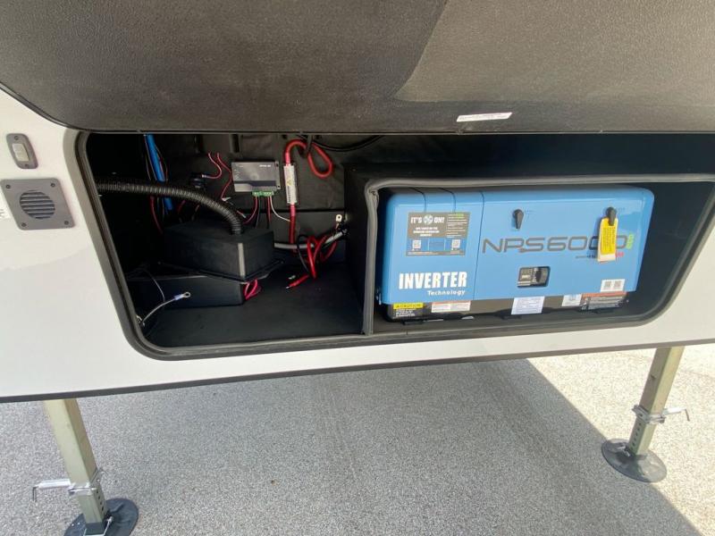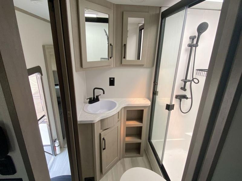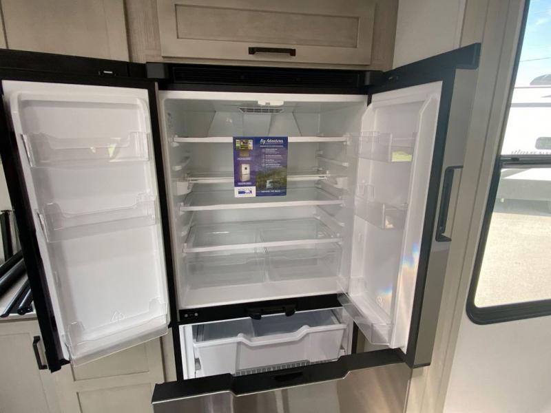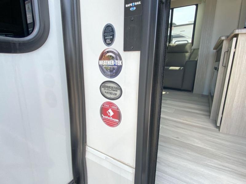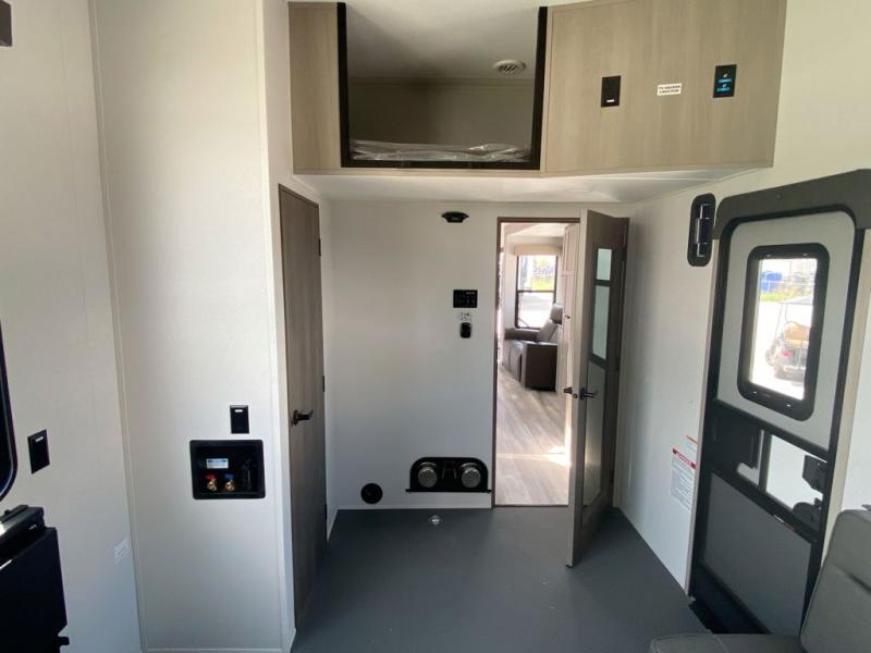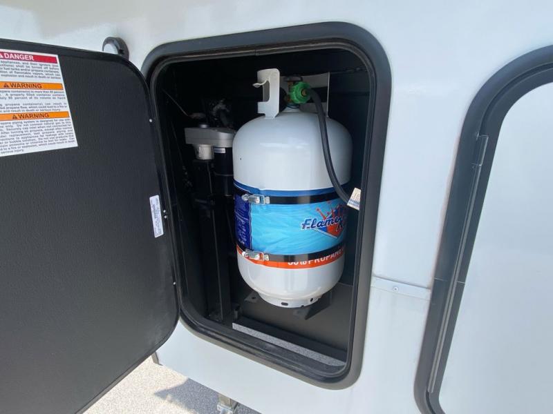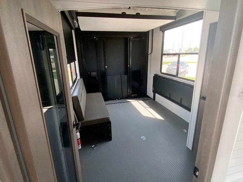 A 14' separate garage in this toy hauler offers plenty of space for your off-road toys! You will appreciate the convenience of having a full bathroom with a walk-in shower and you can even add an optional half bath to the garage area. You will also appreciate the two entry doors, and flip-up pet dish. The rear ramp door can even be converted into a patio, plus there are exterior speakers to keep the party going. Everyone will love hanging out in the separate living area with a fireplace at the entertainment center, two theater seating slides, and a third theater seating. The fully equipped kitchen has everything you need to prepare delicious home cooked meals. The front private bedroom offers an escape to rest and relax on a queen bed for the next ride!
