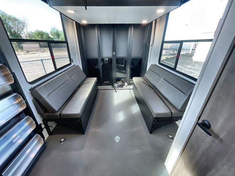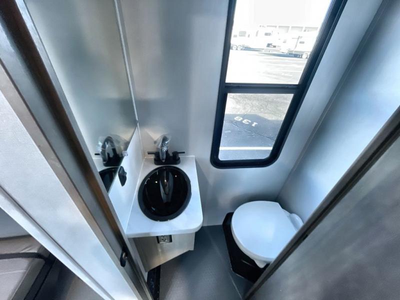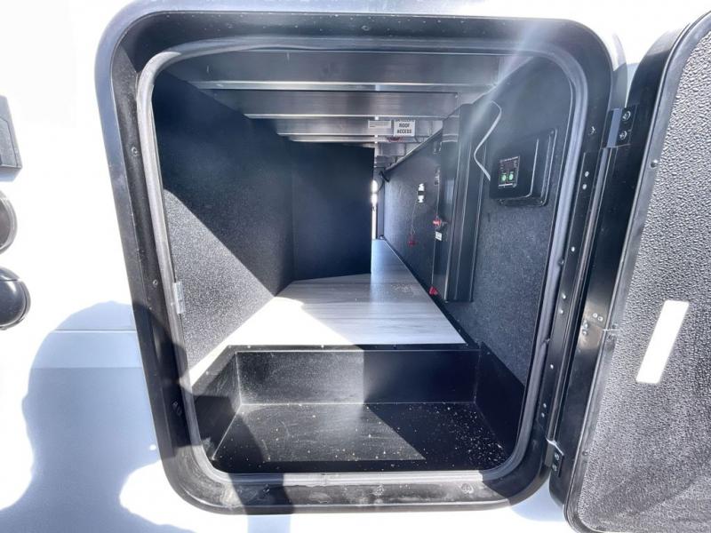 A 14' separate garage in this toy hauler offers plenty of space for your off-road toys! You will appreciate the convenience of having a full bathroom with a walk-in shower and you can even add an optional half bath to the garage area. You will also appreciate the two entry doors, and flip-up pet dish. The rear ramp door can even be converted into a patio, plus there are exterior speakers to keep the party going. Everyone will love hanging out in the separate living area with a fireplace at the entertainment center, two theater seating slides, and a third theater seating. The fully equipped kitchen has everything you need to prepare delicious home cooked meals. The front private bedroom offers an escape to rest and relax on a queen bed for the next ride!
