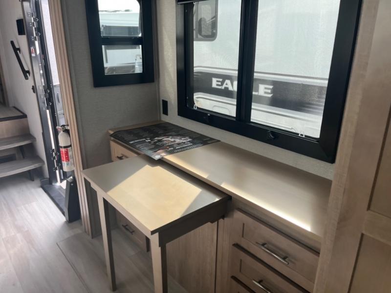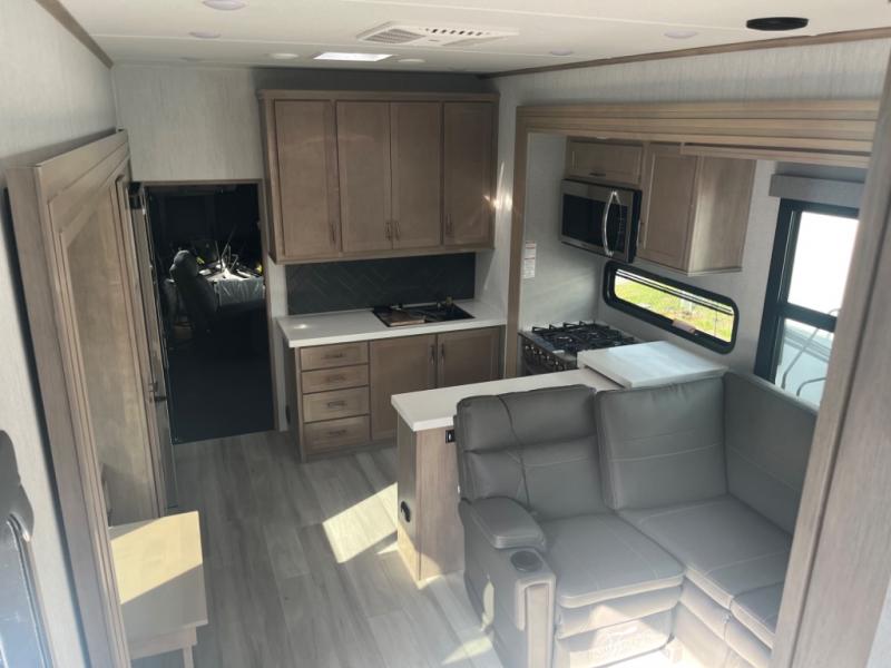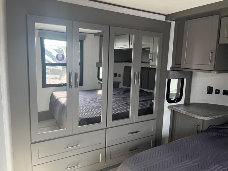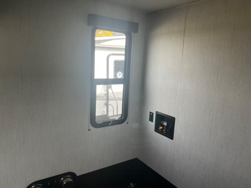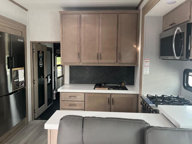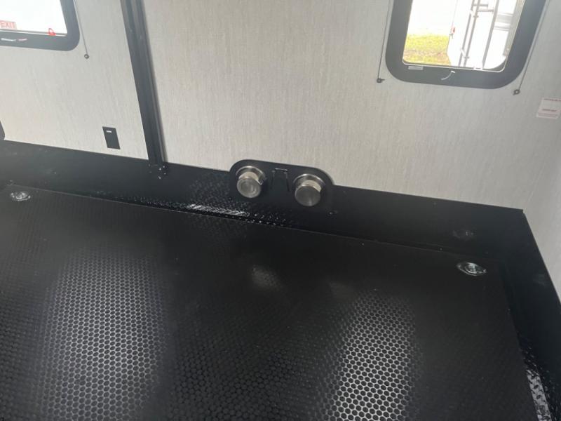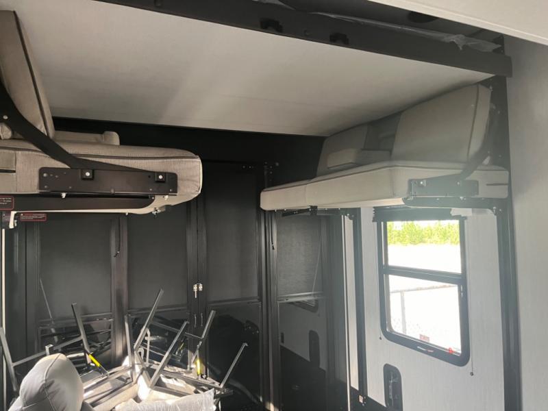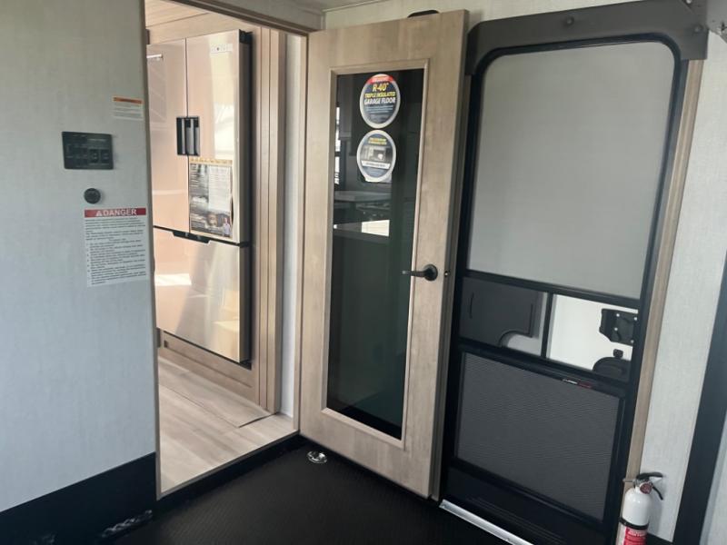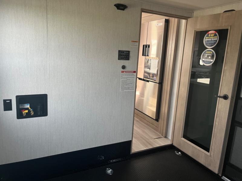 Spend your days at the campground kicking up mud with this toy hauler in tow! once you've unloaded your toys from the ramp door, you can use the 60 gallon fuel station to fill up and head out on a trail! The overhead bed provides a place for guests to sleep, and the optional Happi-Jac rollover sofas and a table with a top bed will give you the option to add even more seating and sleeping space. There is even an optional half bath here if you choose to make this space more accommodating. Head to the middle kitchen and living area where you'll enjoy generous counter space to prep meals, a spacious 20 cu. ft. refrigerator, an L-shaped sofa, plus a hybrid desk/dinette that will serve as a dining or working space. The dual entry bath creates a front master bedroom you are sure to love. There is a queen bed with an optional king bed, plenty of overhead storage, and a wardrobe slide to keep your things organized.