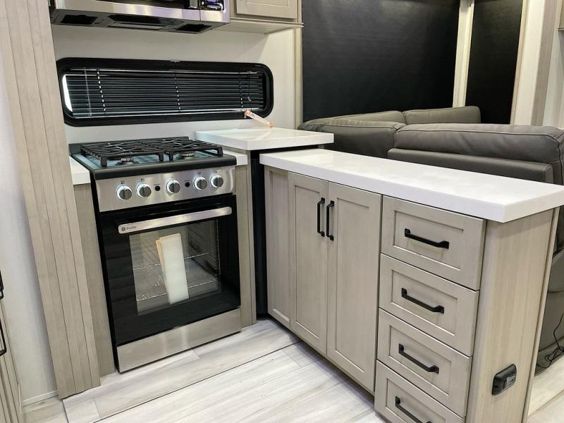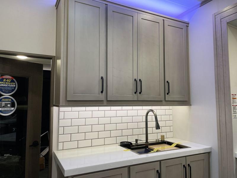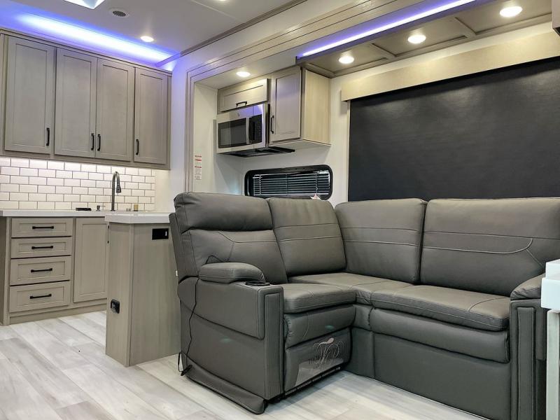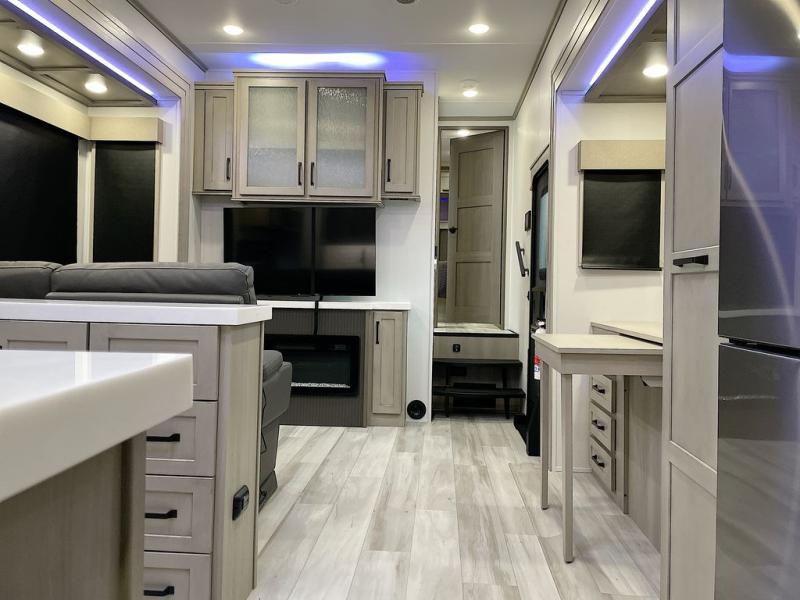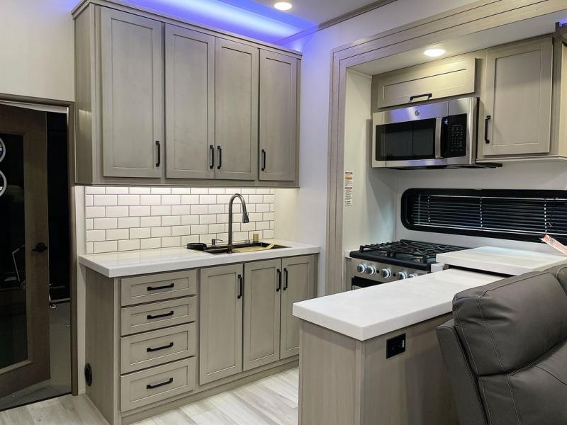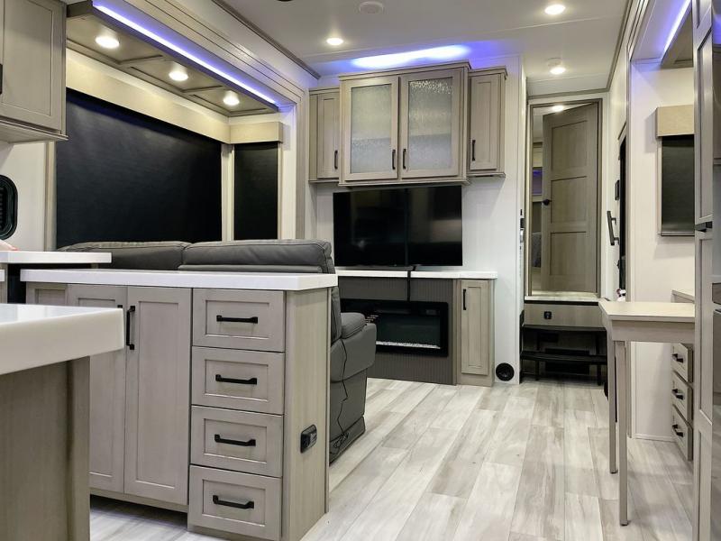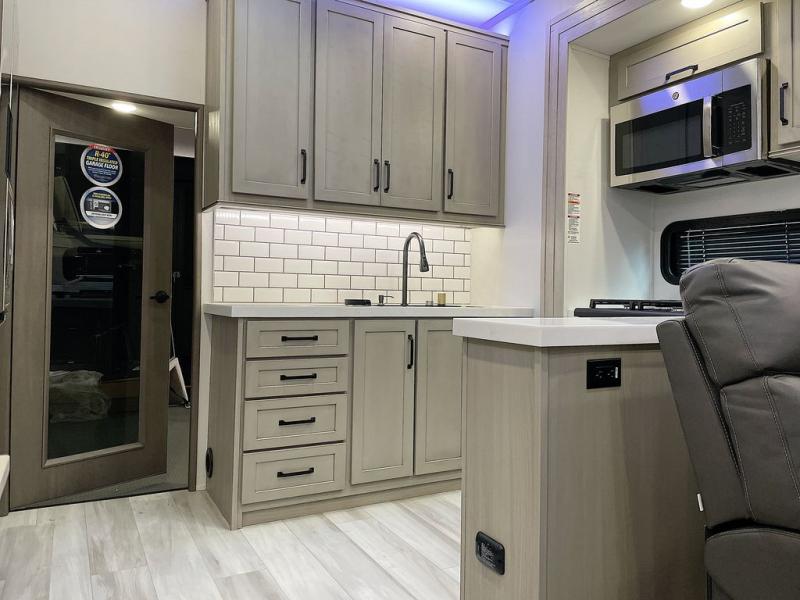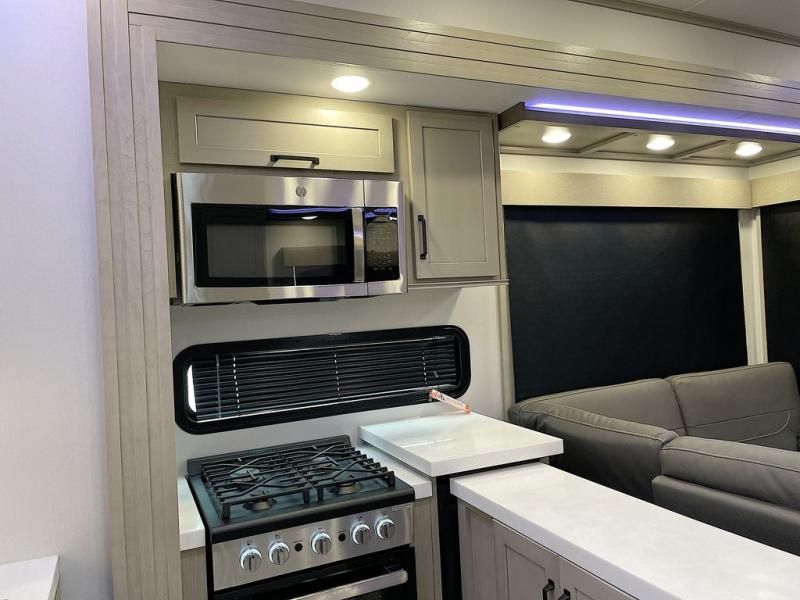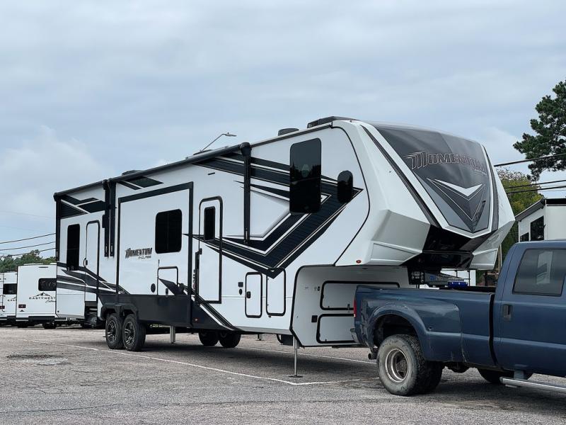 With any Momentum M-Class toy hauler by Grand Design, you will enjoy luxury at every turn! They have been constructed to a superior standard with a thermal roof design, triple insulated main floor and garage floor, and a Rail-Tite underbelly seal that will allow you to camp in all elements. Each model also features an 8' 5" wide body chassis with a wide rail design, no wheel wheels, and a dovetail entry for easier loading. The Stealth A/C system provides maximum cooling power, and the CRE3000 suspension system means you can enjoy a smooth tow each time. You will love the luxurious interior with a professional grade stainless steel cooktop, interior color changing LED accent lighting, a fiberglass shower with a glass door, and solid surface countertops.