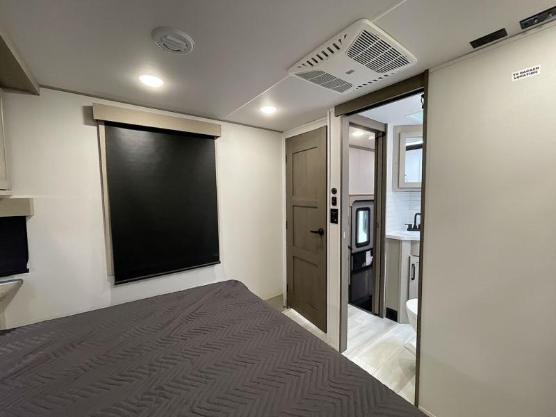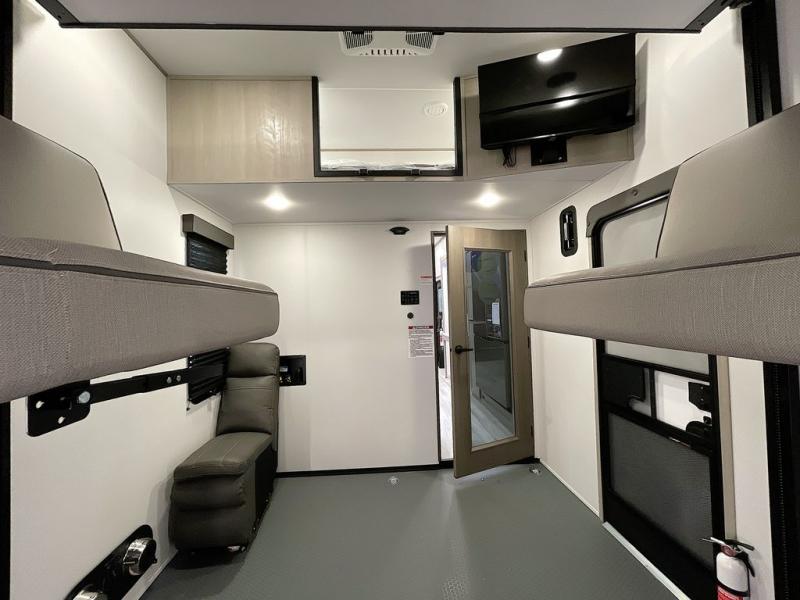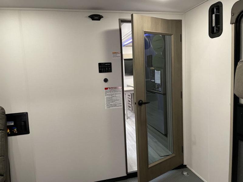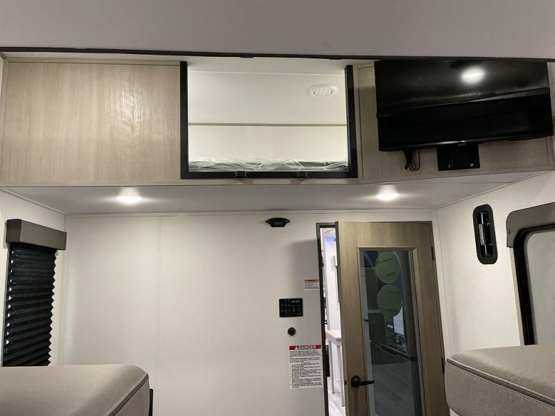 Spend your days at the campground kicking up mud with this toy hauler in tow! once you've unloaded your toys from the ramp door, you can use the 60 gallon fuel station to fill up and head out on a trail! The overhead bed provides a place for guests to sleep, and the optional Happi-Jac rollover sofas and a table with a top bed will give you the option to add even more seating and sleeping space. There is even an optional half bath here if you choose to make this space more accommodating. Head to the middle kitchen and living area where you'll enjoy generous counter space to prep meals, a spacious 20 cu. ft. refrigerator, an L-shaped sofa, plus a hybrid desk/dinette that will serve as a dining or working space. The dual entry bath creates a front master bedroom you are sure to love. There is a queen bed with an optional king bed, plenty of overhead storage, and a wardrobe slide to keep your things organized.