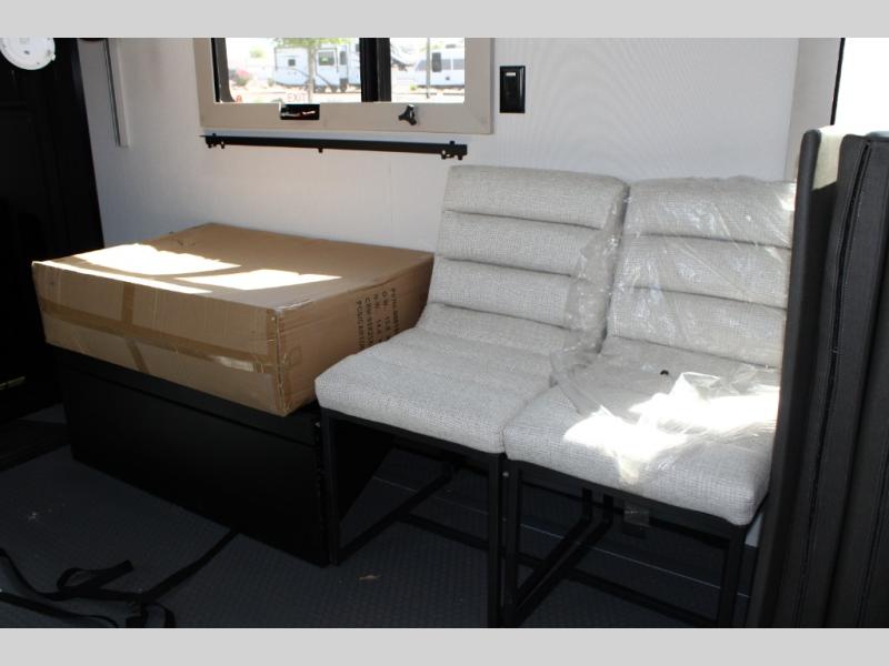 - Hybrid Desk/Dinette Area – This versatile space doubles as a workstation or dining area, perfect for those who need to stay connected on the road while enjoying mealtime convenience.