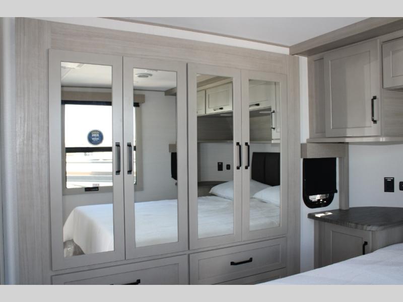 - Front Master Bedroom with Dual Entry Bath – Enjoy a private retreat featuring a queen bed with an optional king upgrade, overhead storage, and a wardrobe slide for extra space. The dual entry bathroom makes access easy from either the hallway or bedroom.