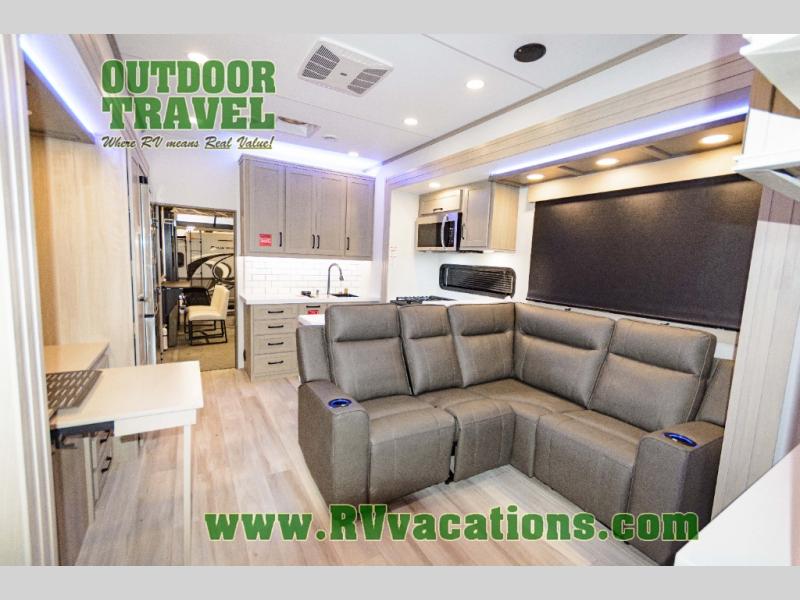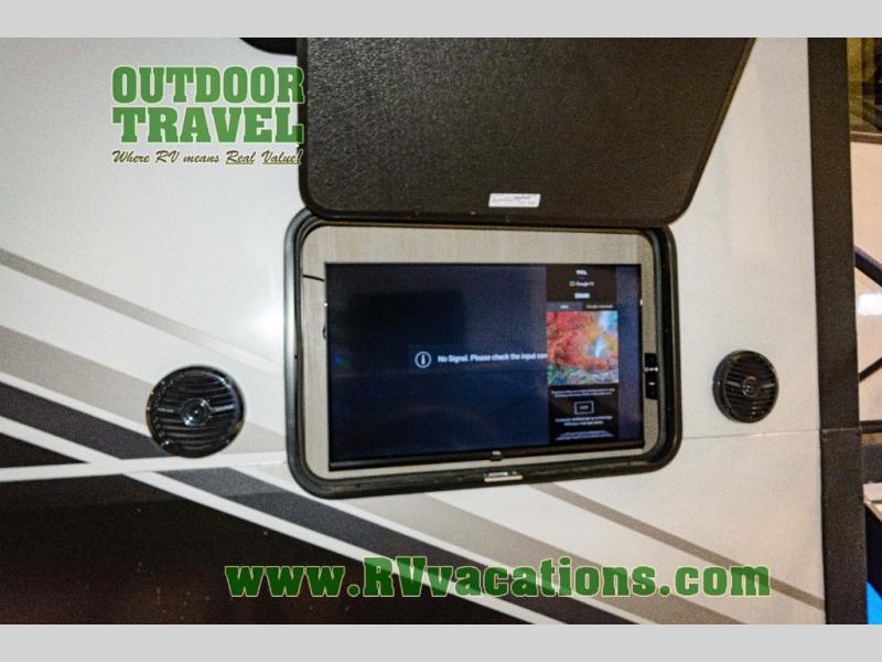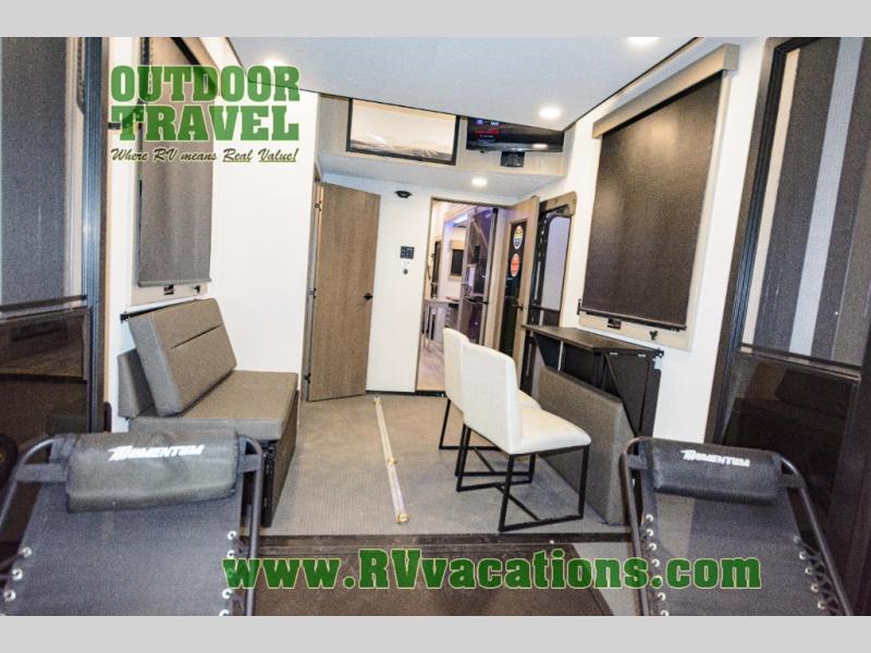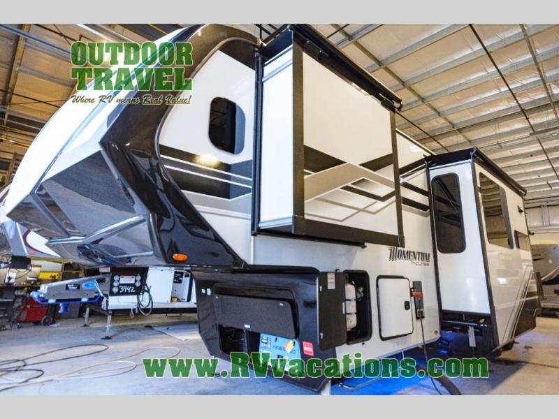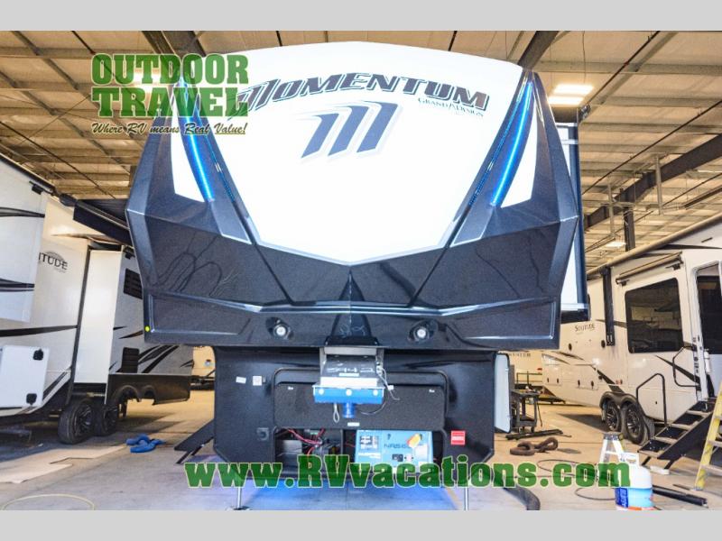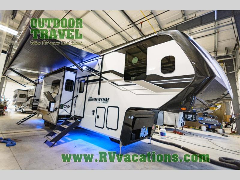 With any Momentum M-Class toy hauler by Grand Design, you will enjoy luxury at every turn! They have been constructed to a superior standard with a thermal roof design, triple insulated main floor and garage floor, and a Rail-Tite underbelly seal that will allow you to camp in all elements. Each model also features an 8' 5" wide body chassis with a wide rail design, no wheel wheels, and a dovetail entry for easier loading. The Stealth A/C system provides maximum cooling power, and the CRE3000 suspension system means you can enjoy a smooth tow each time. You will love the luxurious interior with a professional grade stainless steel cooktop, interior color changing LED accent lighting, a fiberglass shower with a glass door, and solid surface countertops.