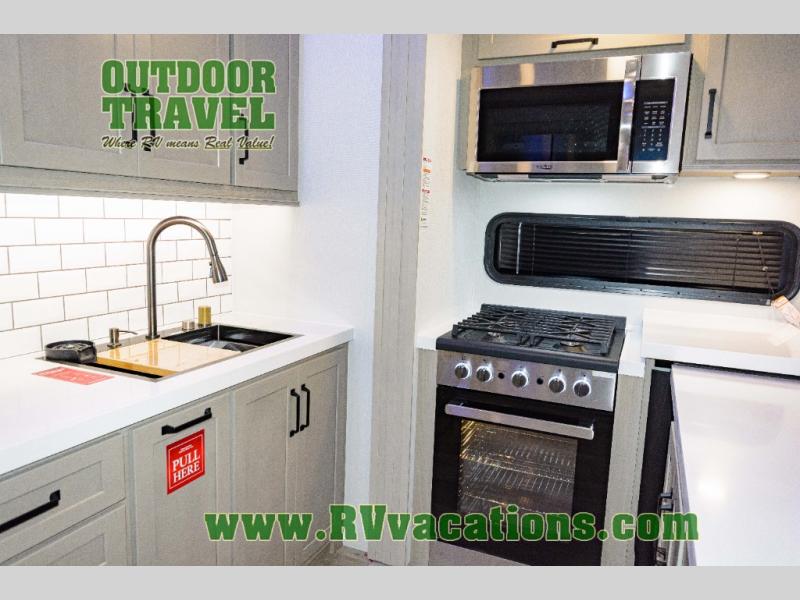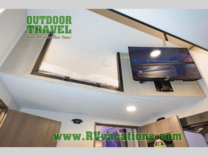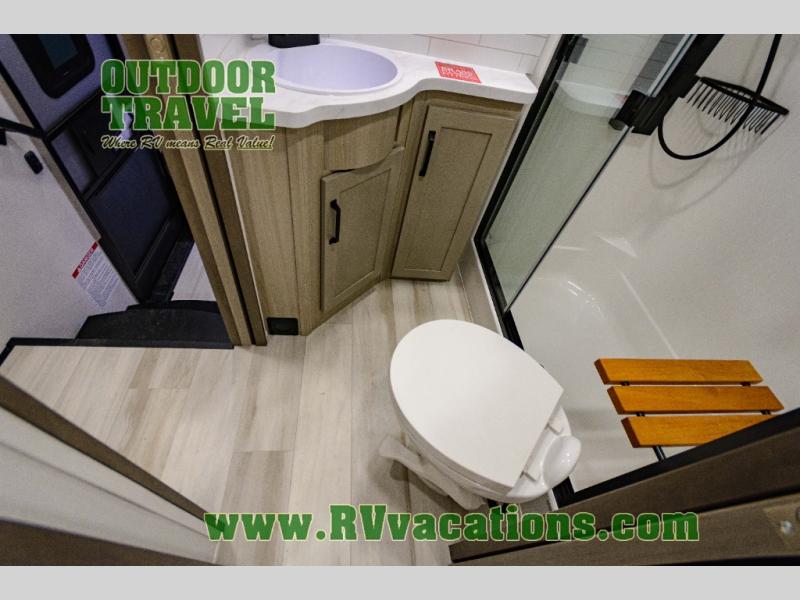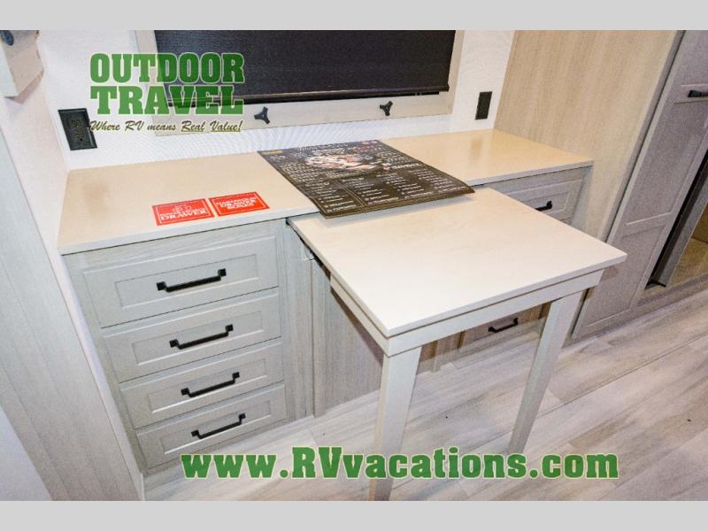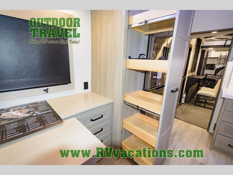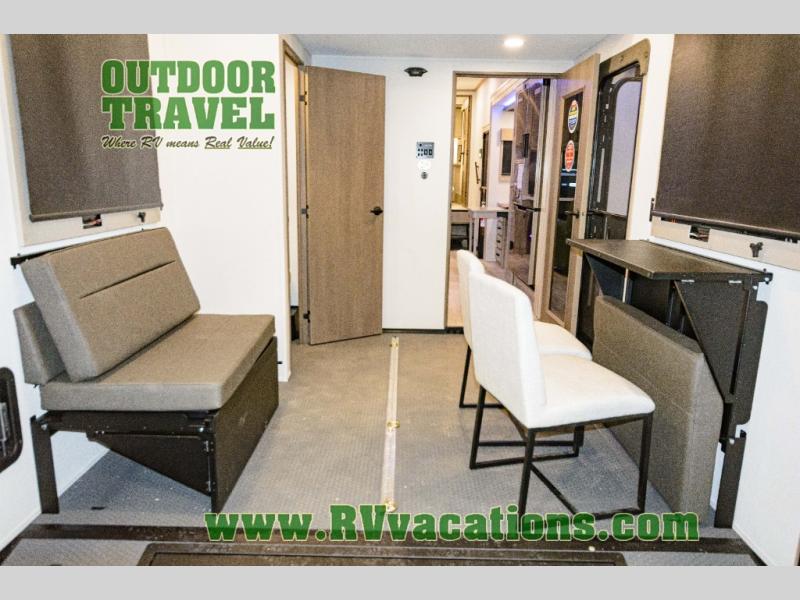 Spend your days at the campground kicking up mud with this toy hauler in tow! once you've unloaded your toys from the ramp door, you can use the 60 gallon fuel station to fill up and head out on a trail! The overhead bed provides a place for guests to sleep, and there is an optional Liftsuite System for more sleeping space if needed. There is even an optional half bath here if you choose to make this space more accommodating. Head to the middle kitchen and living area where you'll enjoy generous counter space to prep meals, a spacious 20 cu. ft. refrigerator, an L-shaped sofa with recline, plus a hybrid desk/dinette that will serve as a dining or working space. The dual entry bath creates a front master bedroom you are sure to love. There is a queen bed with an optional king bed, plenty of overhead storage, and a wardrobe slide to keep your things organized.