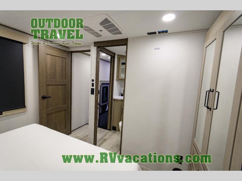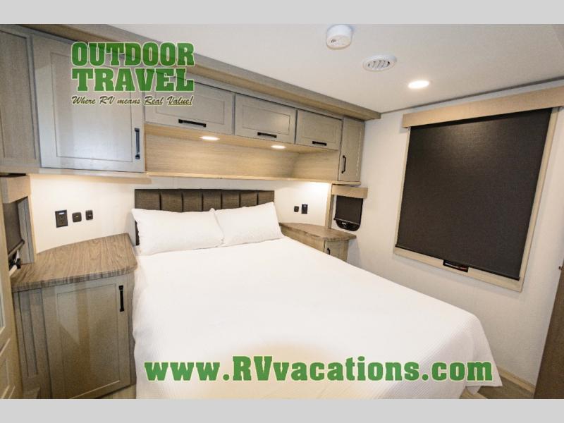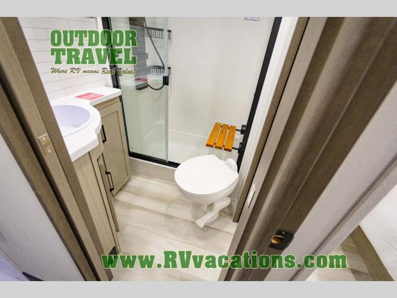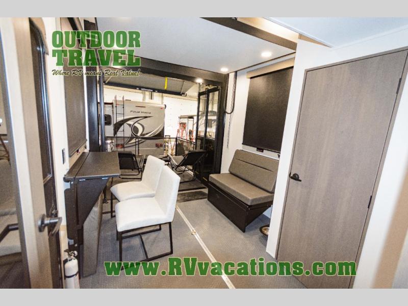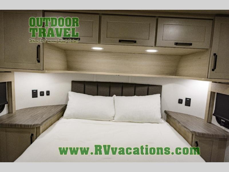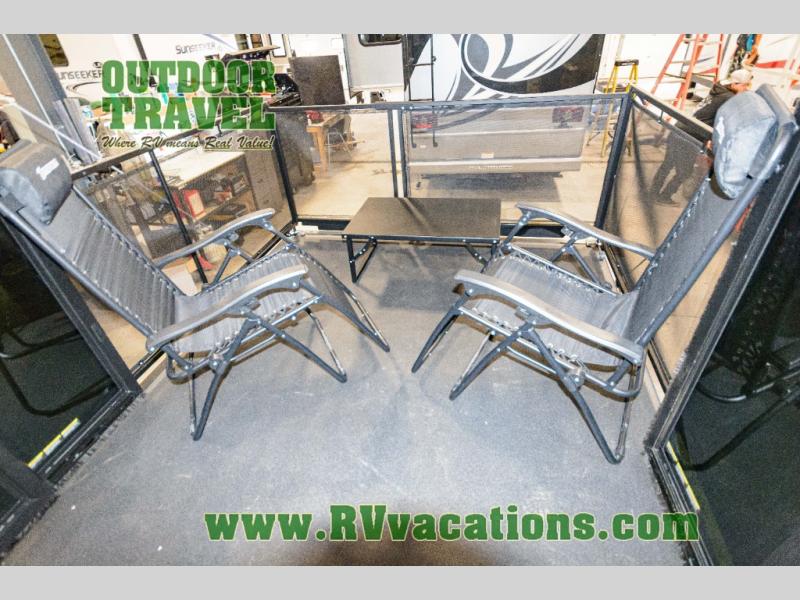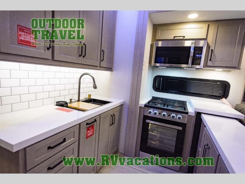 Spend your days at the campground kicking up mud with this toy hauler in tow! once you've unloaded your toys from the ramp door, you can use the 60 gallon fuel station to fill up and head out on a trail! The overhead bed provides a place for guests to sleep, and there is an optional Liftsuite System for more sleeping space if needed. There is even an optional half bath here if you choose to make this space more accommodating. Head to the middle kitchen and living area where you'll enjoy generous counter space to prep meals, a spacious 20 cu. ft. refrigerator, an L-shaped sofa with recline, plus a hybrid desk/dinette that will serve as a dining or working space. The dual entry bath creates a front master bedroom you are sure to love. There is a queen bed with an optional king bed, plenty of overhead storage, and a wardrobe slide to keep your things organized.
