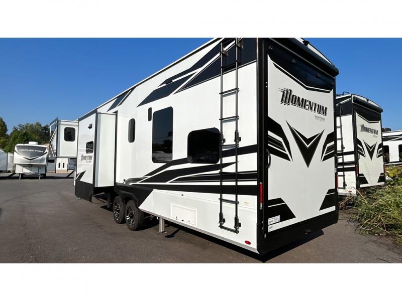 With any Momentum M-Class toy hauler by Grand Design, you will enjoy luxury at every turn! They have been constructed to a superior standard with a thermal roof design, triple insulated main floor and garage floor, and a Rail-Tite underbelly seal that will allow you to camp in all elements. Each model also features an 8' 5" wide body chassis with a wide rail design, no wheel wheels, and a dovetail entry for easier loading. The Stealth A/C system provides maximum cooling power, and the CRE3000 suspension system means you can enjoy a smooth tow each time. You will love the luxurious interior with a professional grade stainless steel cooktop, interior color changing LED accent lighting, a fiberglass shower with a glass door, and solid surface countertops.