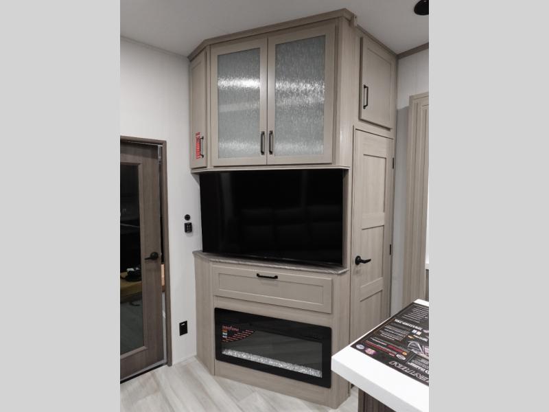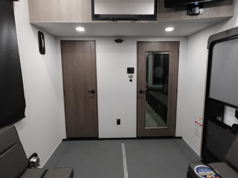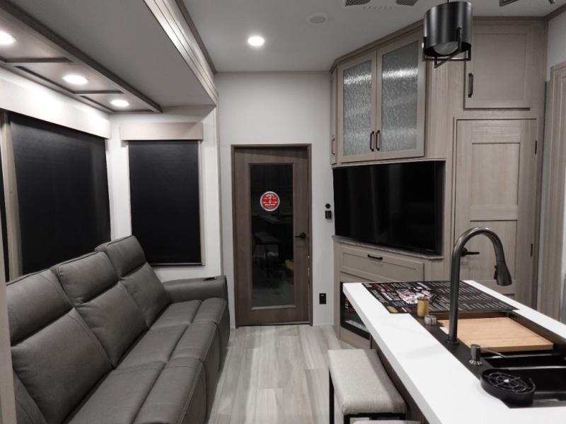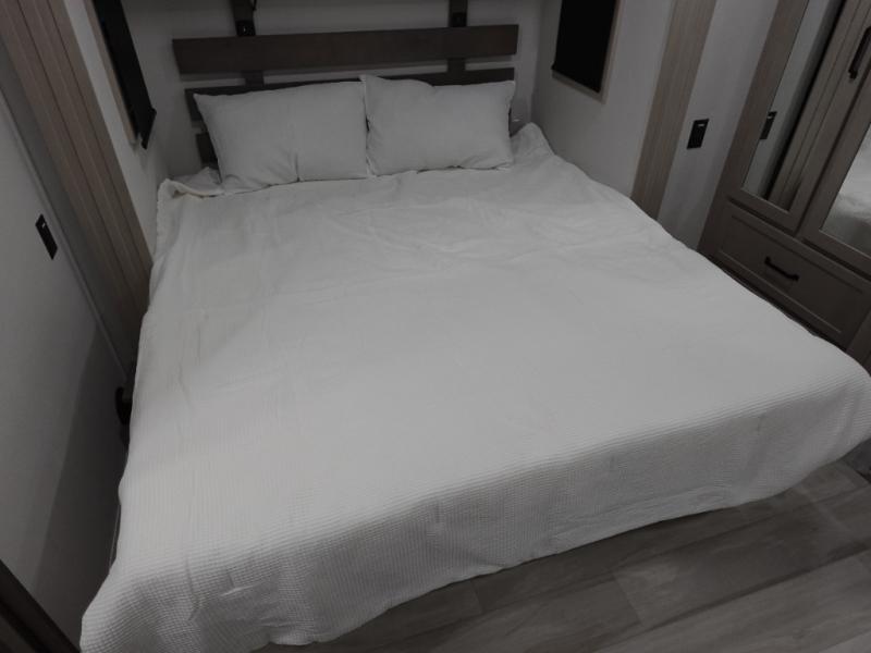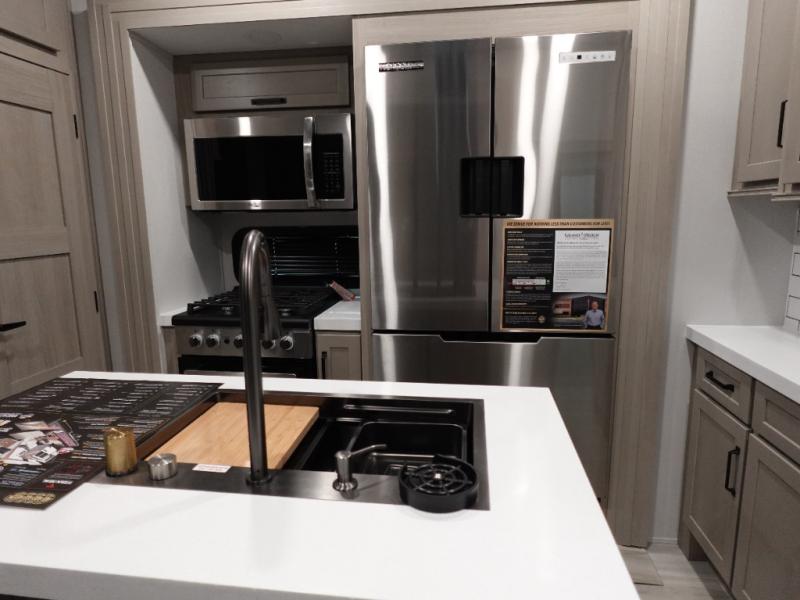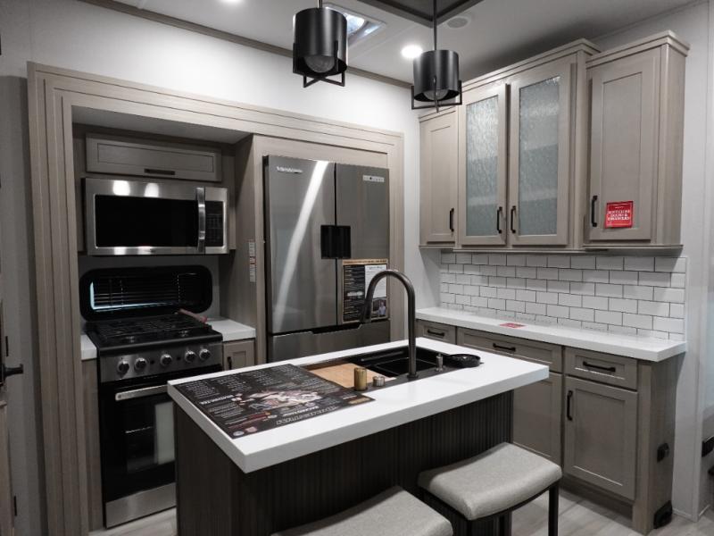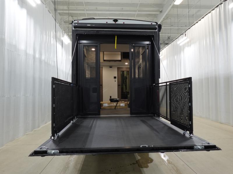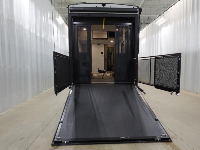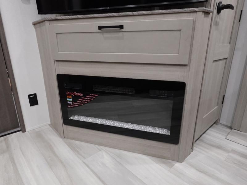 Traveling with friends and family can be comfortable when you have a full double entry bathroom and a half bath available when camping and enjoying the trails on your off-road toys! You will have an 11' garage space that can become a second living/dining area. An overhead bed comes standard, along with a super sofa in the main living area where guests can sleep. Everyone can watch the LED TV when waiting for dinner, and enjoy the fireplace on those chiller nights. The kitchen island offers a sink to wash dishes, extra counter space for serving meals and two stools to dine at. The cook will love all the upgraded appliances, and the space thanks to the slide. The front bedroom gives you a king bed slide, lots of clothing space, and a slide top dresser for even more storage.