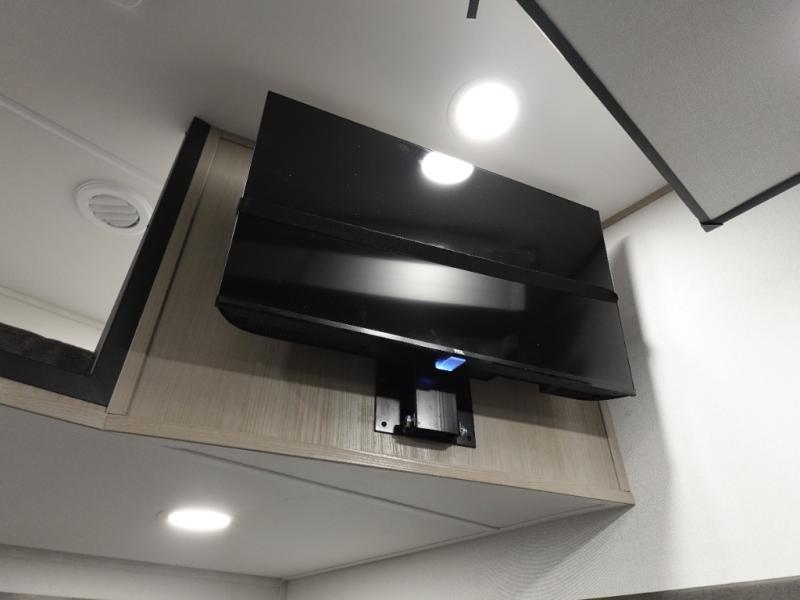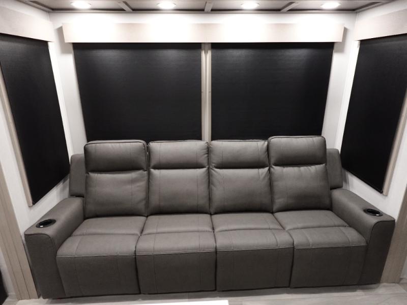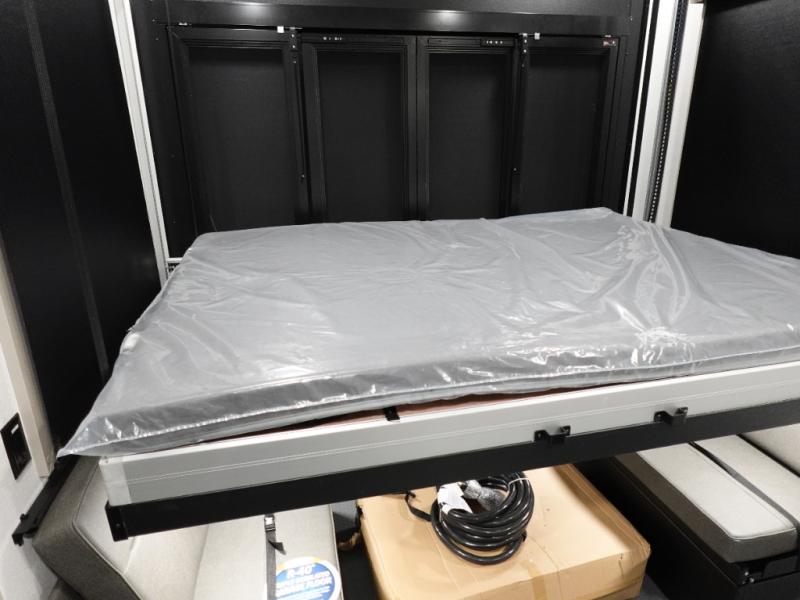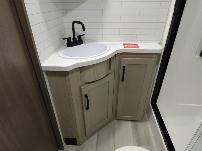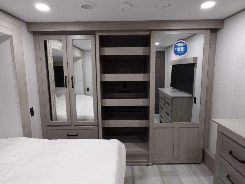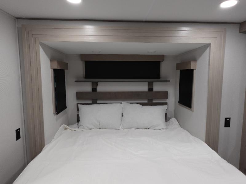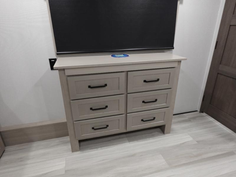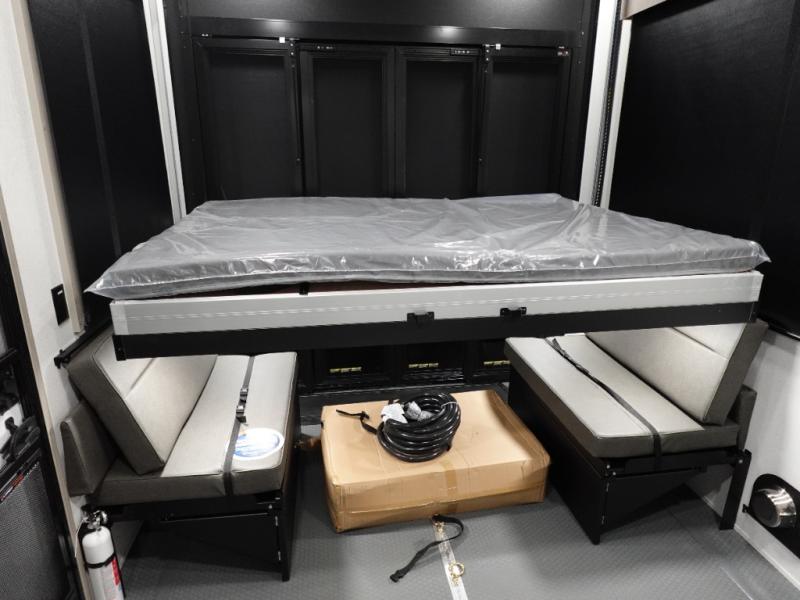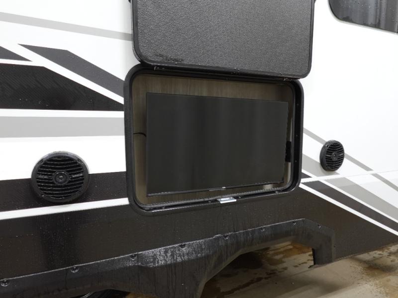Traveling with friends and family can be comfortable when you have a full double entry bathroom and a half bath available when camping and enjoying the trails on your off-road toys! You will have an 11' garage space that can become a second living/dining area. An overhead bed comes standard, along with a super sofa in the main living area where guests can sleep. Everyone can watch the LED TV when waiting for dinner, and enjoy the fireplace on those chiller nights. The kitchen island offers a sink to wash dishes, extra counter space for serving meals and two stools to dine at. The cook will love all the upgraded appliances, and the space thanks to the slide. The front bedroom gives you a king bed slide, lots of clothing space, and a slide top dresser for even more storage.