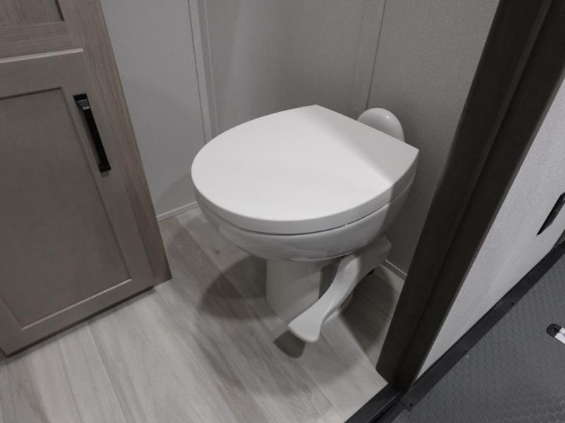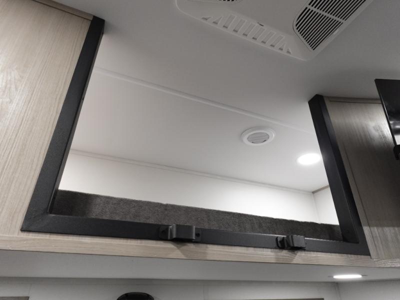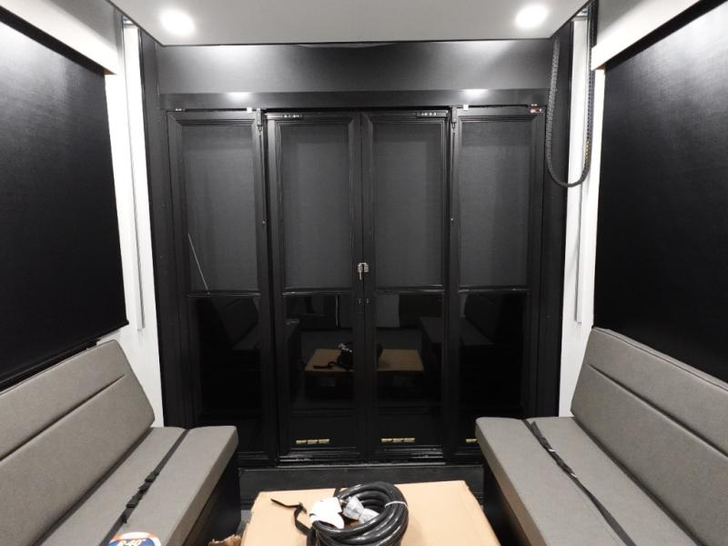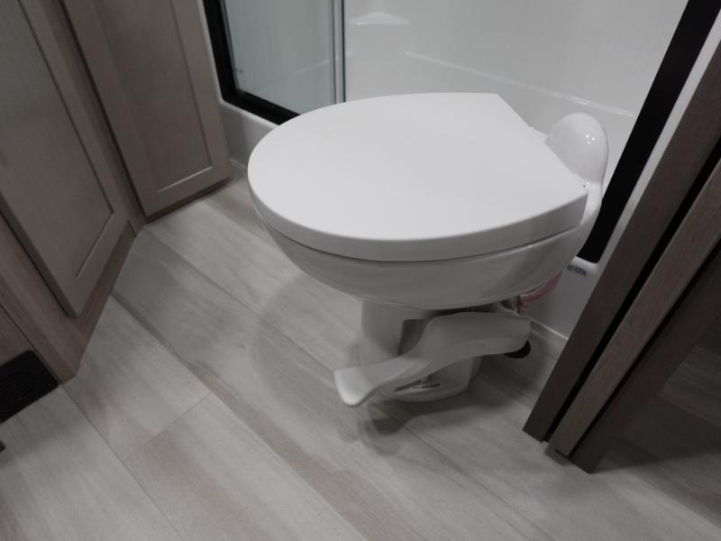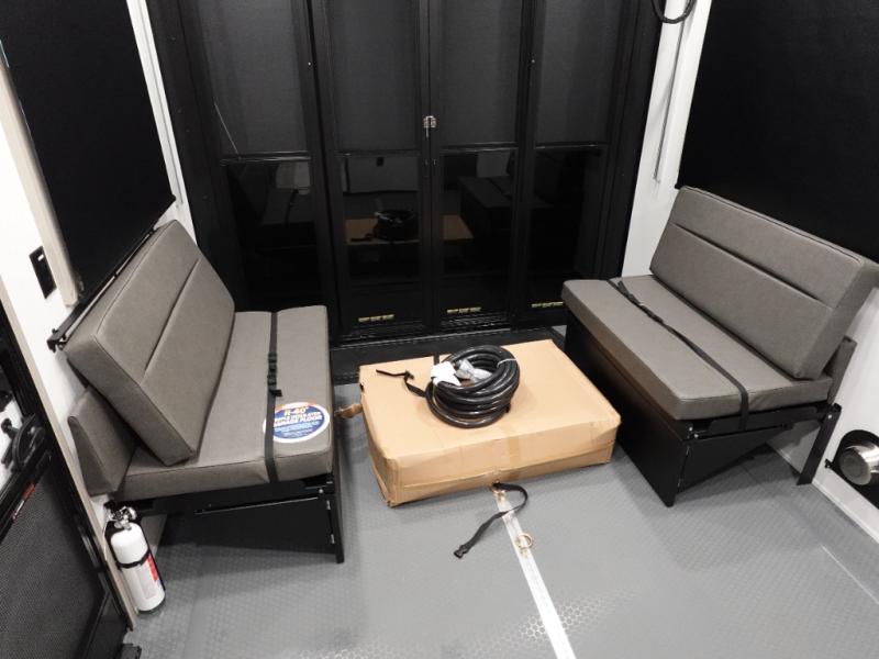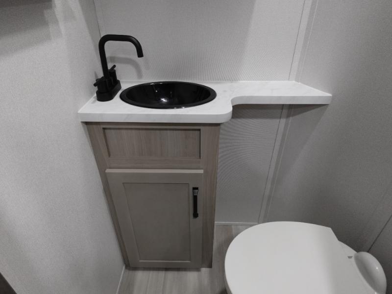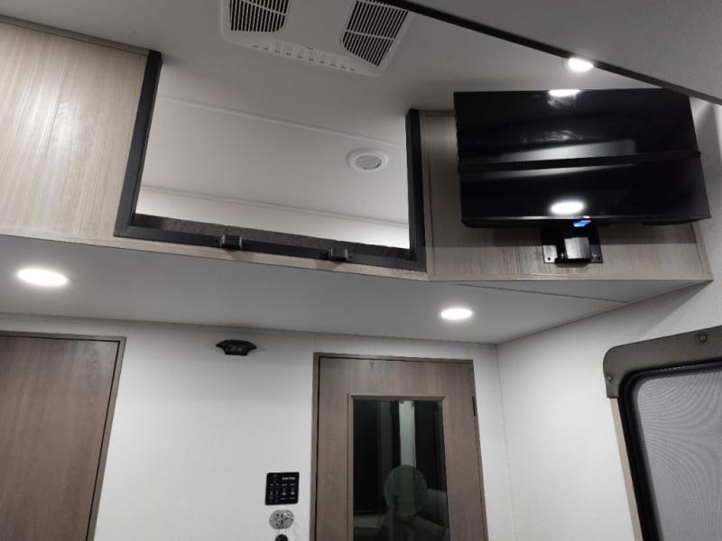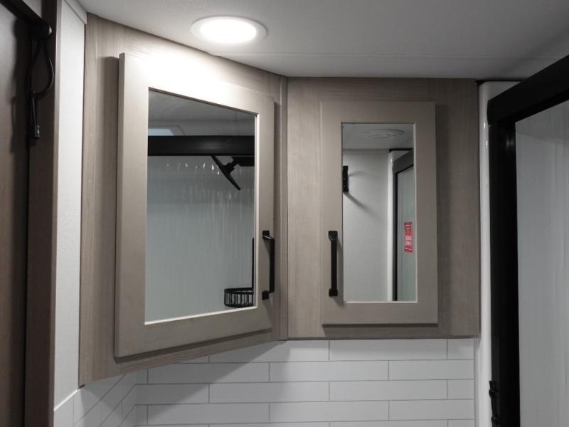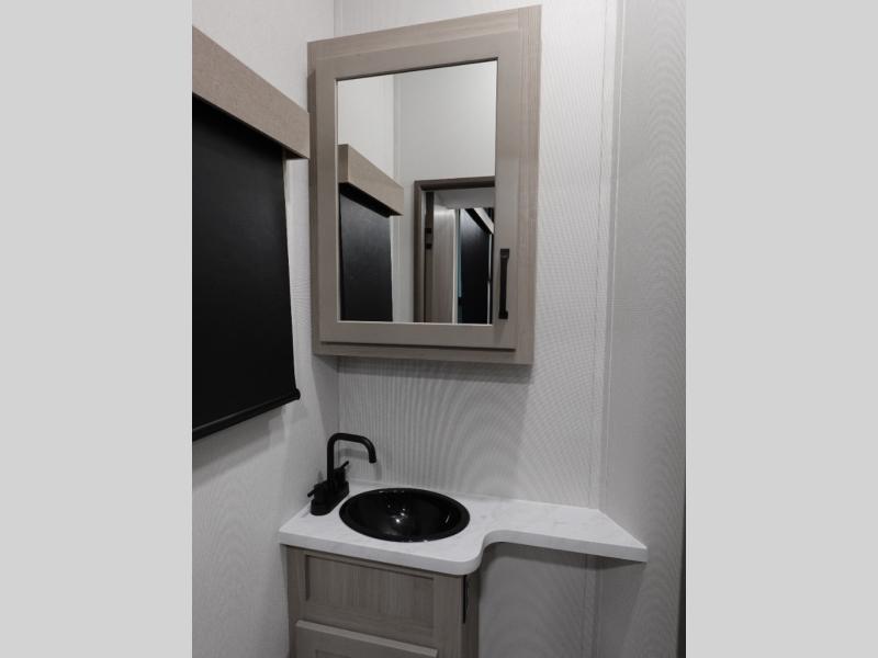 Traveling with friends and family can be comfortable when you have a full double entry bathroom and a half bath available when camping and enjoying the trails on your off-road toys! You will have an 11' garage space that can become a second living/dining area. An overhead bed comes standard, along with a super sofa in the main living area where guests can sleep. Everyone can watch the LED TV when waiting for dinner, and enjoy the fireplace on those chiller nights. The kitchen island offers a sink to wash dishes, extra counter space for serving meals and two stools to dine at. The cook will love all the upgraded appliances, and the space thanks to the slide. The front bedroom gives you a king bed slide, lots of clothing space, and a slide top dresser for even more storage.