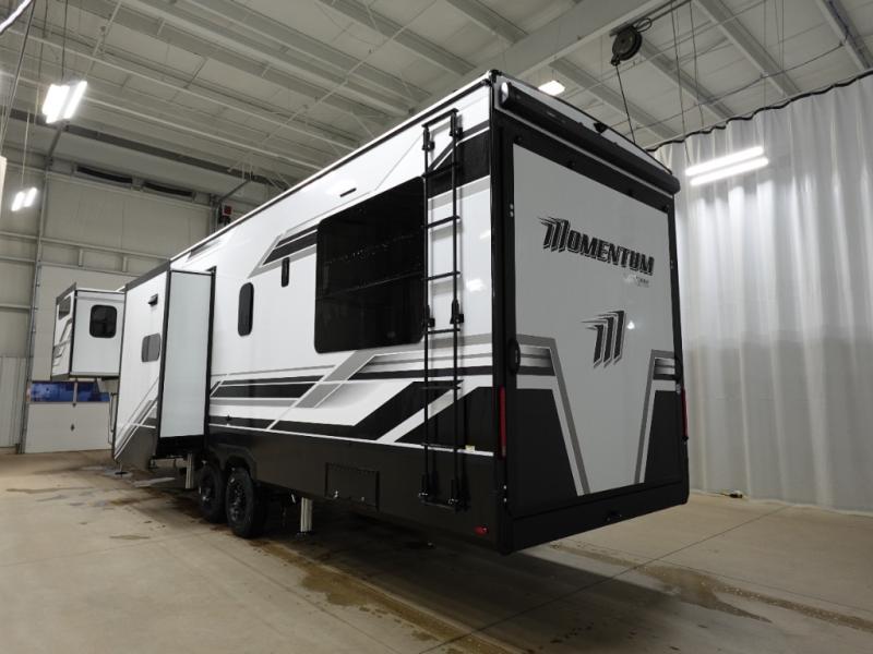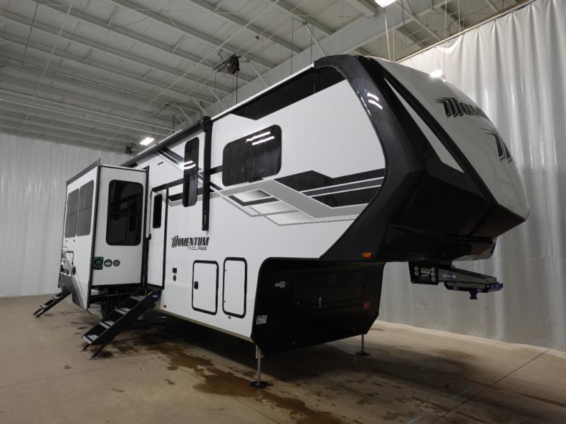 With any Momentum M-Class toy hauler by Grand Design, you will enjoy luxury at every turn! They have been constructed to a superior standard with a thermal roof design, triple insulated main floor and garage floor, and a Rail-Tite underbelly seal that will allow you to camp in all elements. Each model also features an 8' 5" wide body chassis with a wide rail design, no wheel wheels, and a dovetail entry for easier loading. The Stealth A/C system provides maximum cooling power, and the CRE3000 suspension system means you can enjoy a smooth tow each time. You will love the luxurious interior with a professional grade stainless steel cooktop, interior color changing LED accent lighting, a fiberglass shower with a glass door, and solid surface countertops.