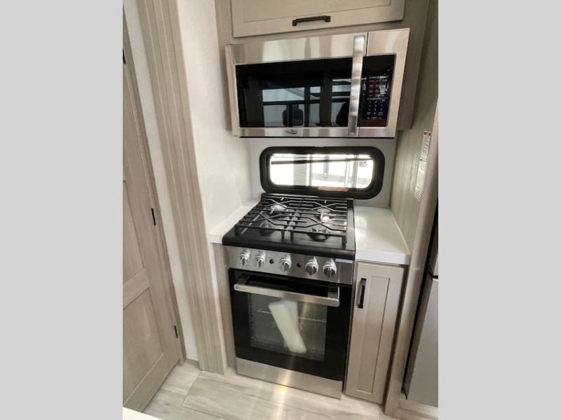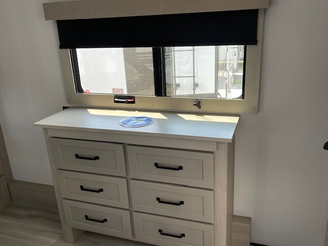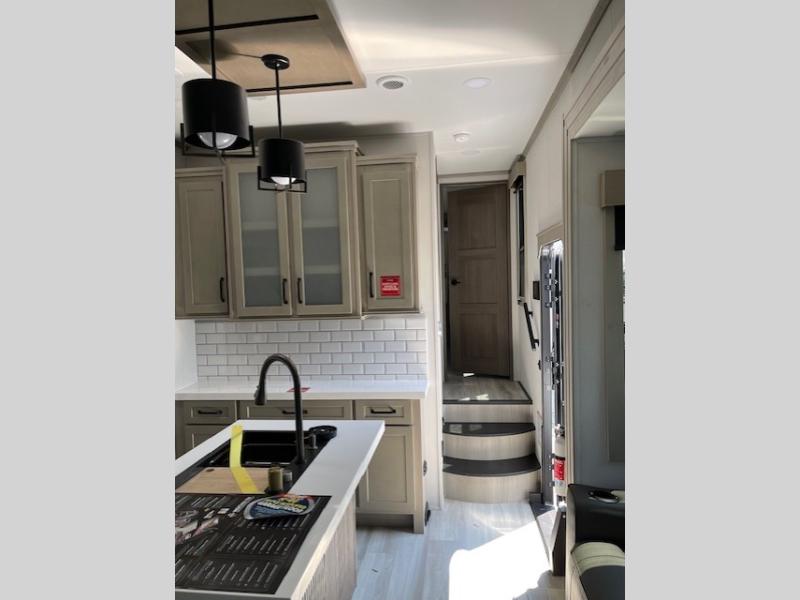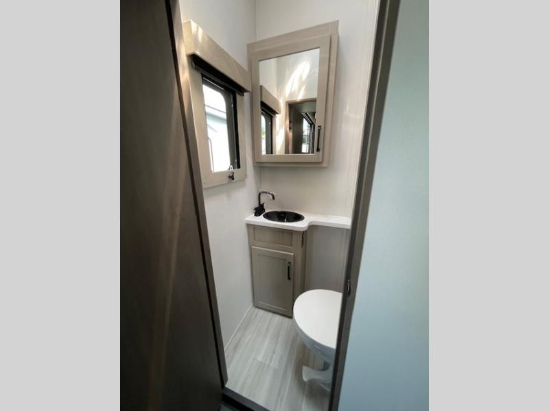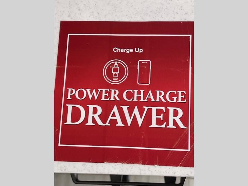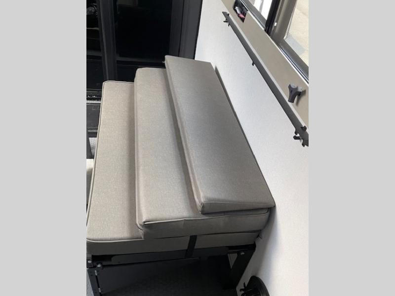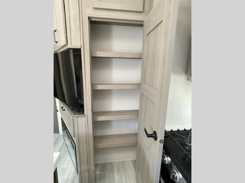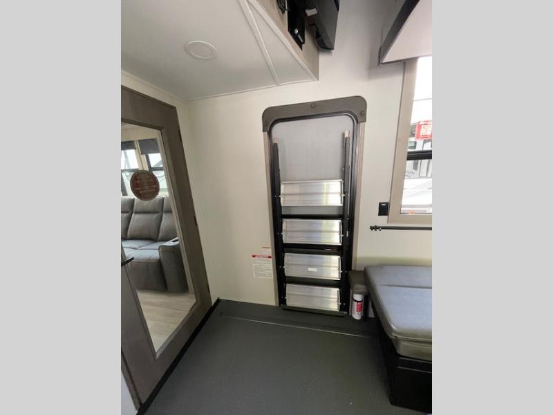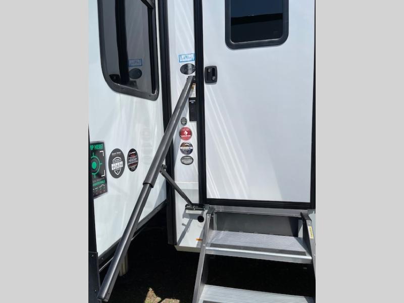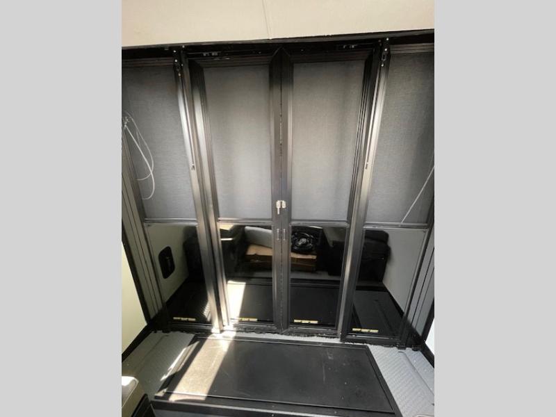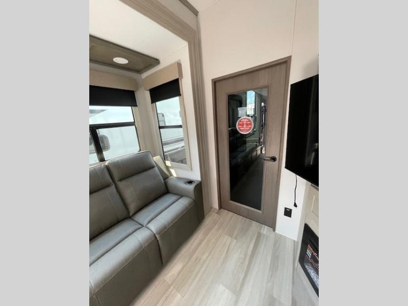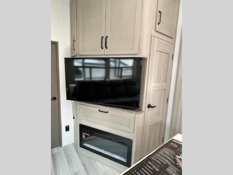 Traveling with friends and family can be comfortable when you have a full double entry bathroom and a half bath available when camping and enjoying the trails on your off-road toys! You will have an 11' garage space that can become a second living/dining area, and you can add the optional Liftsuite System for more sleeping space. An overhead bed comes standard, along with a super sofa in the main living area where guests can sleep. Everyone can watch the LED TV when waiting for dinner, and enjoy the fireplace on those chiller nights. The kitchen island offers a sink to wash dishes, extra counter space for serving meals and two stools to dine at. The cook will love all the upgraded appliances, and the space thanks to the slide. The front bedroom gives you a queen bed slide with a king bed option, lots of clothing space, and a slide top dresser for even more storage.