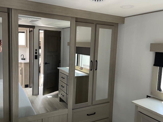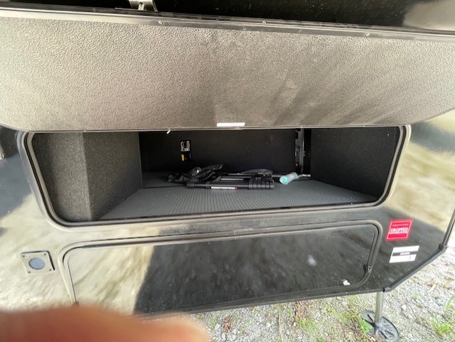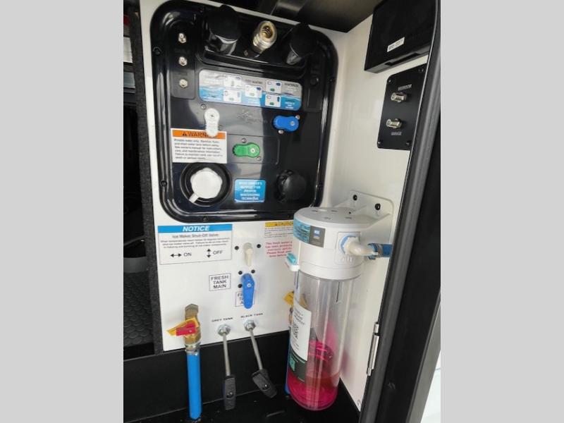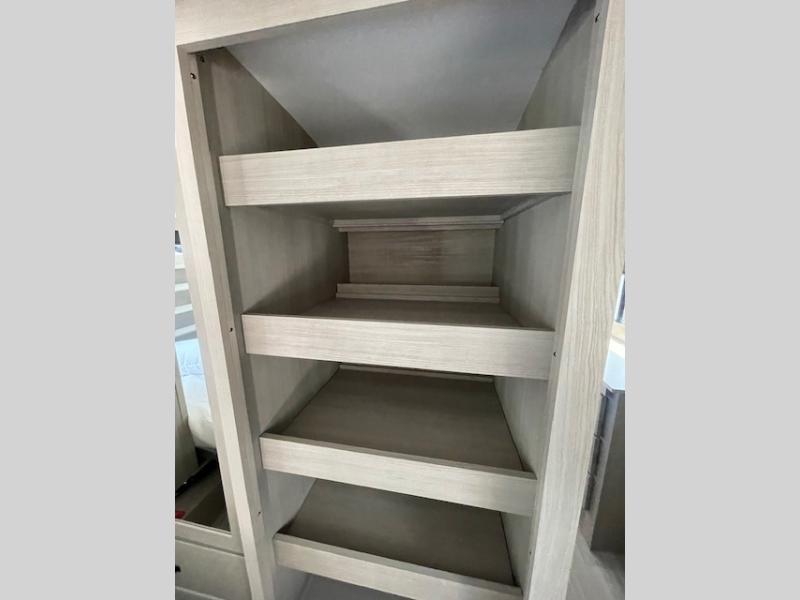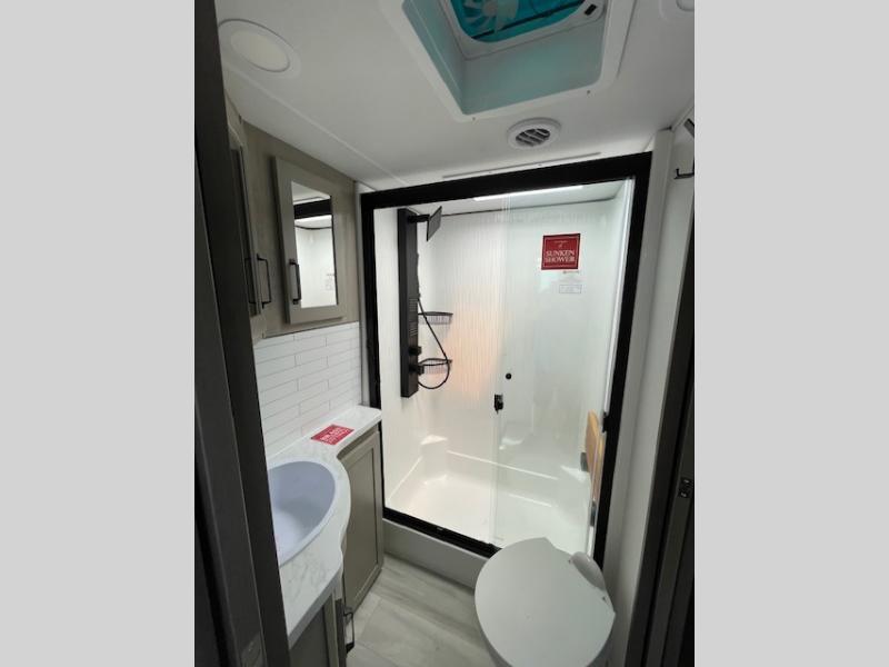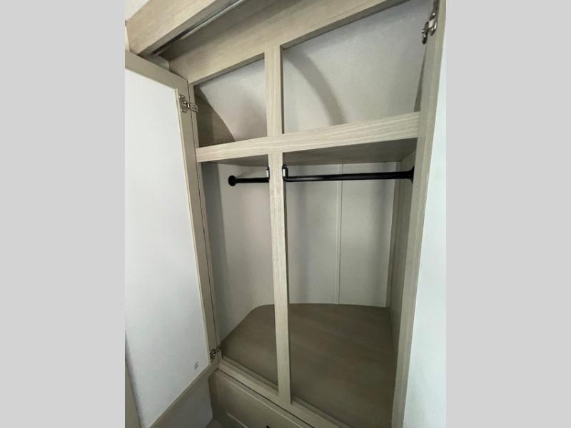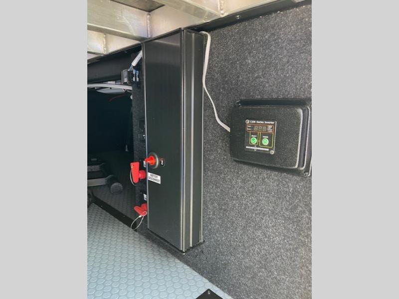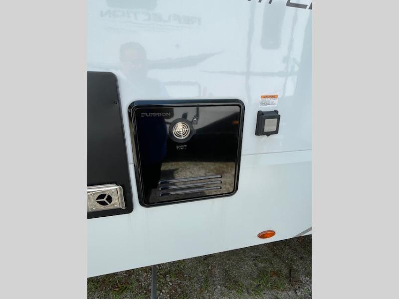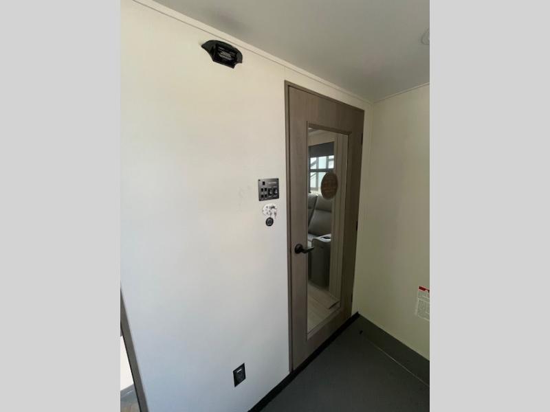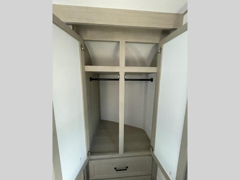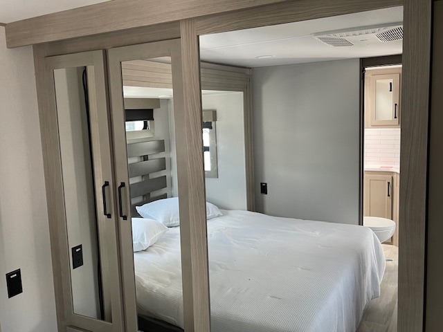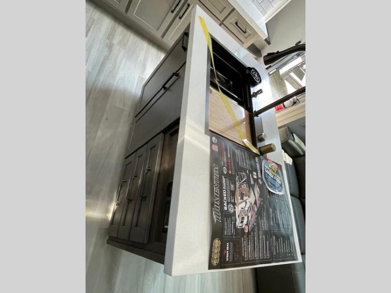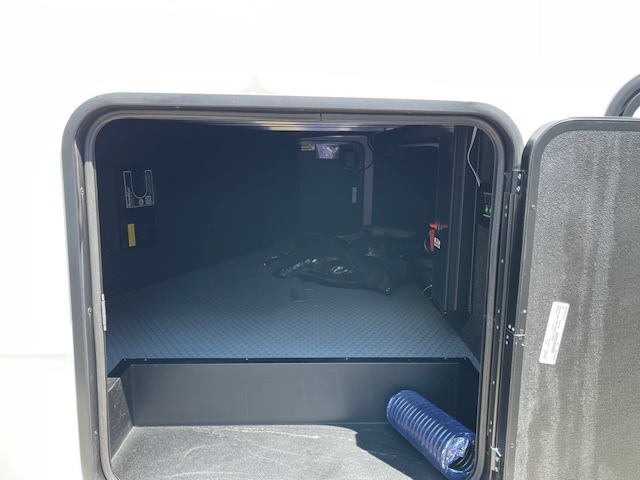 Traveling with friends and family can be comfortable when you have a full double entry bathroom and a half bath available when camping and enjoying the trails on your off-road toys! You will have an 11' garage space that can become a second living/dining area, and you can add the optional Liftsuite System for more sleeping space. An overhead bed comes standard, along with a super sofa in the main living area where guests can sleep. Everyone can watch the LED TV when waiting for dinner, and enjoy the fireplace on those chiller nights. The kitchen island offers a sink to wash dishes, extra counter space for serving meals and two stools to dine at. The cook will love all the upgraded appliances, and the space thanks to the slide. The front bedroom gives you a queen bed slide with a king bed option, lots of clothing space, and a slide top dresser for even more storage.