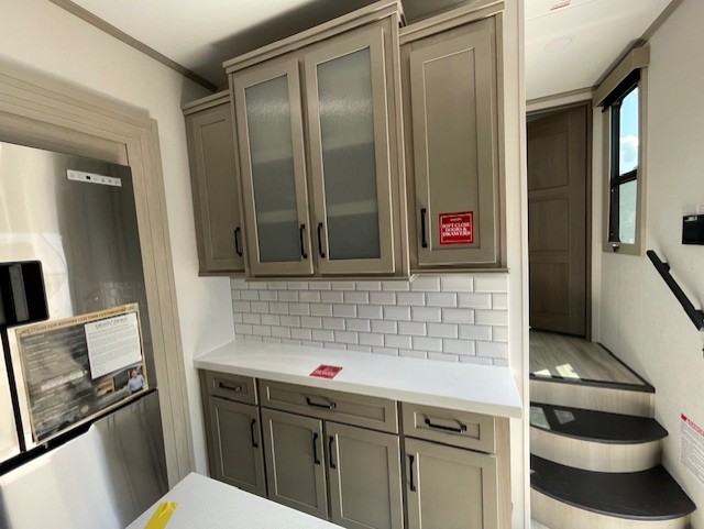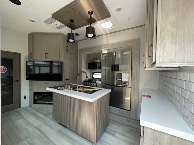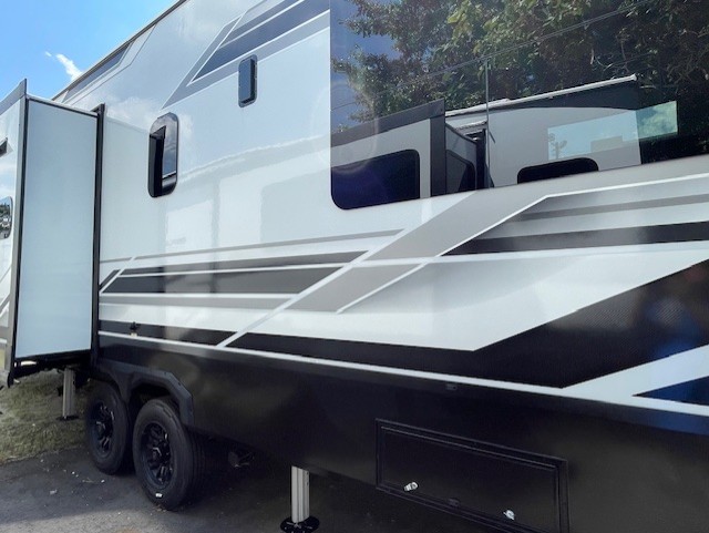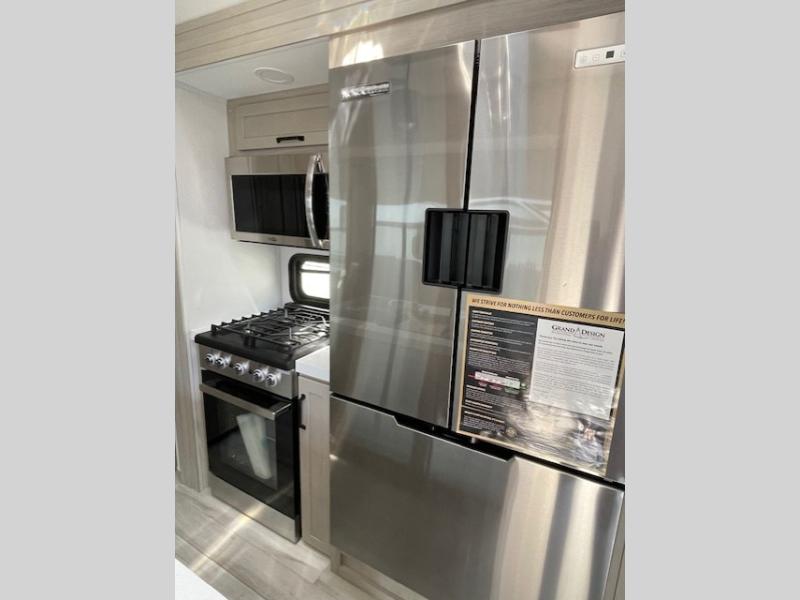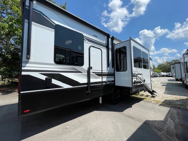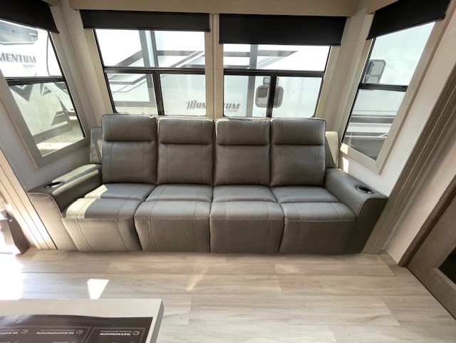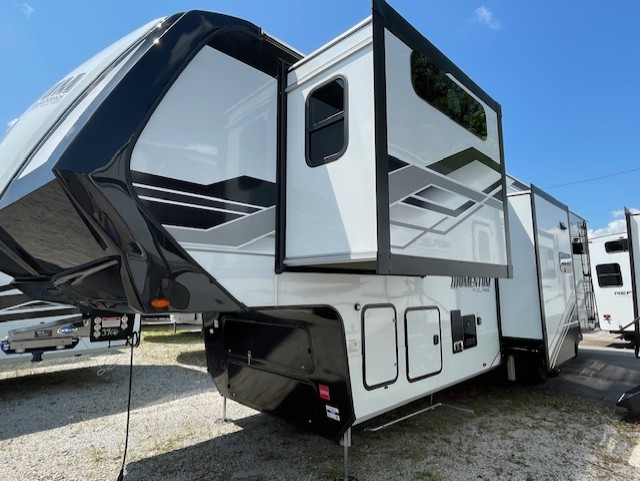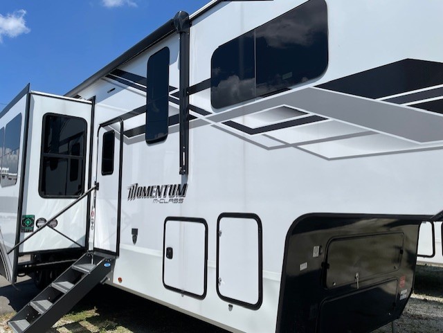 With any Momentum M-Class toy hauler by Grand Design, you will enjoy luxury at every turn! They have been constructed to a superior standard with a thermal roof design, triple insulated main floor and garage floor, and a Rail-Tite underbelly seal that will allow you to camp in all elements. Each model also features an 8' 5" wide body chassis with a wide rail design, no wheel wheels, and a dovetail entry for easier loading. The Stealth A/C system provides maximum cooling power, and the CRE3000 suspension system means you can enjoy a smooth tow each time. You will love the luxurious interior with a professional grade stainless steel cooktop, interior color changing LED accent lighting, a fiberglass shower with a glass door, and solid surface countertops.