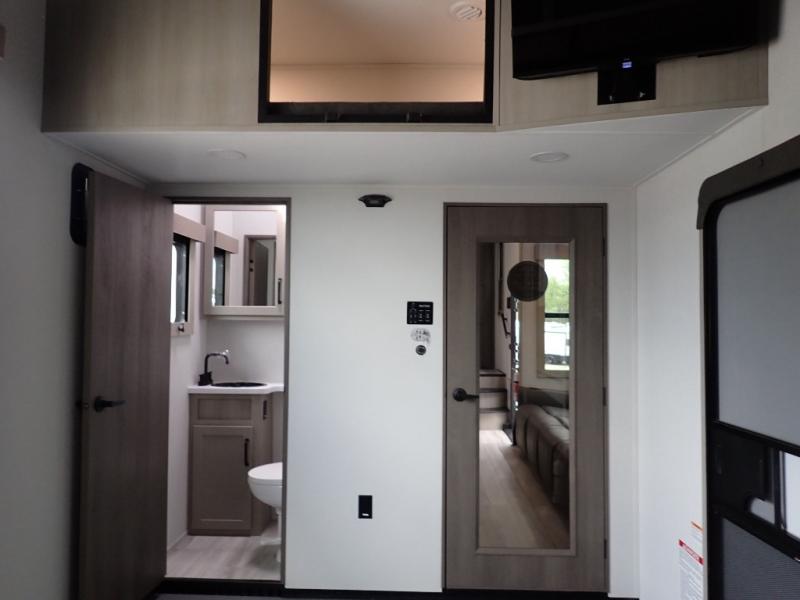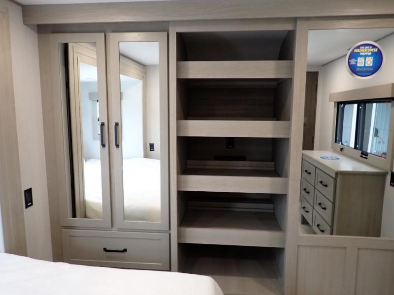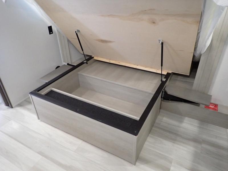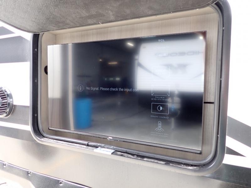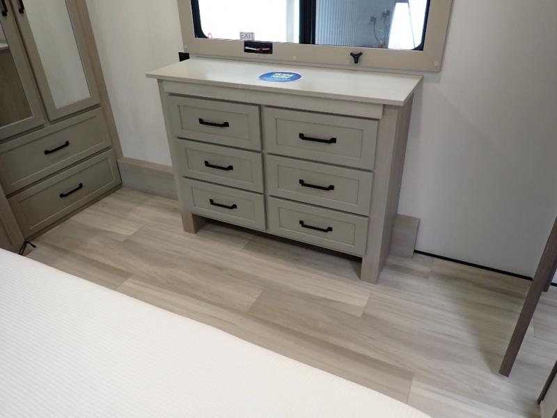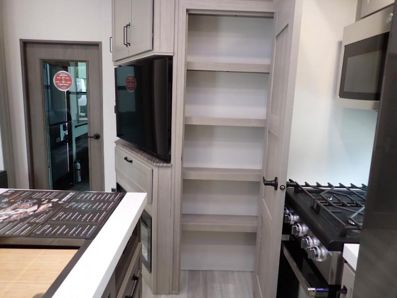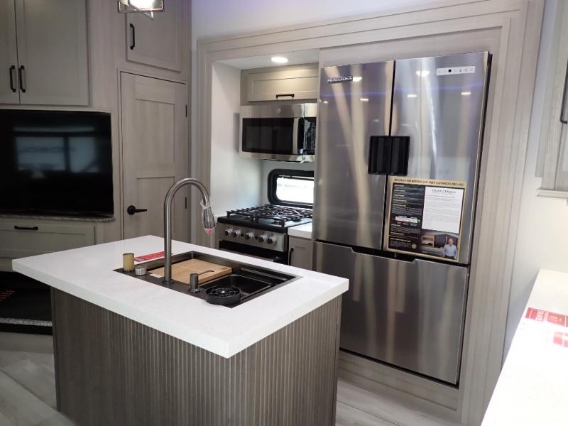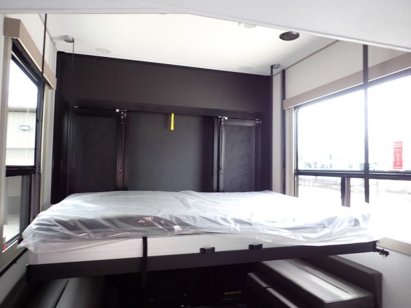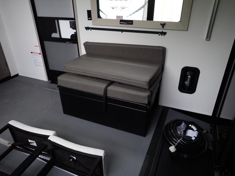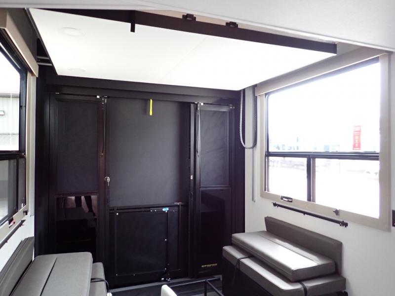 Traveling with friends and family can be comfortable when you have a full double entry bathroom and a half bath available when camping and enjoying the trails on your off-road toys! You will have an 11' garage space that can become a second living/dining area, and you can add the optional Liftsuite System for more sleeping space. An overhead bed comes standard, along with a super sofa in the main living area where guests can sleep. Everyone can watch the LED TV when waiting for dinner, and enjoy the fireplace on those chiller nights. The kitchen island offers a sink to wash dishes, extra counter space for serving meals and two stools to dine at. The cook will love all the upgraded appliances, and the space thanks to the slide. The front bedroom gives you a queen bed slide with a king bed option, lots of clothing space, and a slide top dresser for even more storage.