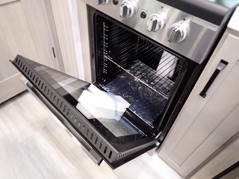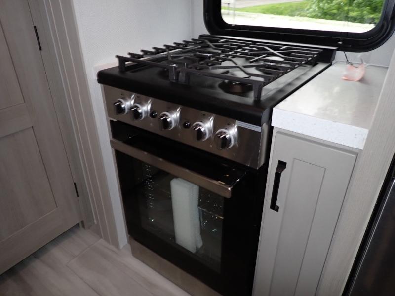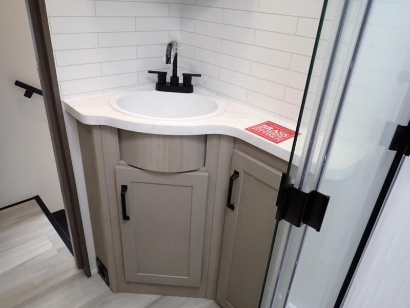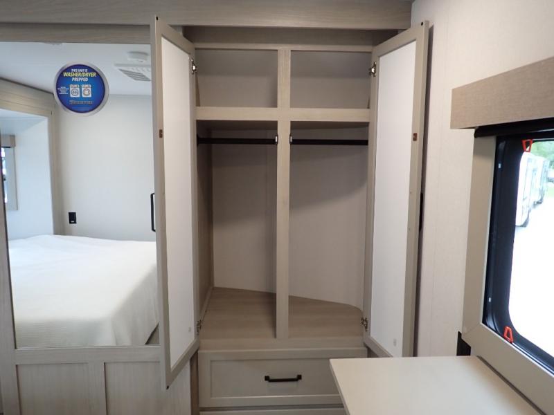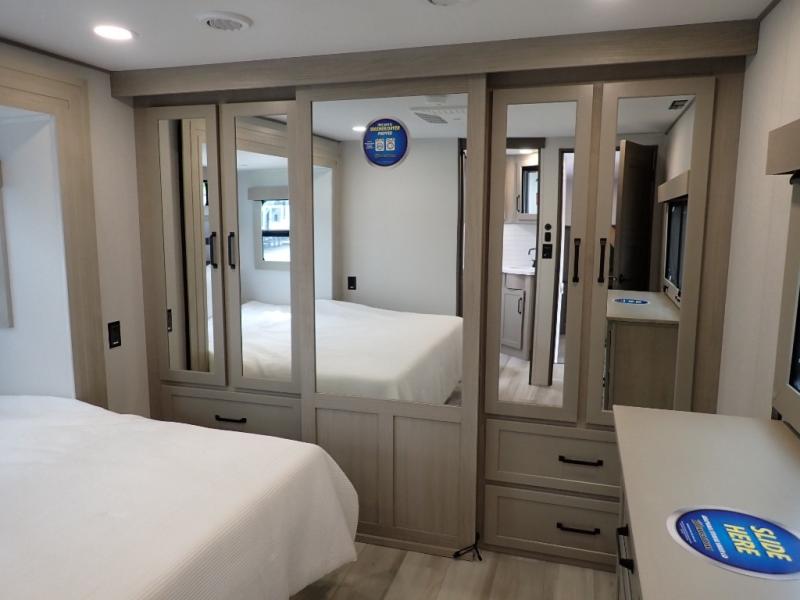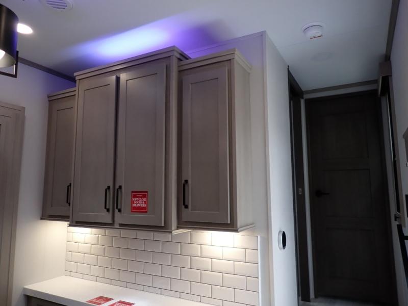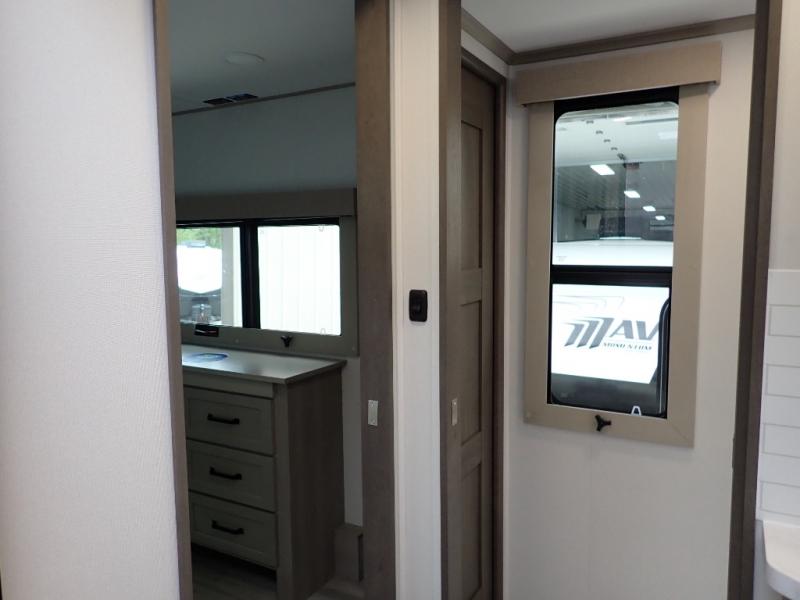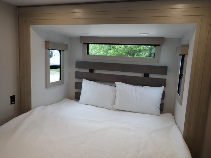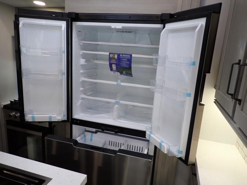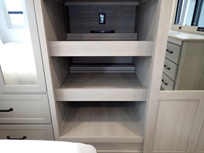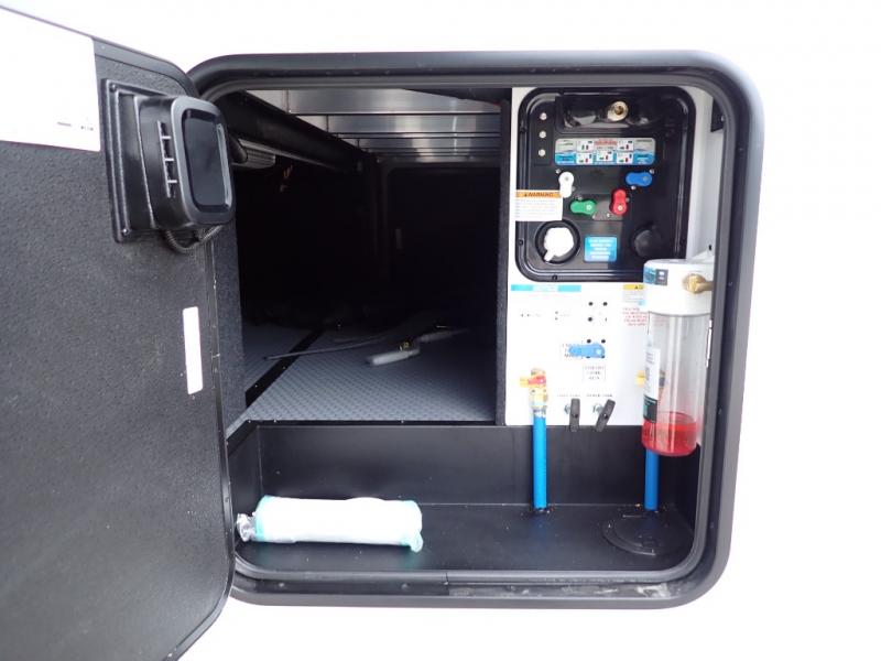 Traveling with friends and family can be comfortable when you have a full double entry bathroom and a half bath available when camping and enjoying the trails on your off-road toys! You will have an 11' garage space that can become a second living/dining area, and you can add the optional Liftsuite System for more sleeping space. An overhead bed comes standard, along with a super sofa in the main living area where guests can sleep. Everyone can watch the LED TV when waiting for dinner, and enjoy the fireplace on those chiller nights. The kitchen island offers a sink to wash dishes, extra counter space for serving meals and two stools to dine at. The cook will love all the upgraded appliances, and the space thanks to the slide. The front bedroom gives you a queen bed slide with a king bed option, lots of clothing space, and a slide top dresser for even more storage.