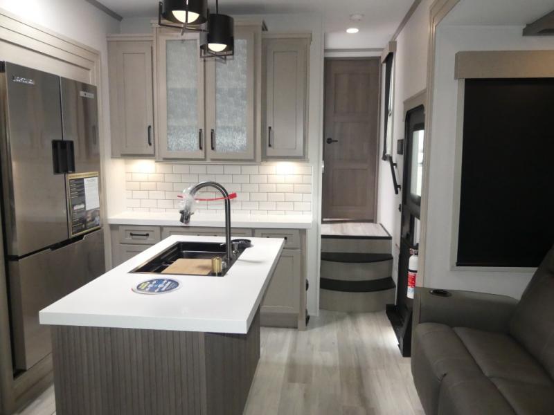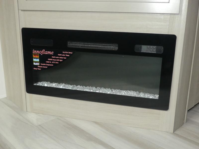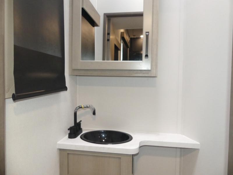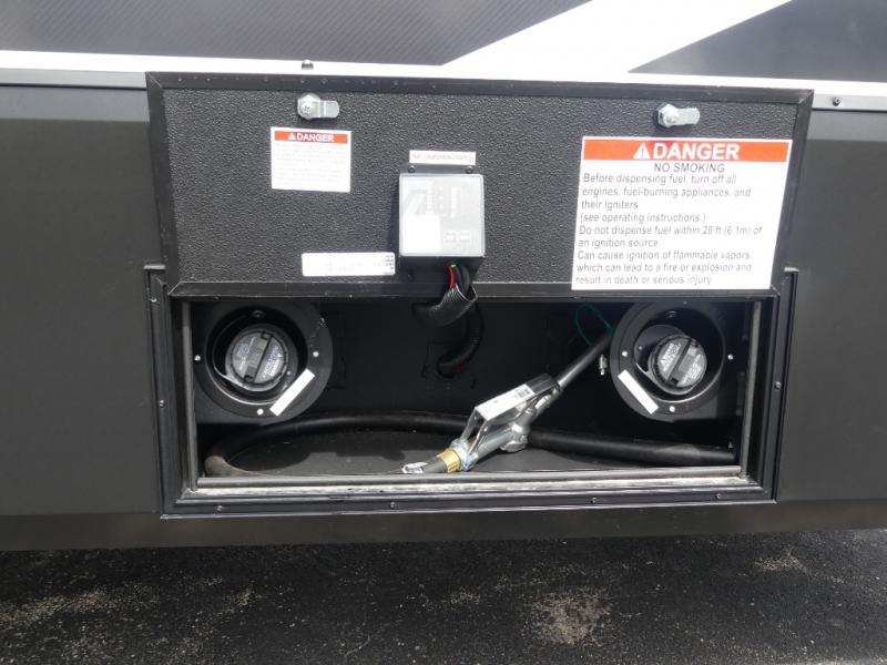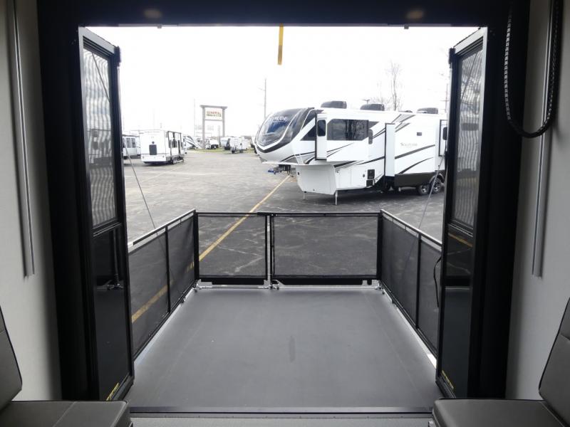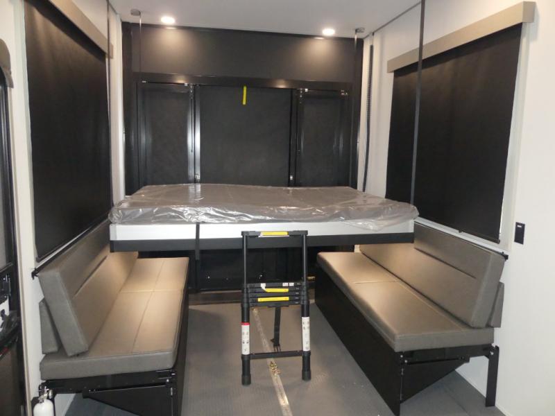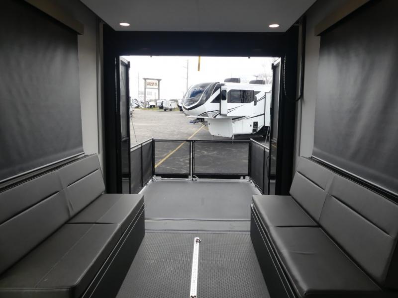 Traveling with friends and family can be comfortable when you have a full double entry bathroom and a half bath available when camping and enjoying the trails on your off-road toys! You will have an 15' garage space that can become a second living/dining area as well as a bedroom with the Liftsuite System. There is an overhead loft bed and a four-seat sofa slide for more sleeping space in the main living area. Everyone can watch the LED TV when waiting for dinner, and enjoy the fireplace on those chiller nights. The kitchen island offers a sink to wash dishes, extra counter space for serving meals and two stools to dine at. The cook will love all the upgraded appliances and the space thanks to the slide. The front bedroom gives you a King bed slide, lots of clothing space, and a slide top dresser for even more storage.