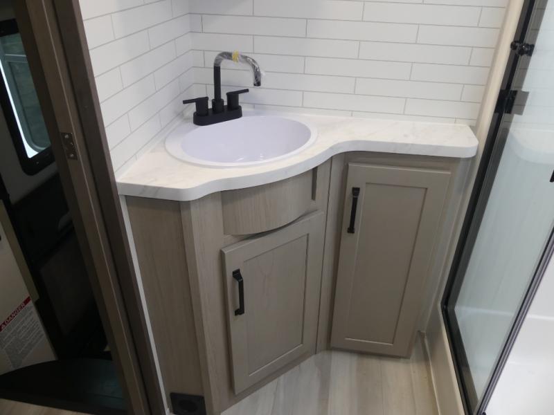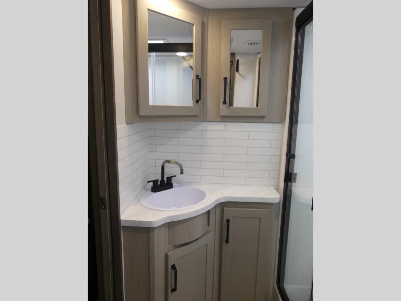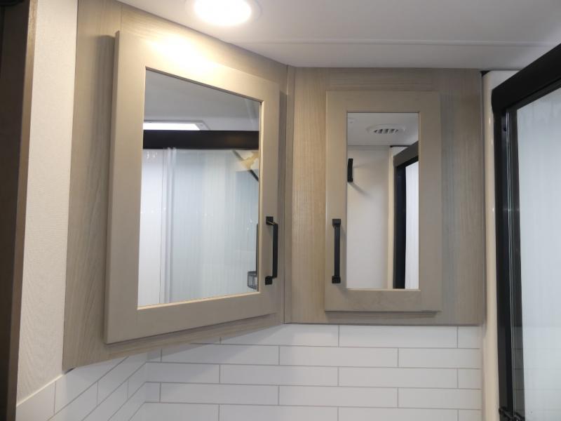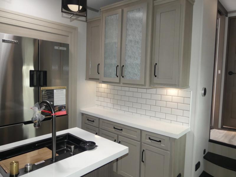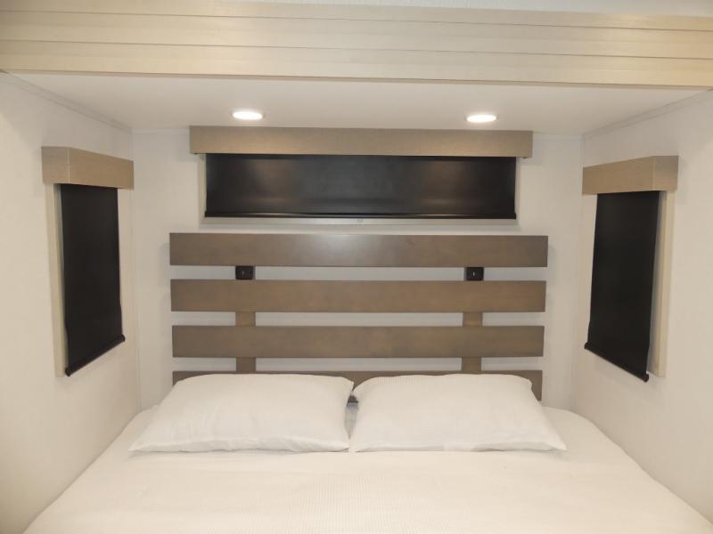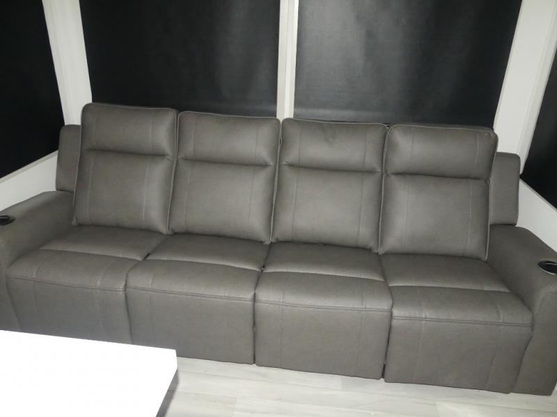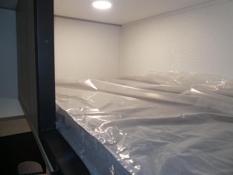 Traveling with friends and family can be comfortable when you have a full double entry bathroom and a half bath available when camping and enjoying the trails on your off-road toys! You will have an 15' garage space that can become a second living/dining area as well as a bedroom with the Liftsuite System. There is an overhead loft bed and a four-seat sofa slide for more sleeping space in the main living area. Everyone can watch the LED TV when waiting for dinner, and enjoy the fireplace on those chiller nights. The kitchen island offers a sink to wash dishes, extra counter space for serving meals and two stools to dine at. The cook will love all the upgraded appliances and the space thanks to the slide. The front bedroom gives you a King bed slide, lots of clothing space, and a slide top dresser for even more storage.