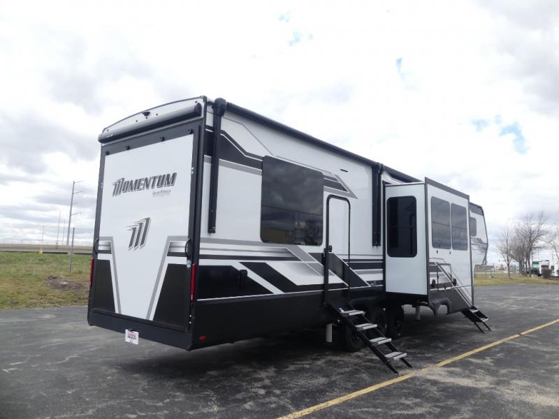 With any Momentum M-Class toy hauler by Grand Design, you will enjoy luxury at every turn! They have been constructed to a superior standard with a thermal roof design, triple insulated main floor and garage floor, and a Rail-Tite underbelly seal that will allow you to camp in all elements. Each model also features an 8' 5" wide body chassis with a wide rail design, no wheel wheels, and a dovetail entry for easier loading. The Stealth A/C system provides maximum cooling power, and the CRE3000 suspension system means you can enjoy a smooth tow each time. You will love the luxurious interior with a professional grade stainless steel cooktop, interior color changing LED accent lighting, a fiberglass shower with a glass door, and solid surface countertops.
