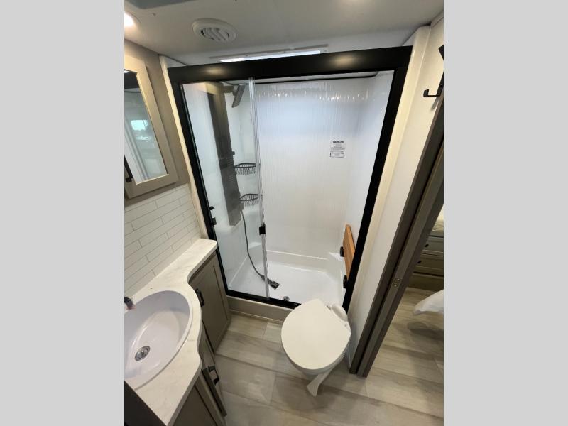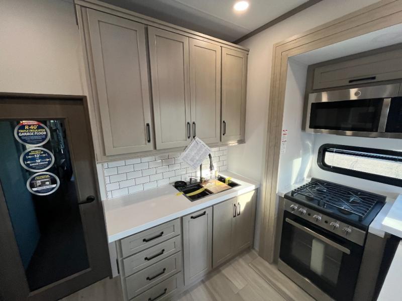 With any Momentum M-Class toy hauler by Grand Design, you will enjoy luxury at every turn! They have been constructed to a superior standard with a thermal roof design, triple insulated main floor and garage floor, and a Rail-Tite underbelly seal that will allow you to camp in all elements. Each model also features an 8' 5" wide body chassis with a wide rail design, no wheel wheels, and a dovetail entry for easier loading. The Stealth A/C system provides maximum cooling power, and the CRE3000 suspension system means you can enjoy a smooth tow each time. You will love the luxurious interior with a professional grade stainless steel cooktop, interior color changing LED accent lighting, a fiberglass shower with a glass door, and solid surface countertops.
