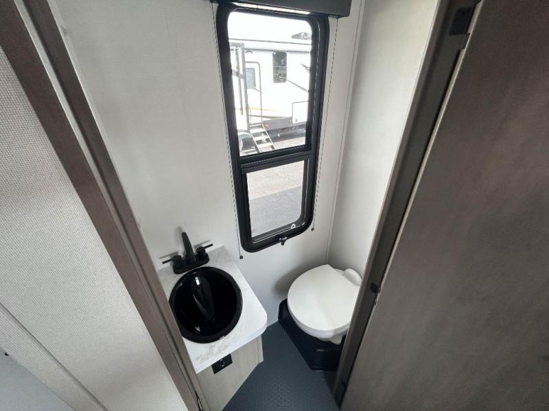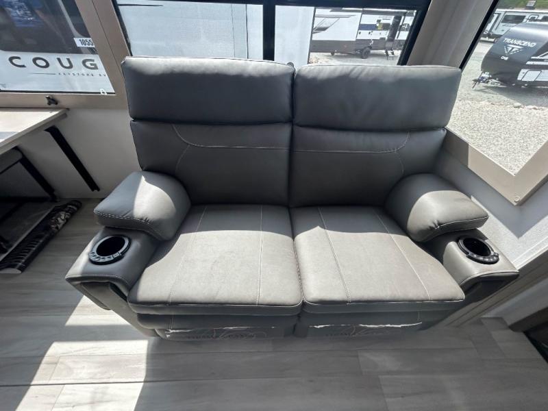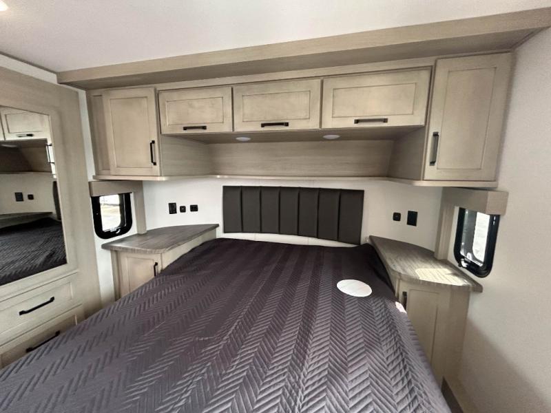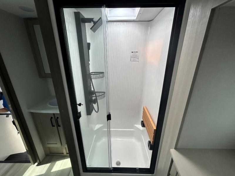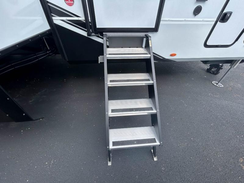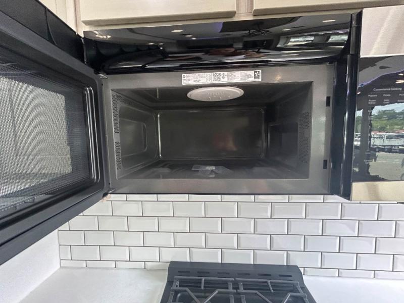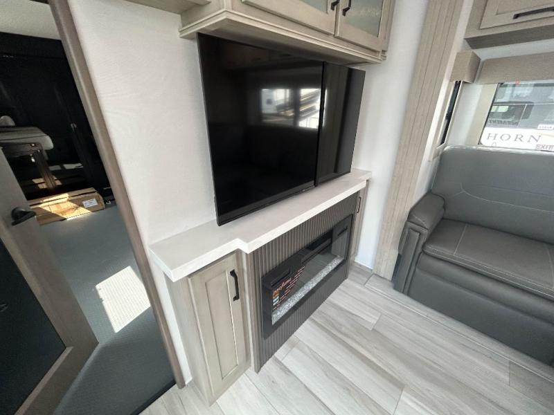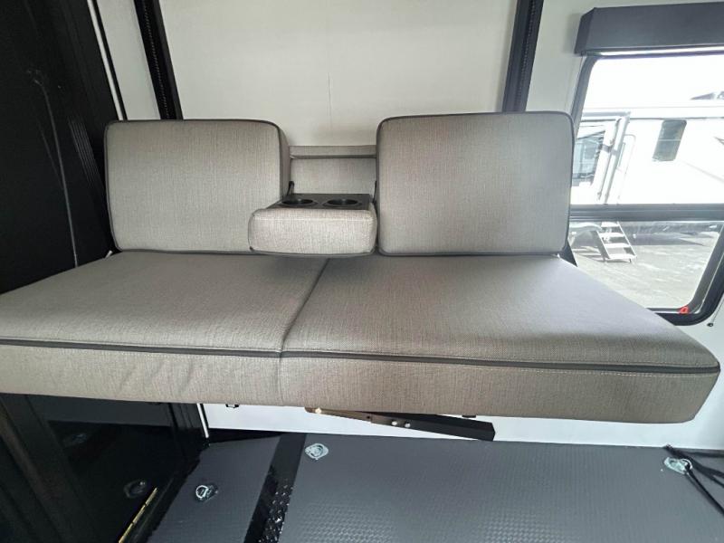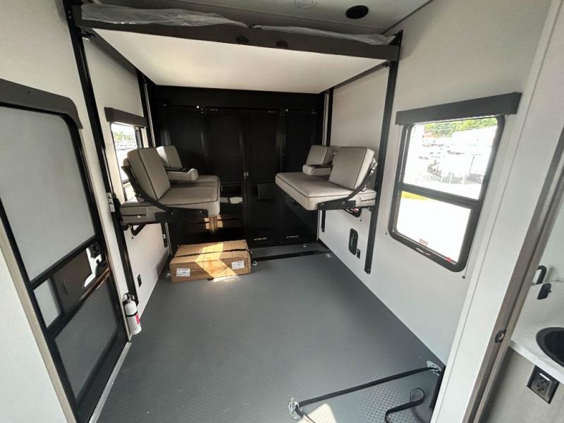 You want a toy hauler to carry your toys to the trails, and you can get an extra living room/bedroom out of this space once everything is unload when you add the Happi-Jac rollover sofas with a table with a top bed option. You might even like to add more optional features such a half bath and washer/dryer. There is an overhead loft bed and an L-shaped pull-out sofa in the main living area that offers sleeping space as well. Everyone can watch a movie on the LED TV with a fireplace below while sitting on the sofa, in the theatre seats, or while at the free standing dinette with four chairs. The chef will have upgraded appliances to make meals for everyone, an L-shaped countertop with a kitchen sink, and a USB charging outlet. You will love the shower with seat in the full bathroom with two space savings sliding doors that lead into the hallway, and into the front bedroom where you will have a walk-around queen bed, a slide out wardrobe and more USB charging outlets.