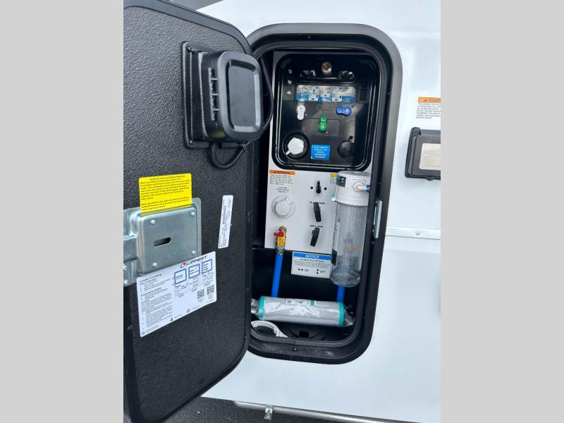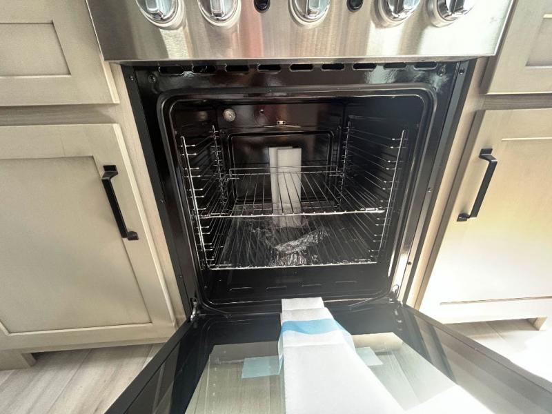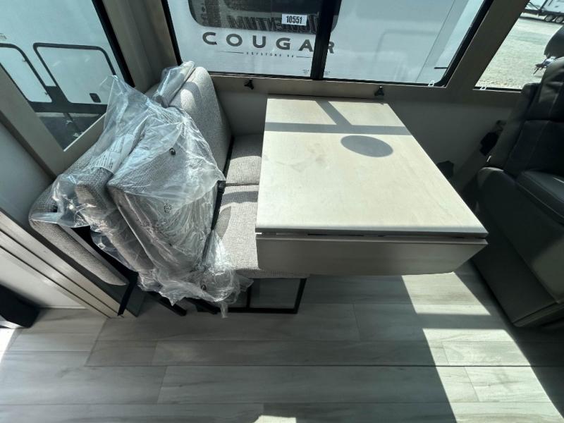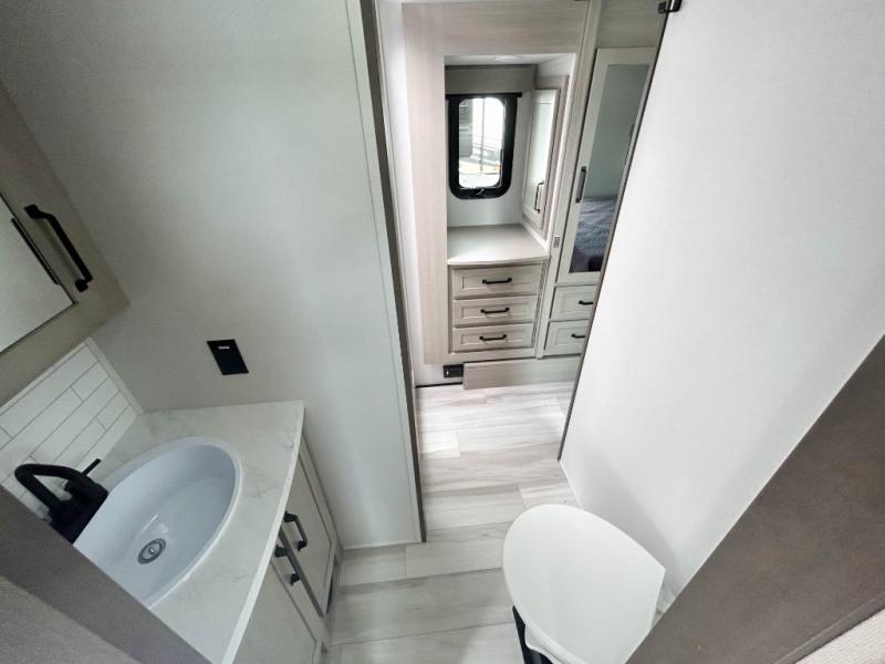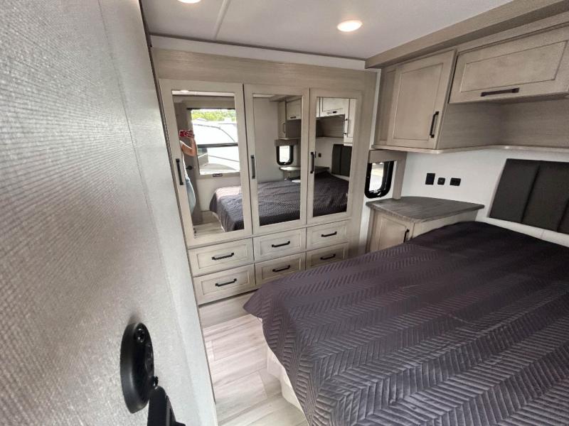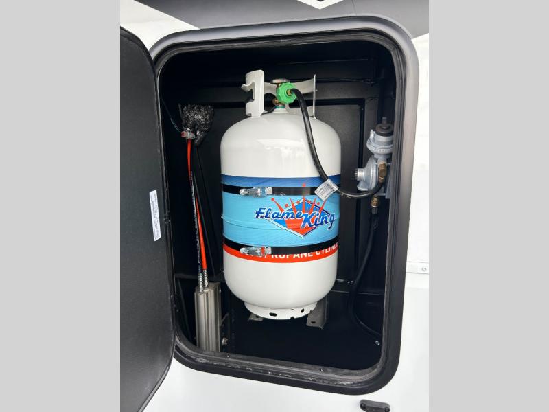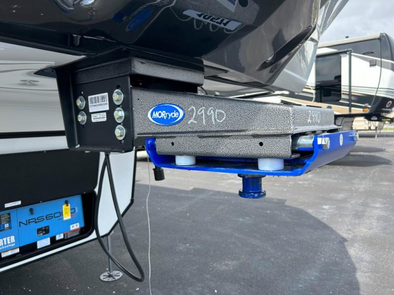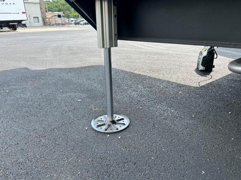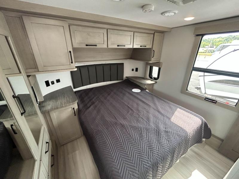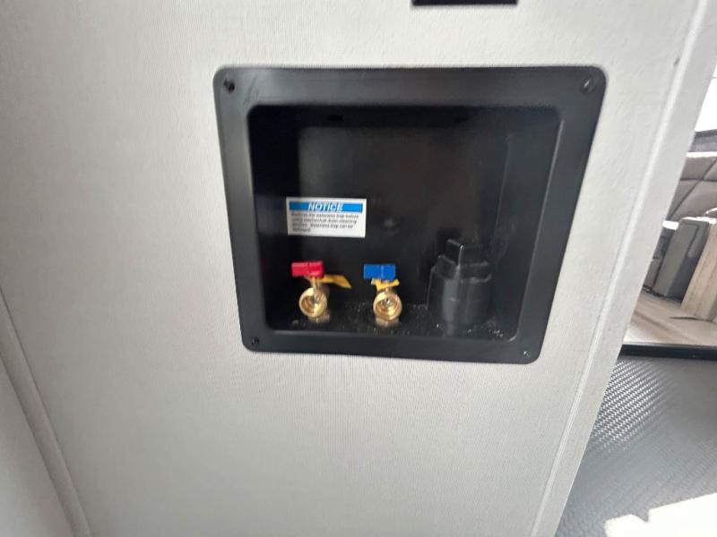You want a toy hauler to carry your toys to the trails, and you can get an extra living room/bedroom out of this space once everything is unload when you add the Happi-Jac rollover sofas with a table with a top bed option. You might even like to add more optional features such a half bath and washer/dryer. There is an overhead loft bed and an L-shaped pull-out sofa in the main living area that offers sleeping space as well. Everyone can watch a movie on the LED TV with a fireplace below while sitting on the sofa, in the theatre seats, or while at the free standing dinette with four chairs. The chef will have upgraded appliances to make meals for everyone, an L-shaped countertop with a kitchen sink, and a USB charging outlet. You will love the shower with seat in the full bathroom with two space savings sliding doors that lead into the hallway, and into the front bedroom where you will have a walk-around queen bed, a slide out wardrobe and more USB charging outlets.