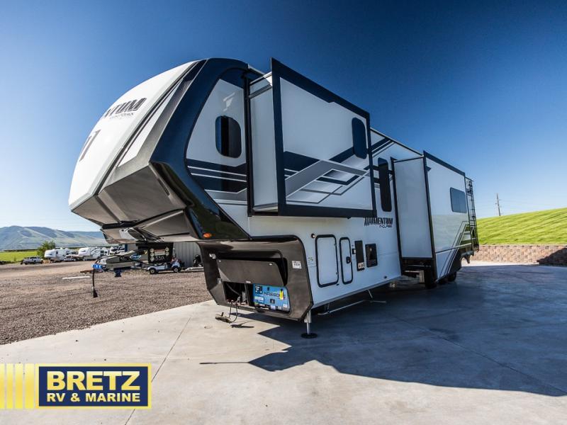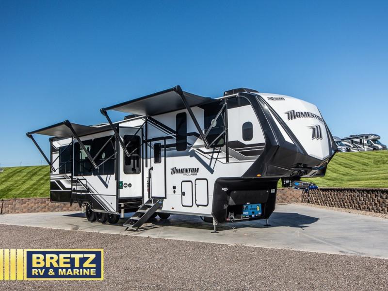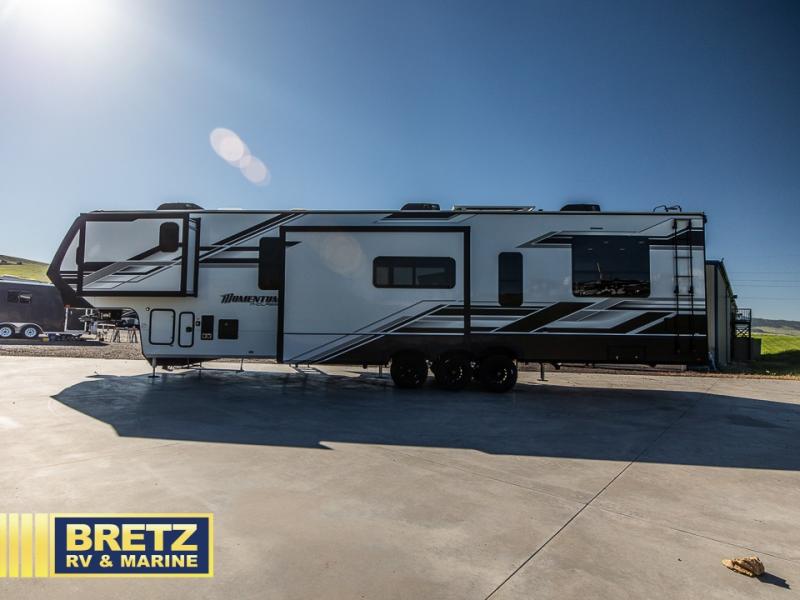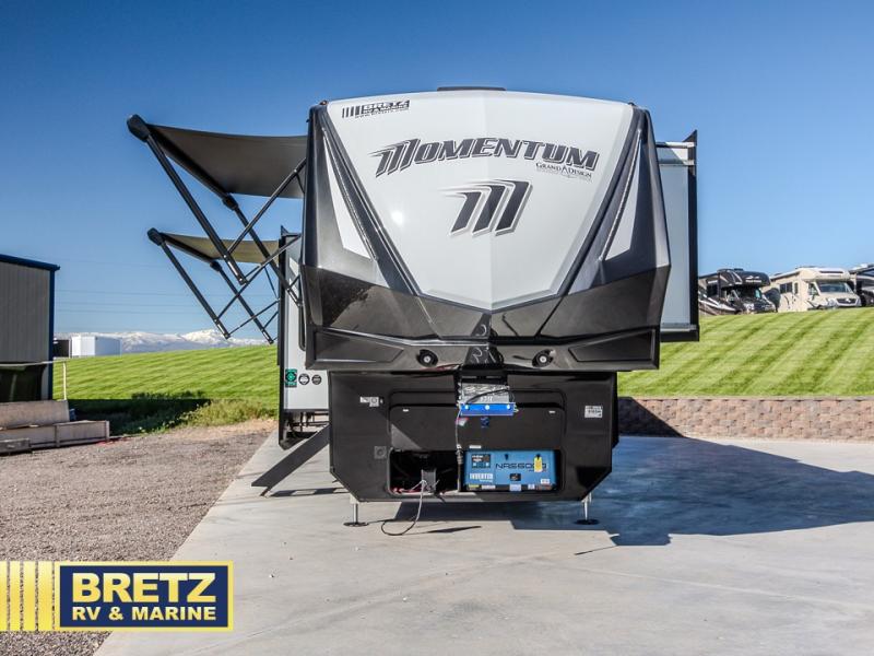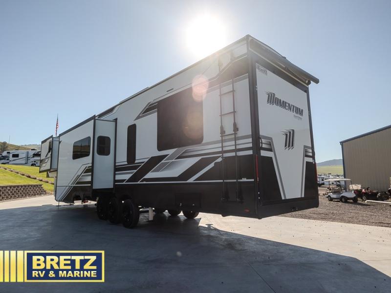 With any Momentum M-Class toy hauler by Grand Design, you will enjoy luxury at every turn! They have been constructed to a superior standard with a thermal roof design, triple insulated main floor and garage floor, and a Rail-Tite underbelly seal that will allow you to camp in all elements. Each model also features an 8' 5" wide body chassis with a wide rail design, no wheel wheels, and a dovetail entry for easier loading. The Stealth A/C system provides maximum cooling power, and the CRE3000 suspension system means you can enjoy a smooth tow each time. You will love the luxurious interior with a professional grade stainless steel cooktop, interior color changing LED accent lighting, a fiberglass shower with a glass door, and solid surface countertops.