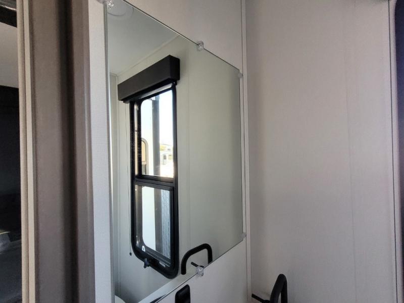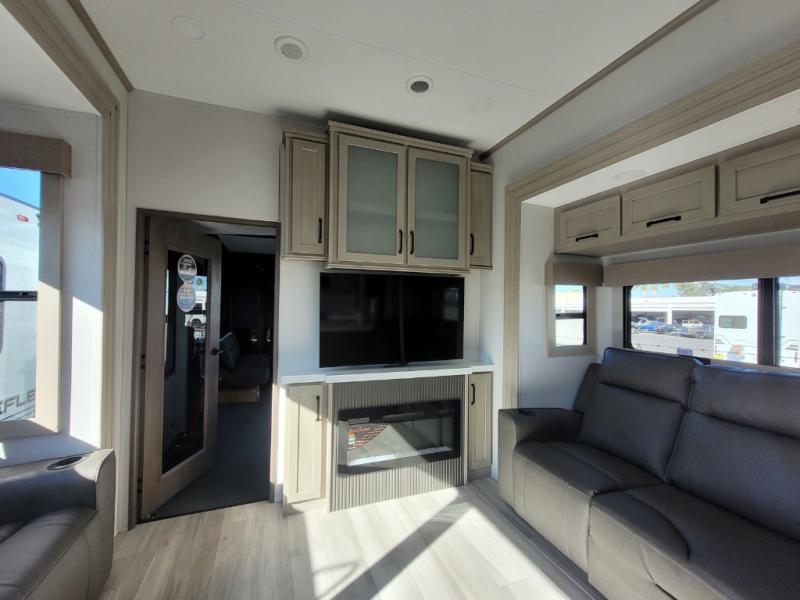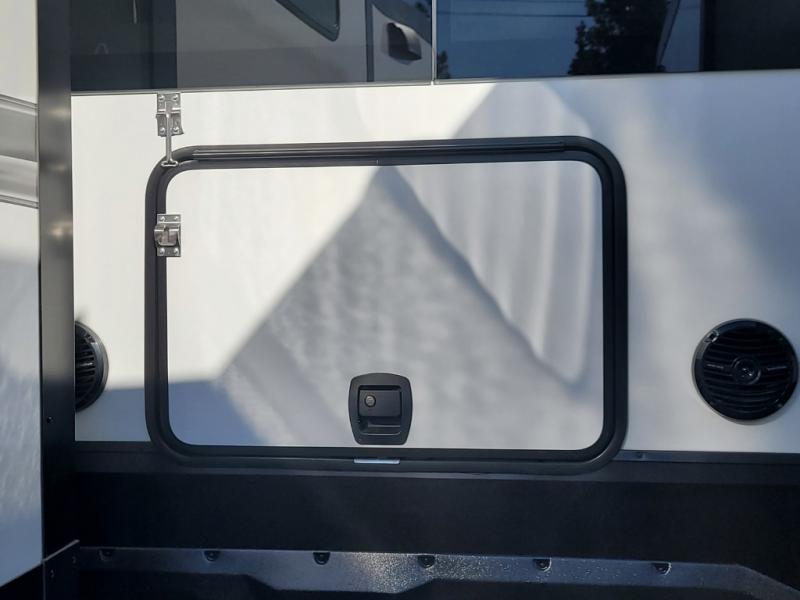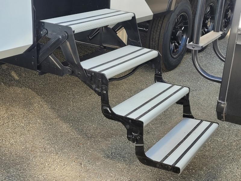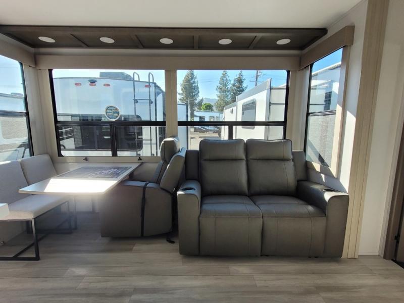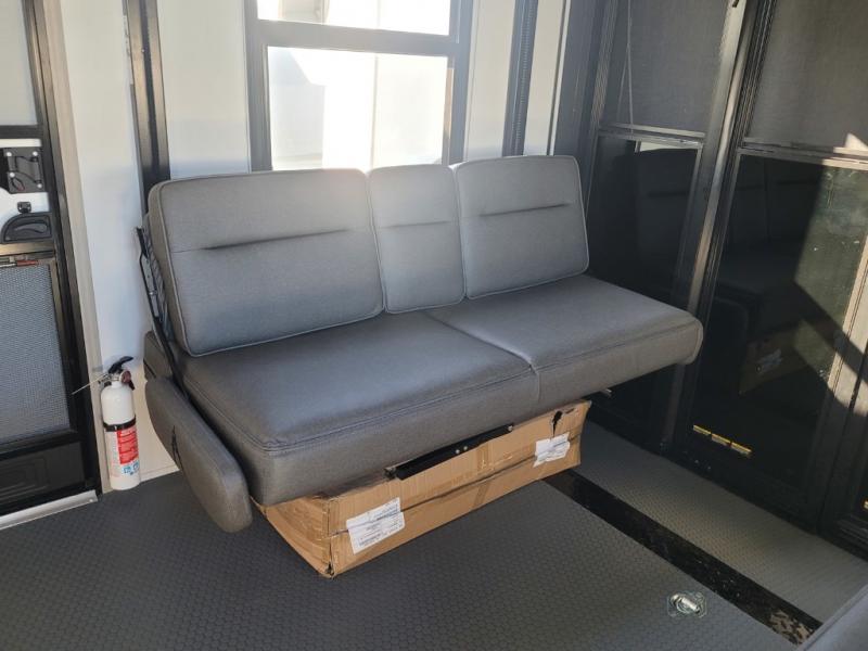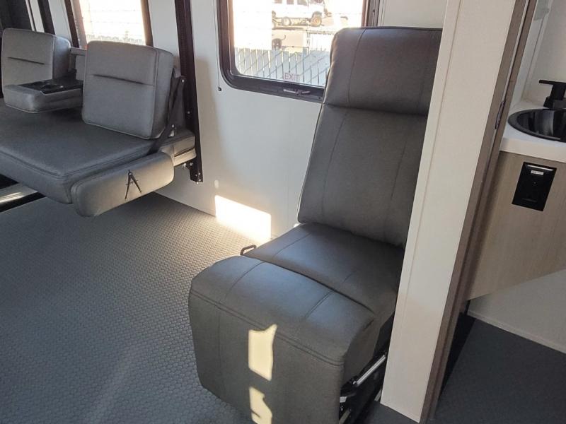 You want a toy hauler to carry your toys to the trails, and you can get an extra living room/bedroom out of this space once everything is unload when you add the Happi-Jac rollover sofas with a table with a top bed option. You might even like to add more optional features such a half bath and washer/dryer. There is an overhead loft bed and an L-shaped pull-out sofa in the main living area that offers sleeping space as well. Everyone can watch a movie on the LED TV with a fireplace below while sitting on the sofa, in the theatre seats, or while at the free standing dinette with four chairs. The chef will have upgraded appliances to make meals for everyone, an L-shaped countertop with a kitchen sink, and a USB charging outlet. You will love the shower with seat in the full bathroom with two space savings sliding doors that lead into the hallway, and into the front bedroom where you will have a walk-around queen bed, a slide out wardrobe and more USB charging outlets.