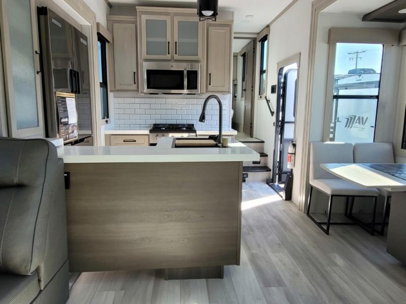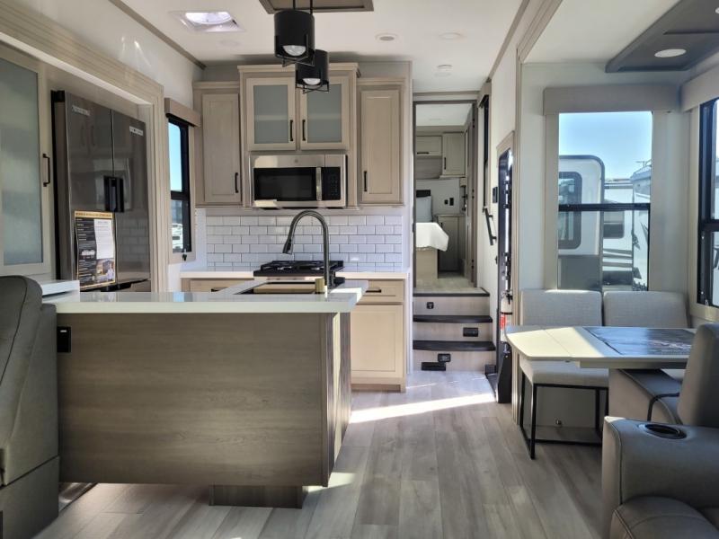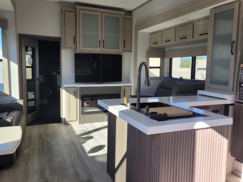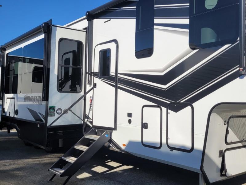 With any Momentum M-Class toy hauler by Grand Design, you will enjoy luxury at every turn! They have been constructed to a superior standard with a thermal roof design, triple insulated main floor and garage floor, and a Rail-Tite underbelly seal that will allow you to camp in all elements. Each model also features an 8' 5" wide body chassis with a wide rail design, no wheel wheels, and a dovetail entry for easier loading. The Stealth A/C system provides maximum cooling power, and the CRE3000 suspension system means you can enjoy a smooth tow each time. You will love the luxurious interior with a professional grade stainless steel cooktop, interior color changing LED accent lighting, a fiberglass shower with a glass door, and solid surface countertops.