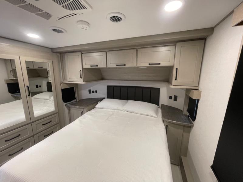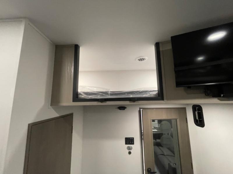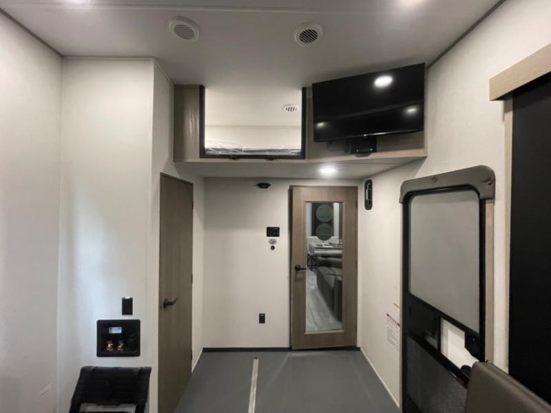 You want a toy hauler to carry your toys to the trails, and include many at-home comforts, and that's just what this unit delivers. A 14' separate garage includes an adjustable tie-down system, an optional Lifesuite System for more sleeping space, an optional half bath, plus washer and dryer prep. There is an overhead loft bed and an L-shaped sofa with recline in the main living area that offers sleeping space as well. Everyone can watch a movie on the LED TV with a fireplace below while sitting on the sofa, in the theatre seats, or while at the free standing dinette with four chairs. The chef will have upgraded appliances to make meals for everyone, an L-shaped countertop with a kitchen sink, and a USB charging outlet. You will love the shower with seat in the full bathroom with two space savings sliding doors that lead into the hallway, and into the front bedroom where you will have a walk-around queen bed, a slide out wardrobe and more USB charging outlets.