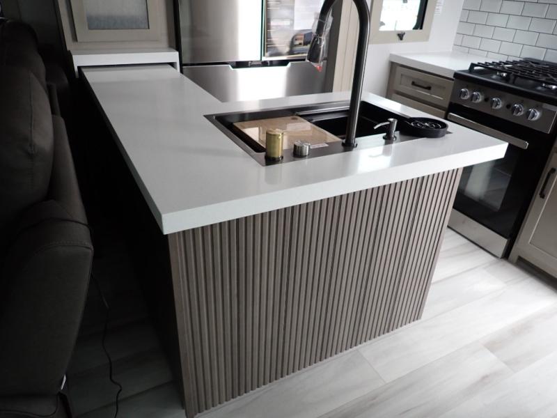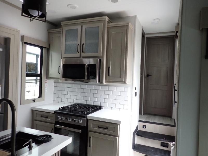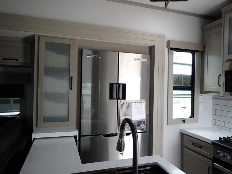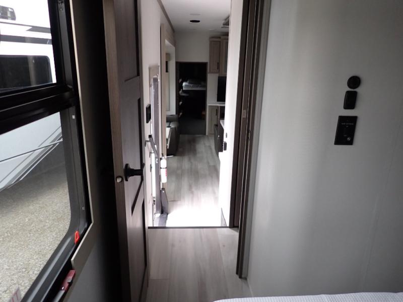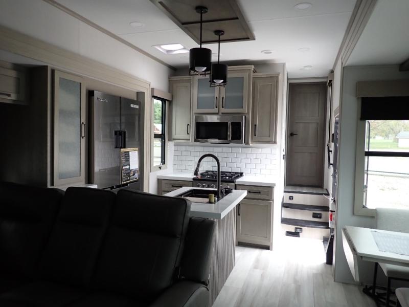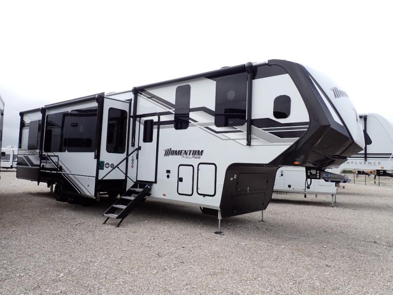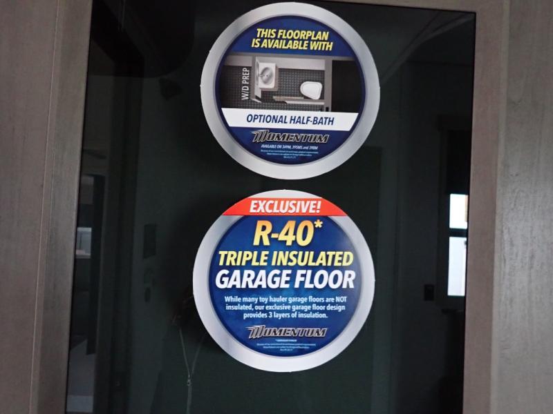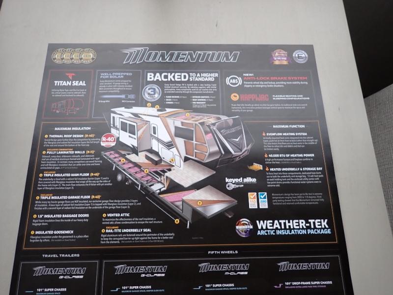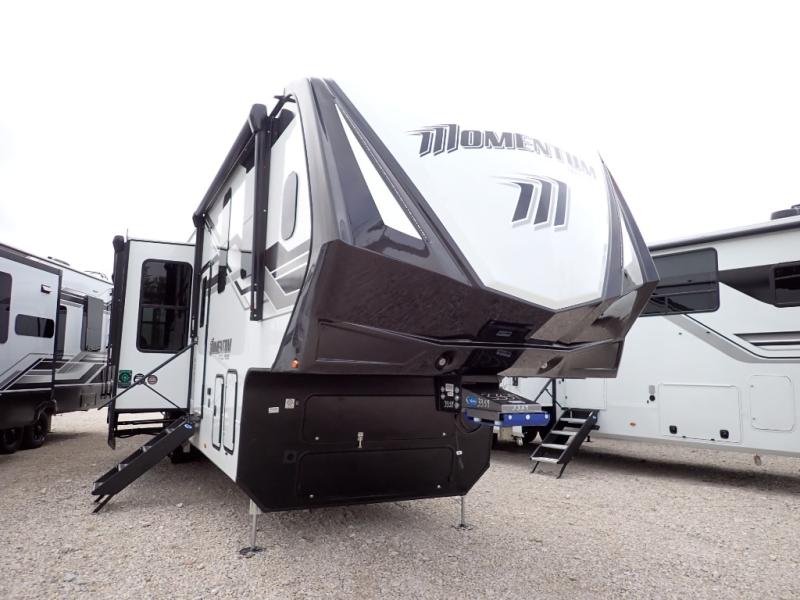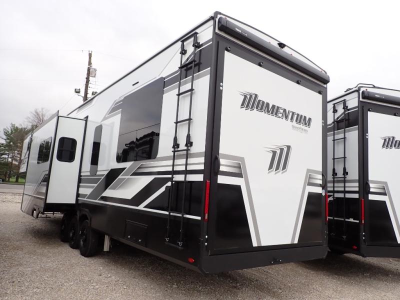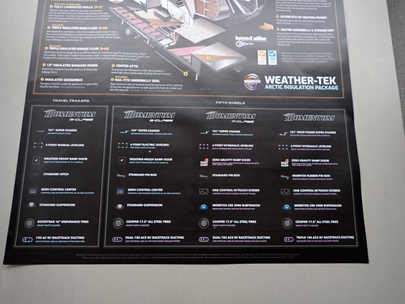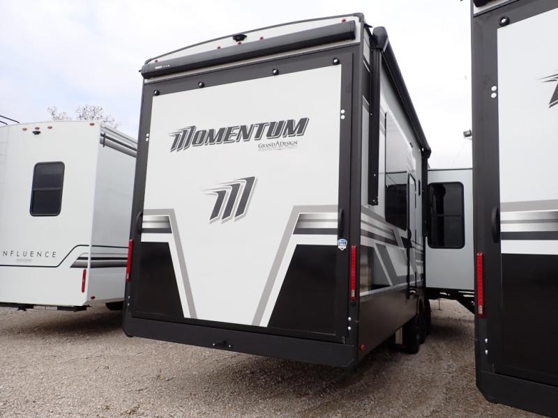 With any Momentum M-Class toy hauler by Grand Design, you will enjoy luxury at every turn! They have been constructed to a superior standard with a thermal roof design, triple insulated main floor and garage floor, and a Rail-Tite underbelly seal that will allow you to camp in all elements. Each model also features an 8' 5" wide body chassis with a wide rail design, no wheel wheels, and a dovetail entry for easier loading. The Stealth A/C system provides maximum cooling power, and the CRE3000 suspension system means you can enjoy a smooth tow each time. You will love the luxurious interior with a professional grade stainless steel cooktop, interior color changing LED accent lighting, a fiberglass shower with a glass door, and solid surface countertops.