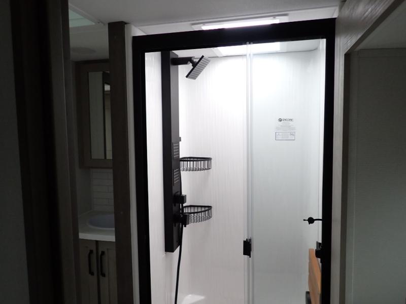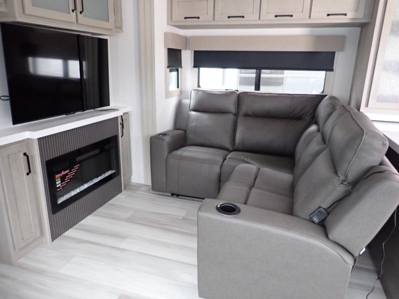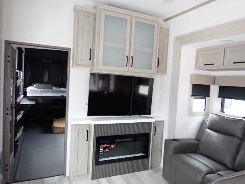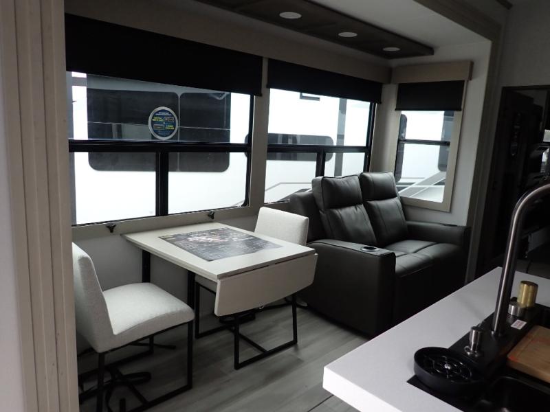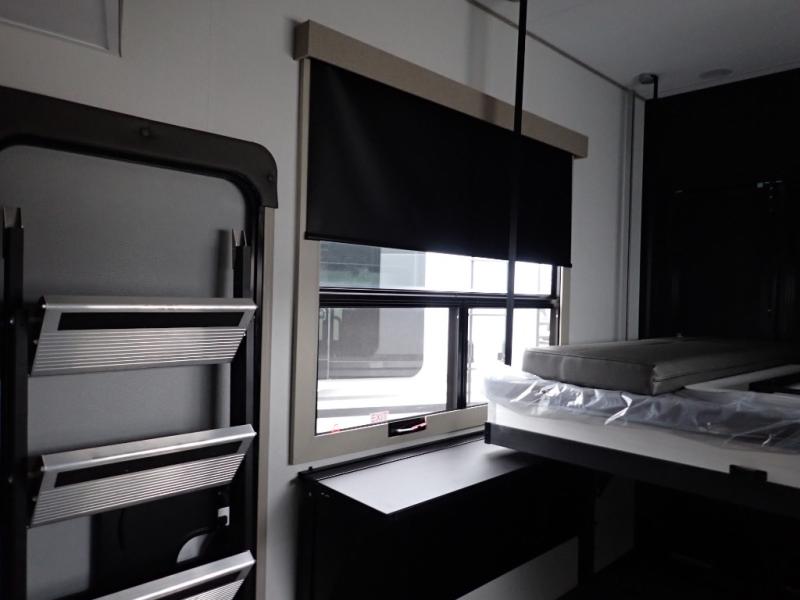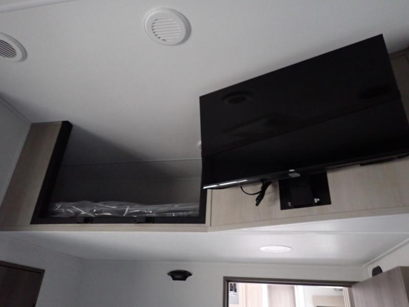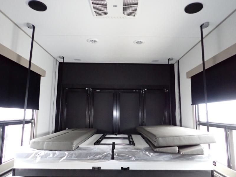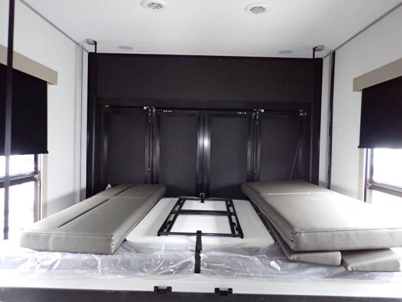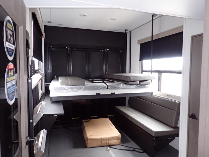 You want a toy hauler to carry your toys to the trails, and you can get an extra living room/bedroom out of this space once everything is unload when you add the Happi-Jac rollover sofas with a table with a top bed option. You might even like to add more optional features such a half bath and washer/dryer. There is an overhead loft bed and an L-shaped pull-out sofa in the main living area that offers sleeping space as well. Everyone can watch a movie on the LED TV with a fireplace below while sitting on the sofa, in the theatre seats, or while at the free standing dinette with four chairs. The chef will have upgraded appliances to make meals for everyone, an L-shaped countertop with a kitchen sink, and a USB charging outlet. You will love the shower with seat in the full bathroom with two space savings sliding doors that lead into the hallway, and into the front bedroom where you will have a walk-around queen bed, a slide out wardrobe and more USB charging outlets.