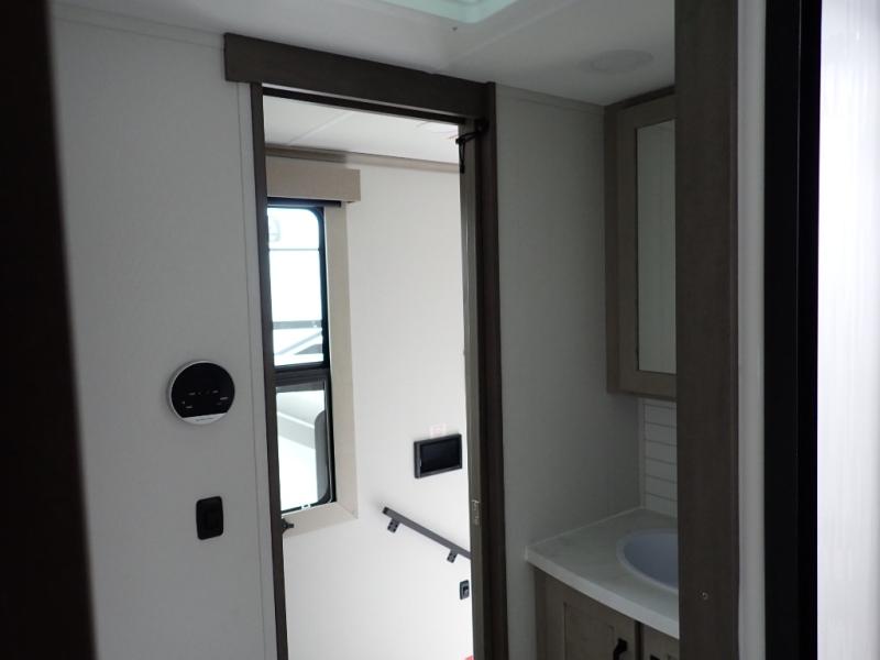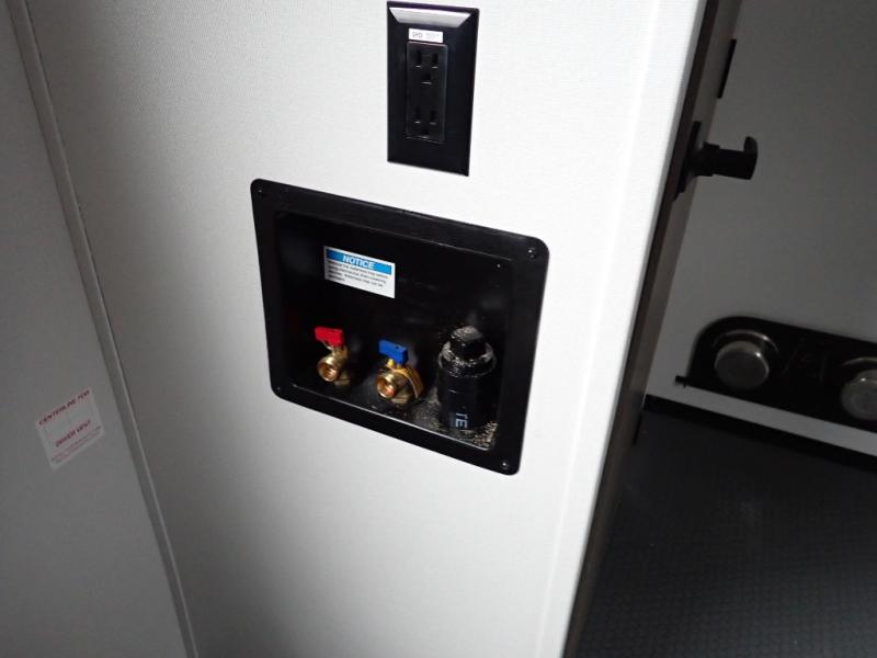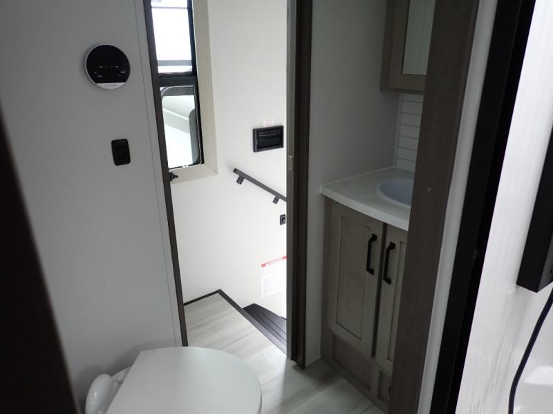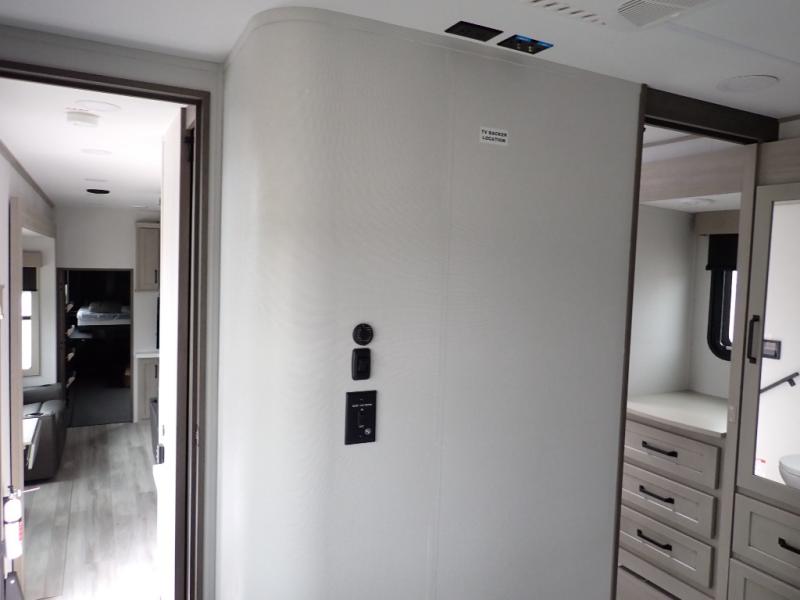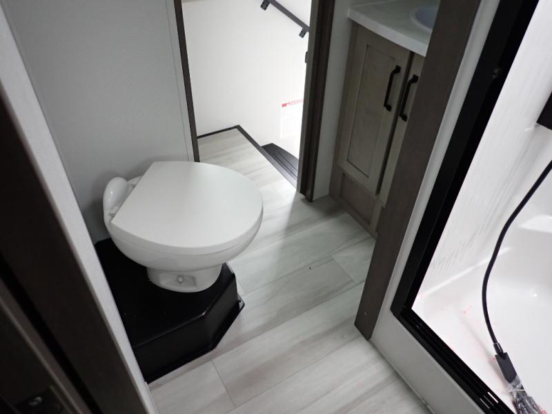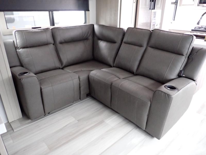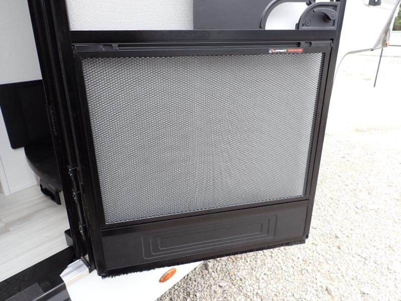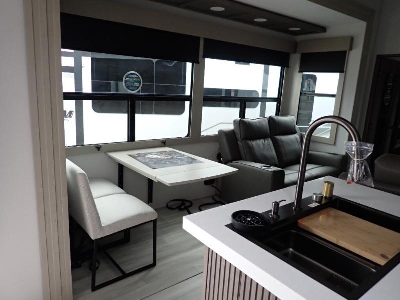 You want a toy hauler to carry your toys to the trails, and you can get an extra living room/bedroom out of this space once everything is unload when you add the Happi-Jac rollover sofas with a table with a top bed option. You might even like to add more optional features such a half bath and washer/dryer. There is an overhead loft bed and an L-shaped pull-out sofa in the main living area that offers sleeping space as well. Everyone can watch a movie on the LED TV with a fireplace below while sitting on the sofa, in the theatre seats, or while at the free standing dinette with four chairs. The chef will have upgraded appliances to make meals for everyone, an L-shaped countertop with a kitchen sink, and a USB charging outlet. You will love the shower with seat in the full bathroom with two space savings sliding doors that lead into the hallway, and into the front bedroom where you will have a walk-around queen bed, a slide out wardrobe and more USB charging outlets.