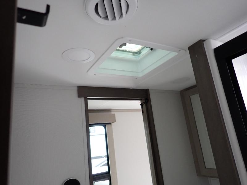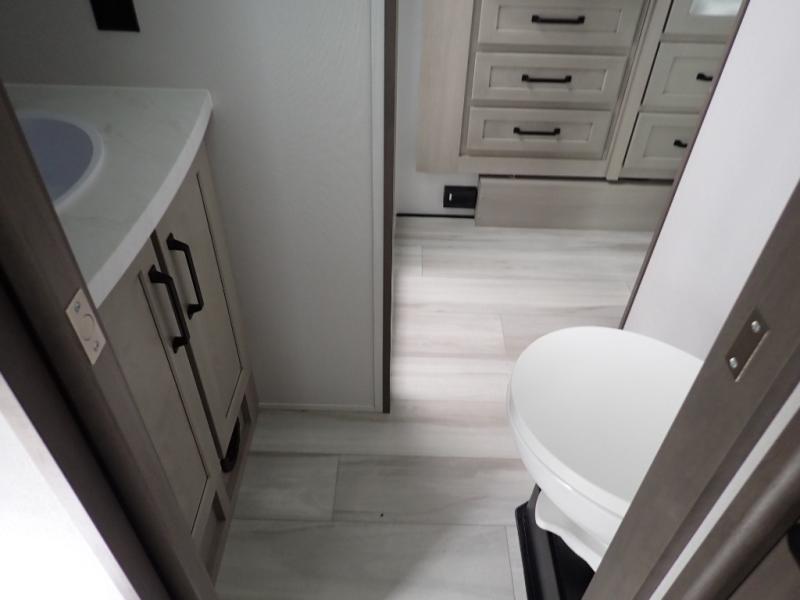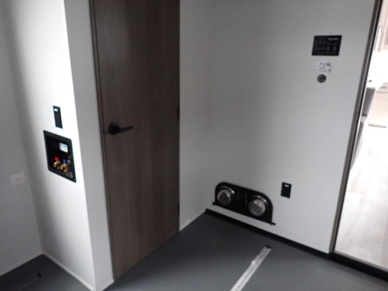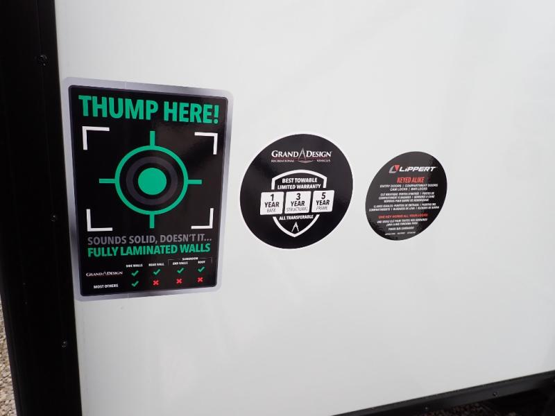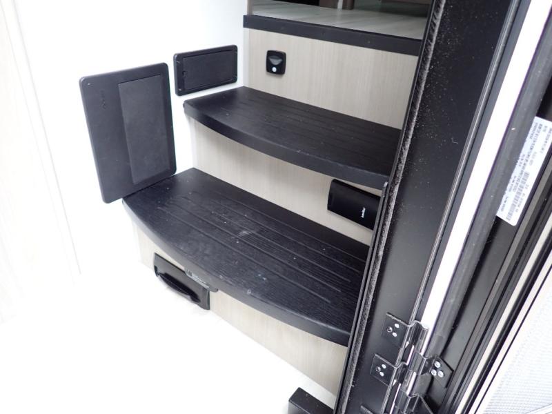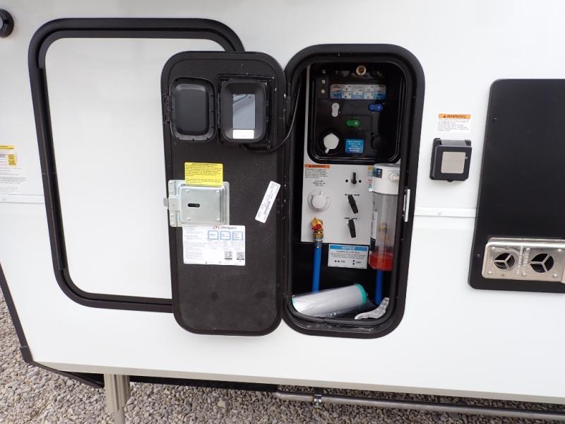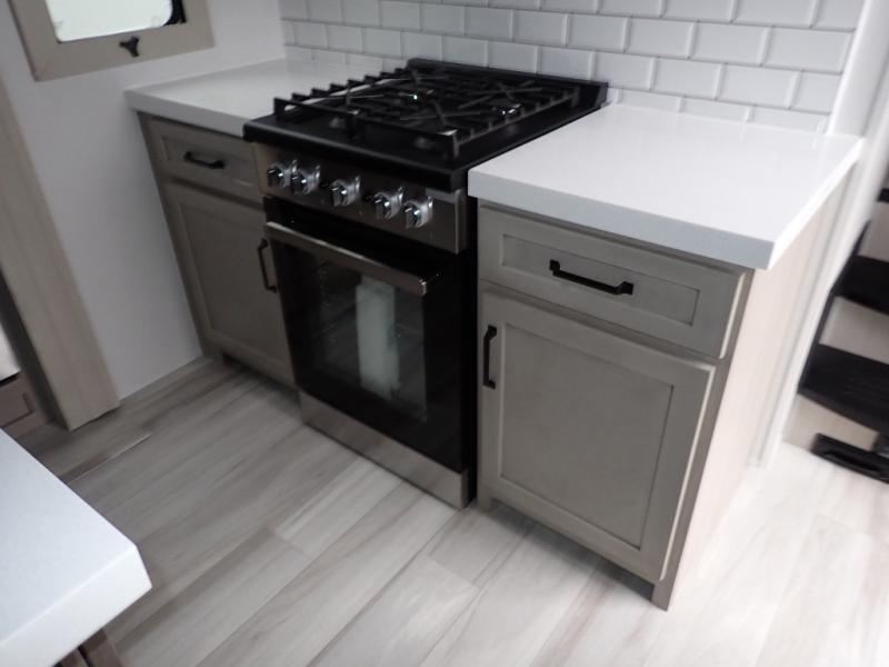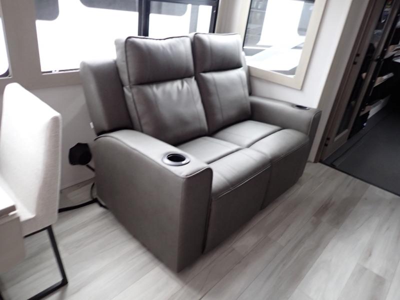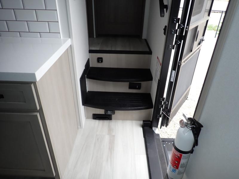 You want a toy hauler to carry your toys to the trails, and you can get an extra living room/bedroom out of this space once everything is unload when you add the Happi-Jac rollover sofas with a table with a top bed option. You might even like to add more optional features such a half bath and washer/dryer. There is an overhead loft bed and an L-shaped pull-out sofa in the main living area that offers sleeping space as well. Everyone can watch a movie on the LED TV with a fireplace below while sitting on the sofa, in the theatre seats, or while at the free standing dinette with four chairs. The chef will have upgraded appliances to make meals for everyone, an L-shaped countertop with a kitchen sink, and a USB charging outlet. You will love the shower with seat in the full bathroom with two space savings sliding doors that lead into the hallway, and into the front bedroom where you will have a walk-around queen bed, a slide out wardrobe and more USB charging outlets.
