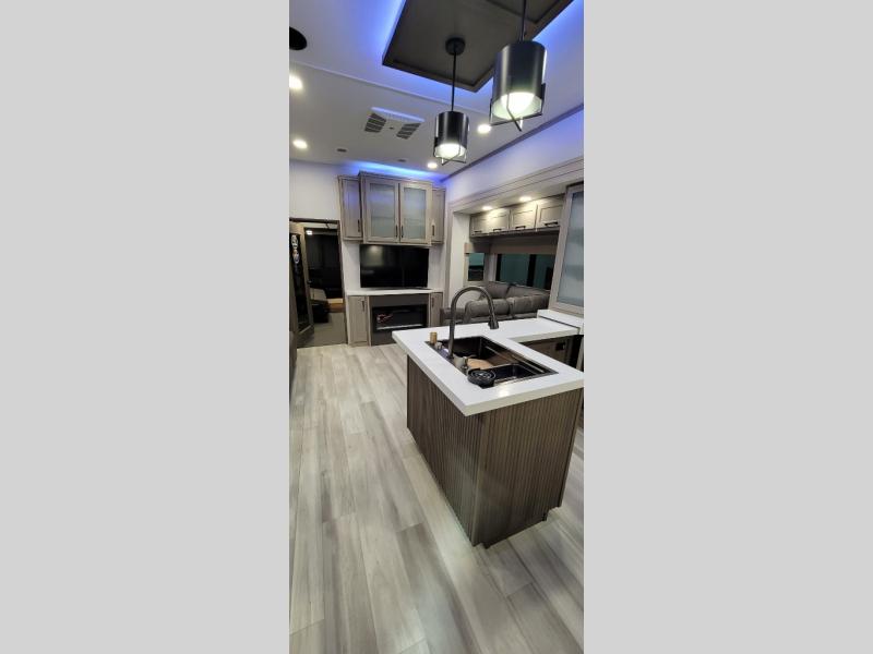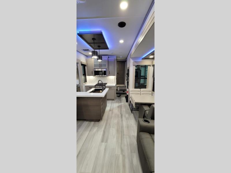 With any Momentum M-Class toy hauler by Grand Design, you will enjoy luxury at every turn! They have been constructed to a superior standard with a thermal roof design, triple insulated main floor and garage floor, and a Rail-Tite underbelly seal that will allow you to camp in all elements. Each model also features an 8' 5" wide body chassis with a wide rail design, no wheel wheels, and a dovetail entry for easier loading. The Stealth A/C system provides maximum cooling power, and the CRE3000 suspension system means you can enjoy a smooth tow each time. You will love the luxurious interior with a professional grade stainless steel cooktop, interior color changing LED accent lighting, a fiberglass shower with a glass door, and solid surface countertops.