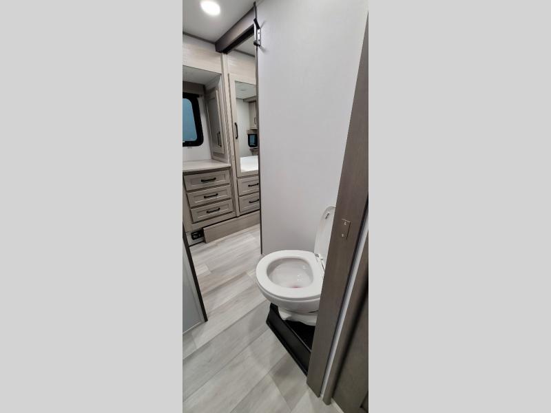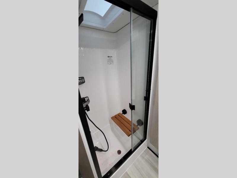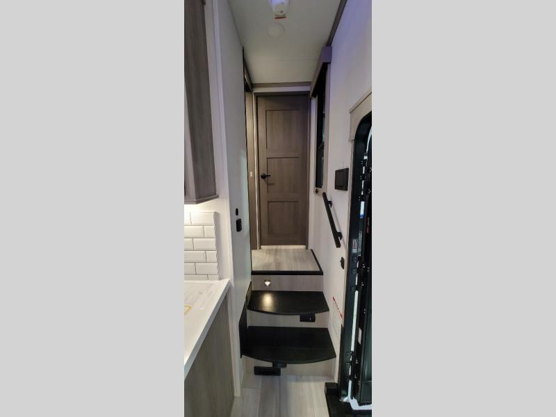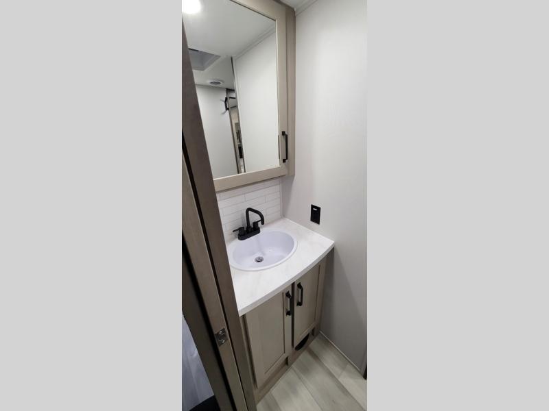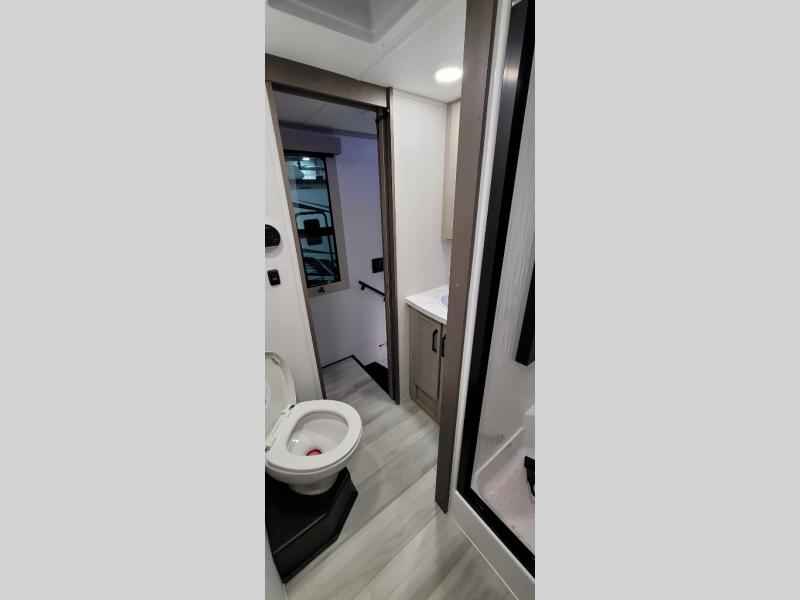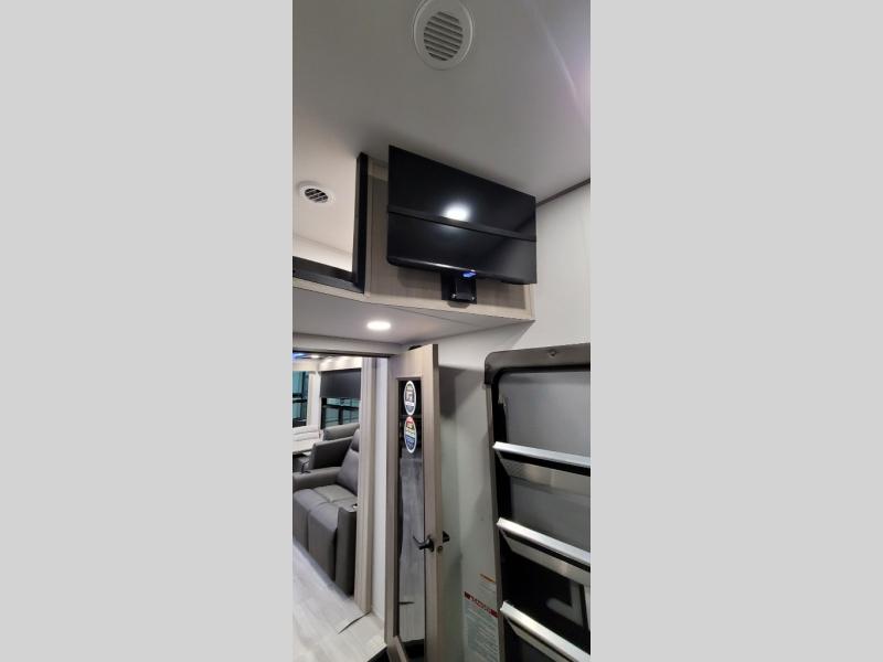 You want a toy hauler to carry your toys to the trails, and include many at-home comforts, and that's just what this unit delivers. A 14' separate garage includes an adjustable tie-down system, an optional Lifesuite System for more sleeping space, an optional half bath, plus washer and dryer prep. There is an overhead loft bed and an L-shaped sofa with recline in the main living area that offers sleeping space as well. Everyone can watch a movie on the LED TV with a fireplace below while sitting on the sofa, in the theatre seats, or while at the free standing dinette with four chairs. The chef will have upgraded appliances to make meals for everyone, an L-shaped countertop with a kitchen sink, and a USB charging outlet. You will love the shower with seat in the full bathroom with two space savings sliding doors that lead into the hallway, and into the front bedroom where you will have a walk-around queen bed, a slide out wardrobe and more USB charging outlets.
