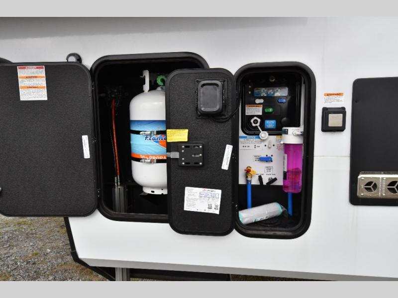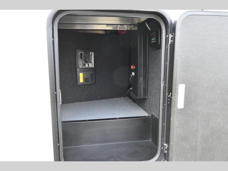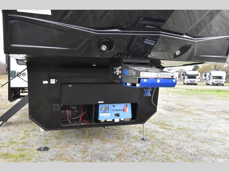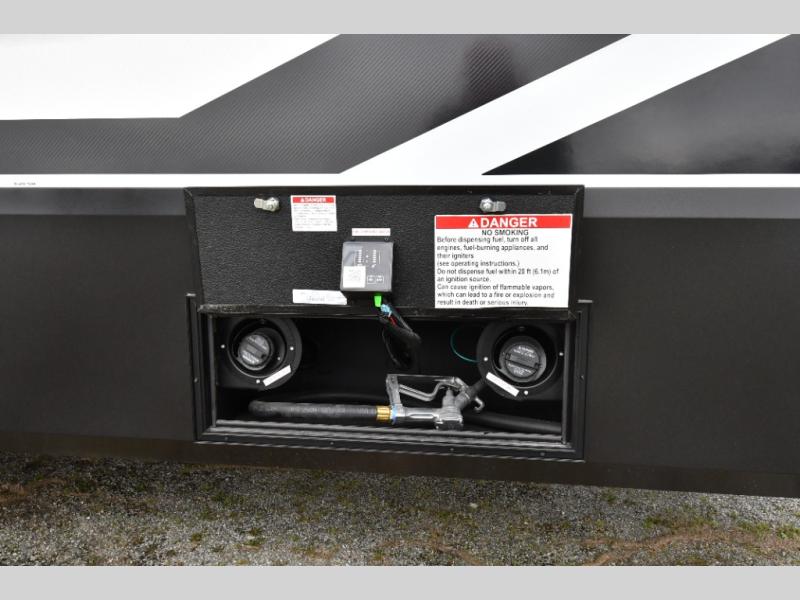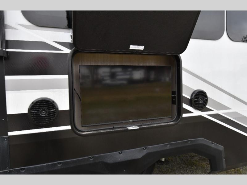 The kitchen is designed to impress with solid surface countertops, upgraded appliances, and a power fan with rain sensor, while the full bath offers a spacious shower with seat and dual sliding doors leading into a private bedroom with a walk-around queen bed and slide-out wardrobe. With triple A/C including a heat pump, plus a Solar+ package, 6kW Yamaha generator, and TravlFi WiFi readiness, this unit is built for year-round comfort on or off the grid. Add in the rear deck with power awning, triple-axle suspension, and upgraded H-rated tires, and you’ve got a toy hauler that’s as capable as it is comfortable.