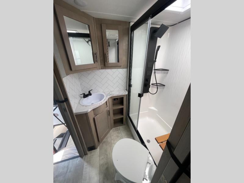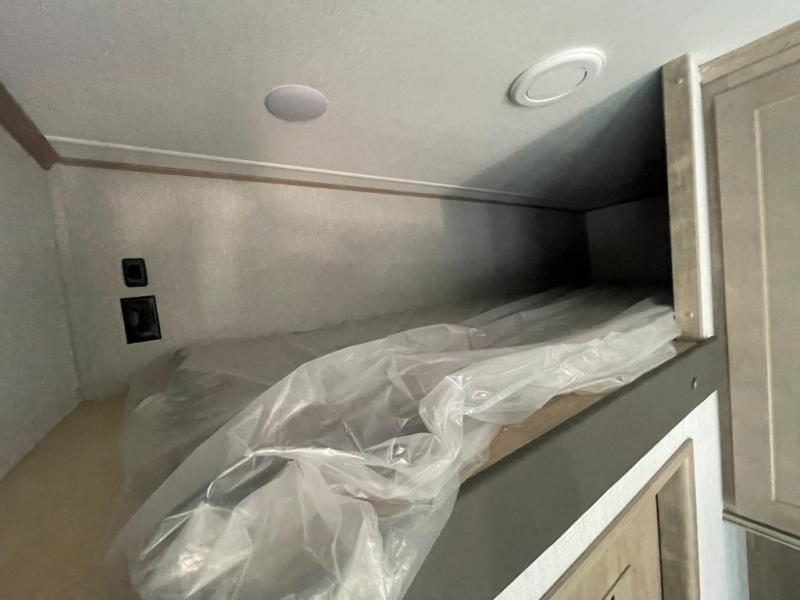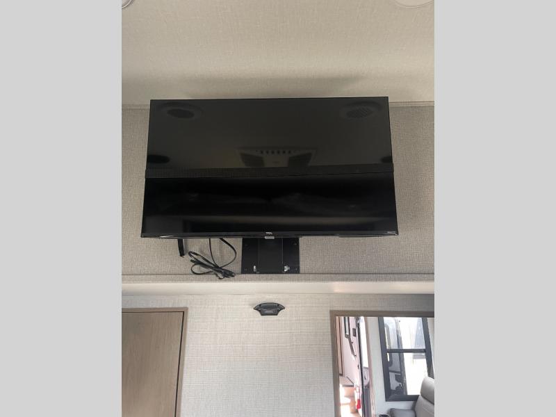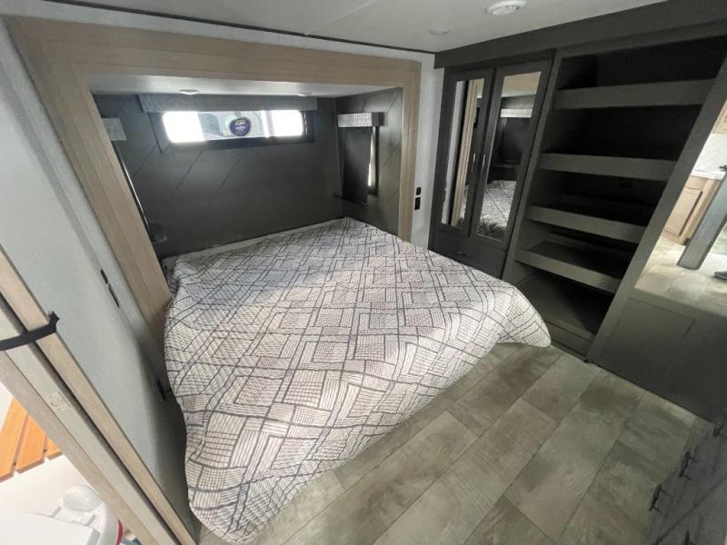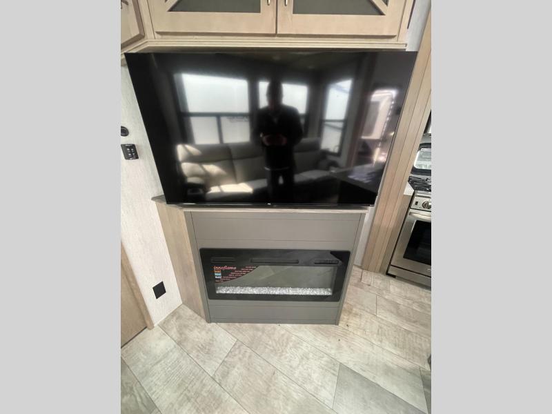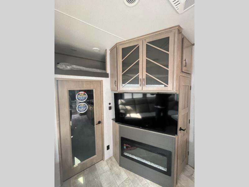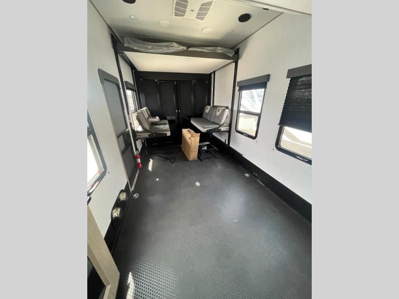 You want a toy hauler to carry your toys to the trails, and include many at-home comforts, and that's just what this unit delivers. A 14' separate garage includes an adjustable tie-down system, an optional Lifesuite System for more sleeping space, an optional half bath, plus washer and dryer prep. There is an overhead loft bed and an L-shaped sofa with recline in the main living area that offers sleeping space as well. Everyone can watch a movie on the LED TV with a fireplace below while sitting on the sofa, in the theatre seats, or while at the free standing dinette with four chairs. The chef will have upgraded appliances to make meals for everyone, an L-shaped countertop with a kitchen sink, and a USB charging outlet. You will love the shower with seat in the full bathroom with two space savings sliding doors that lead into the hallway, and into the front bedroom where you will have a walk-around queen bed, a slide out wardrobe and more USB charging outlets.