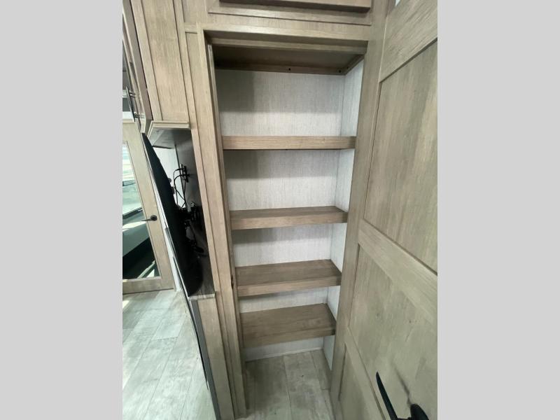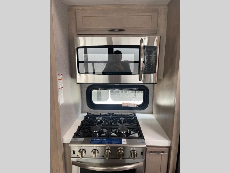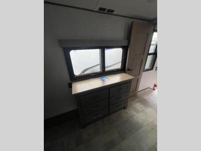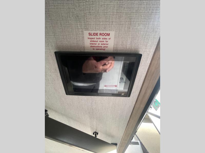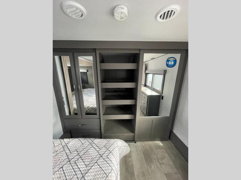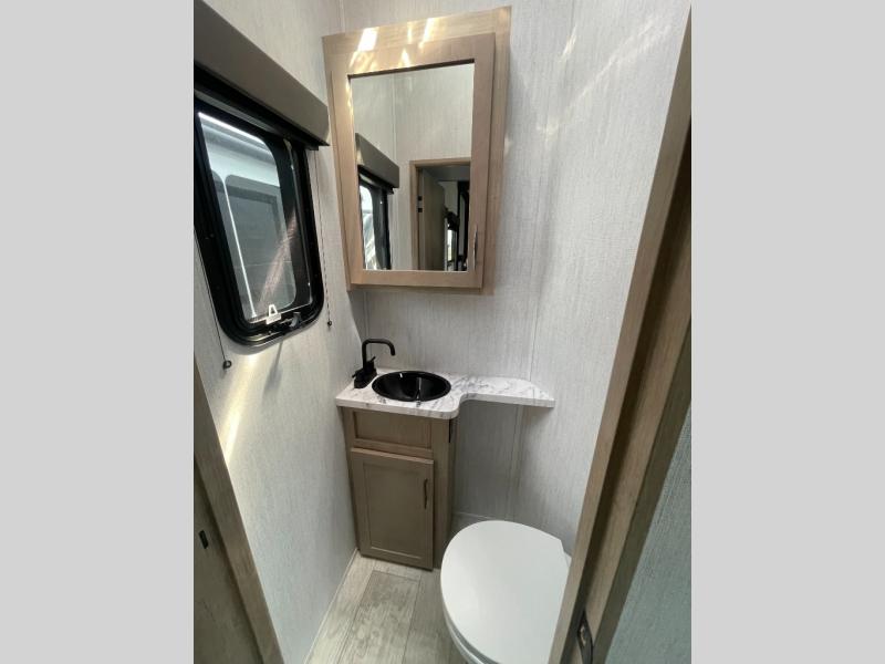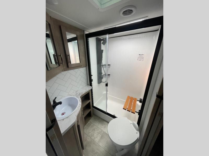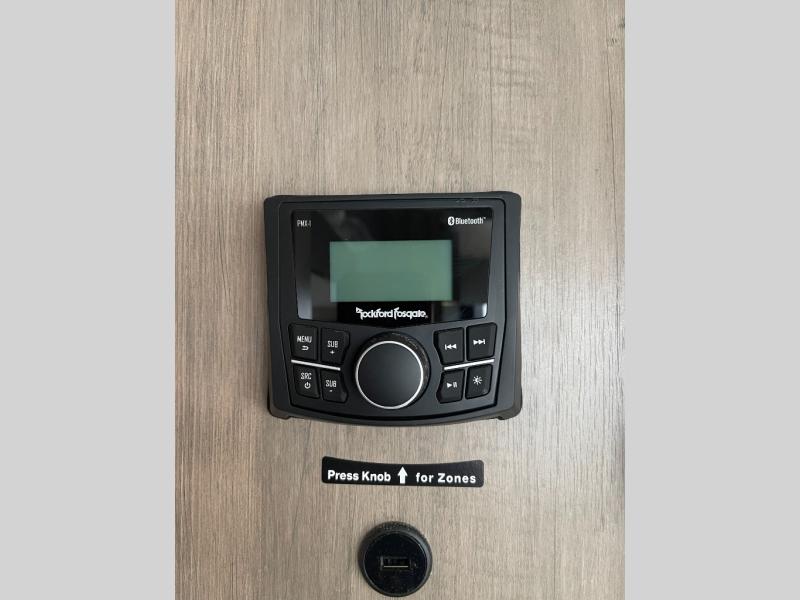 You want a toy hauler to carry your toys to the trails, and include many at-home comforts, and that's just what this unit delivers. A 14' separate garage includes an adjustable tie-down system, an optional Lifesuite System for more sleeping space, an optional half bath, plus washer and dryer prep. There is an overhead loft bed and an L-shaped sofa with recline in the main living area that offers sleeping space as well. Everyone can watch a movie on the LED TV with a fireplace below while sitting on the sofa, in the theatre seats, or while at the free standing dinette with four chairs. The chef will have upgraded appliances to make meals for everyone, an L-shaped countertop with a kitchen sink, and a USB charging outlet. You will love the shower with seat in the full bathroom with two space savings sliding doors that lead into the hallway, and into the front bedroom where you will have a walk-around queen bed, a slide out wardrobe and more USB charging outlets.