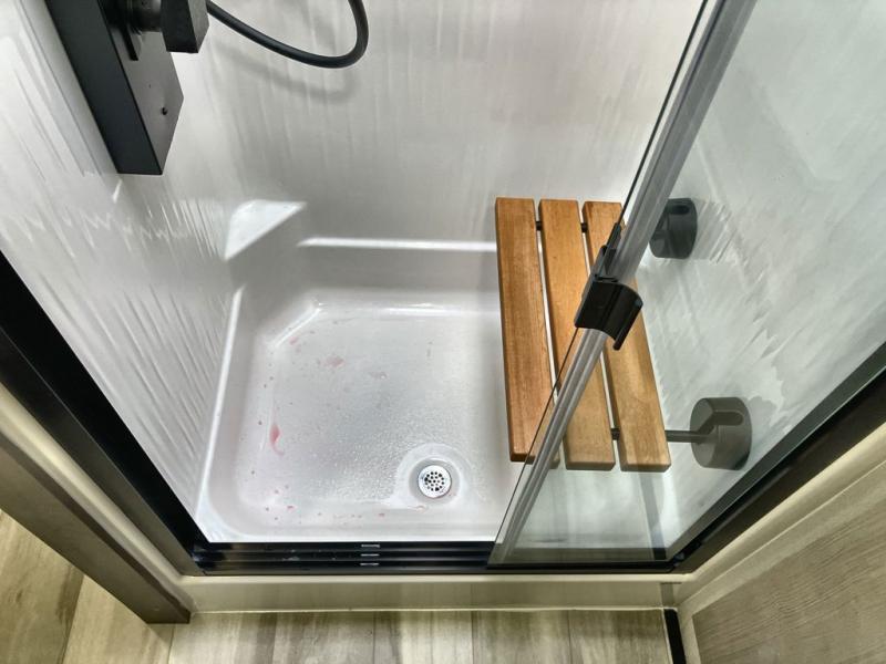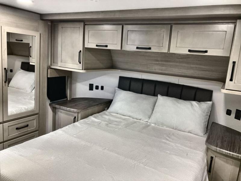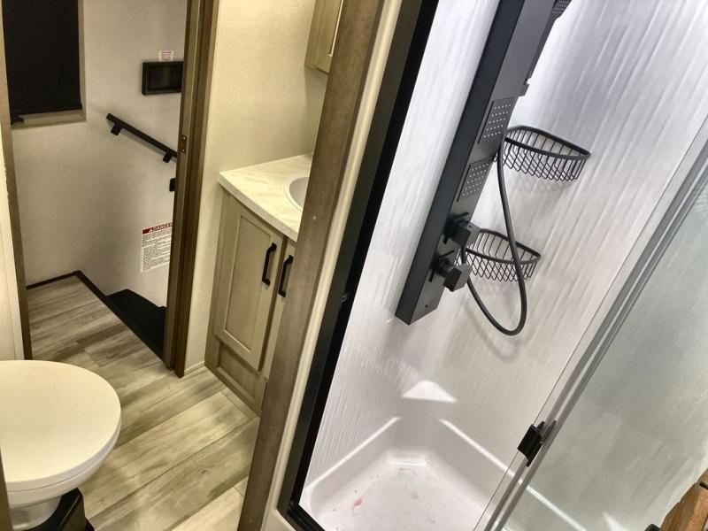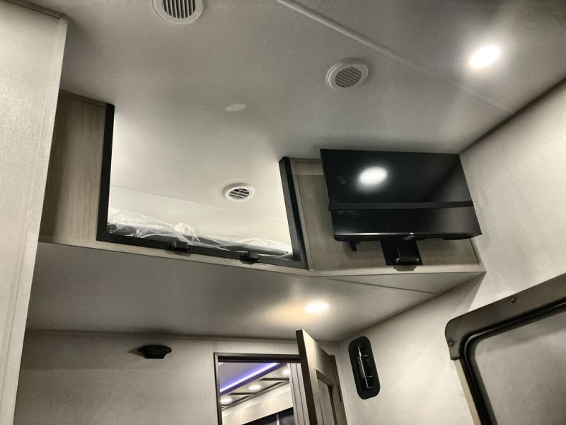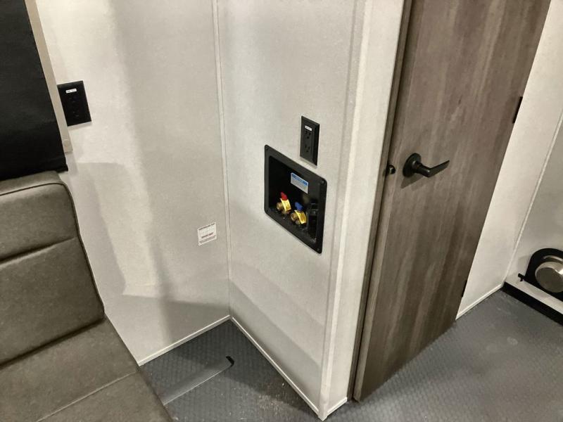 You want a toy hauler to carry your toys to the trails, and include many at-home comforts, and that's just what this unit delivers. A 14' separate garage includes an adjustable tie-down system, an optional Lifesuite System for more sleeping space, an optional half bath, plus washer and dryer prep. There is an overhead loft bed and an L-shaped sofa with recline in the main living area that offers sleeping space as well. Everyone can watch a movie on the LED TV with a fireplace below while sitting on the sofa, in the theatre seats, or while at the free standing dinette with four chairs. The chef will have upgraded appliances to make meals for everyone, an L-shaped countertop with a kitchen sink, and a USB charging outlet. You will love the shower with seat in the full bathroom with two space savings sliding doors that lead into the hallway, and into the front bedroom where you will have a walk-around queen bed, a slide out wardrobe and more USB charging outlets.