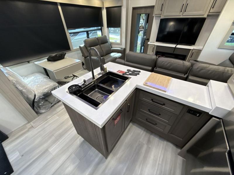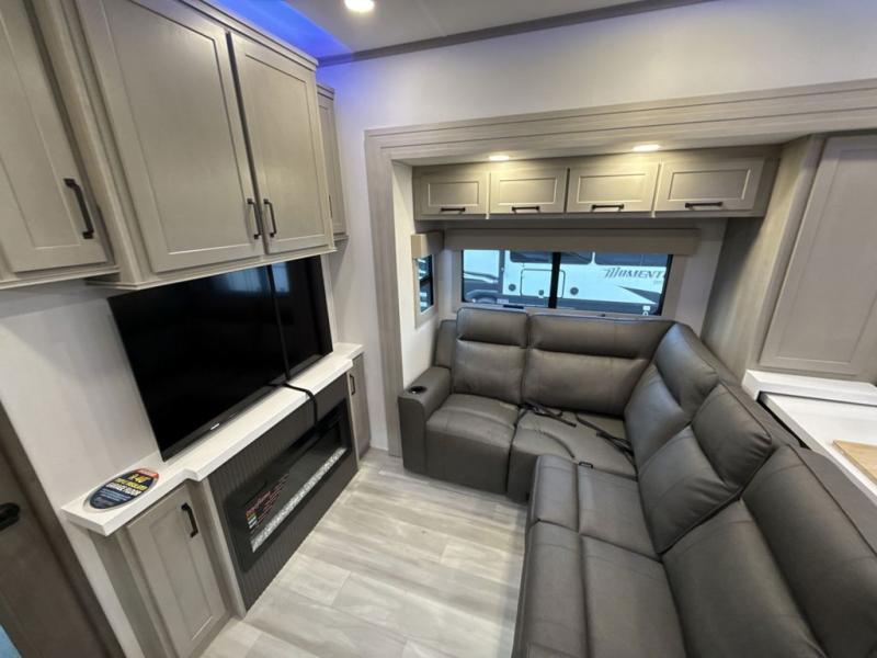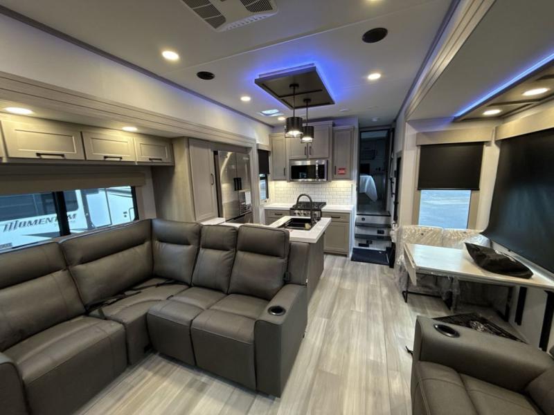 With any Momentum M-Class toy hauler by Grand Design, you will enjoy luxury at every turn! They have been constructed to a superior standard with a thermal roof design, triple insulated main floor and garage floor, and a Rail-Tite underbelly seal that will allow you to camp in all elements. Each model also features an 8' 5" wide body chassis with a wide rail design, no wheel wheels, and a dovetail entry for easier loading. The Stealth A/C system provides maximum cooling power, and the CRE3000 suspension system means you can enjoy a smooth tow each time. You will love the luxurious interior with a professional grade stainless steel cooktop, interior color changing LED accent lighting, a fiberglass shower with a glass door, and solid surface countertops.