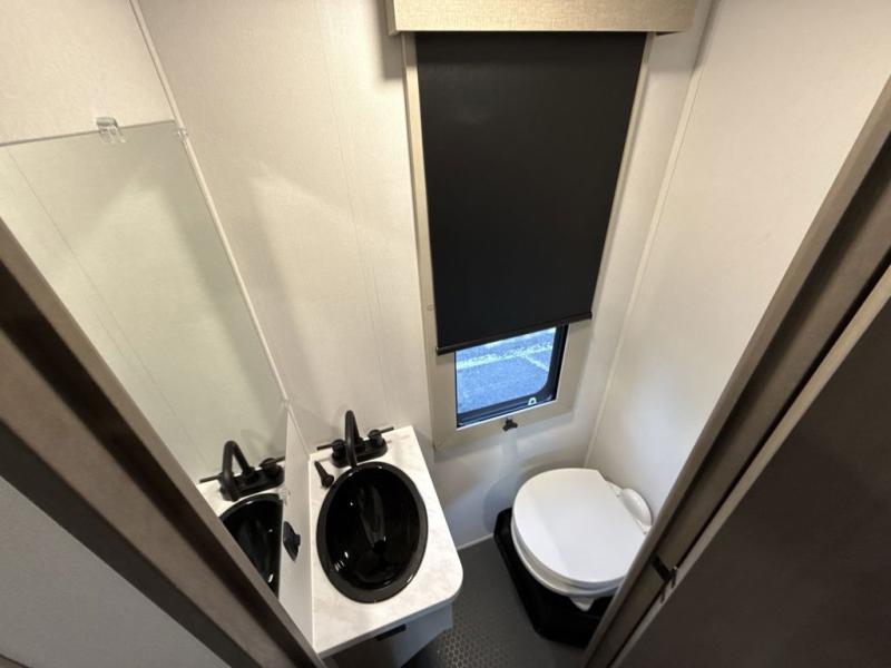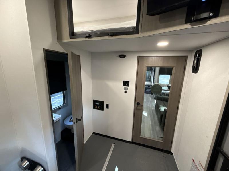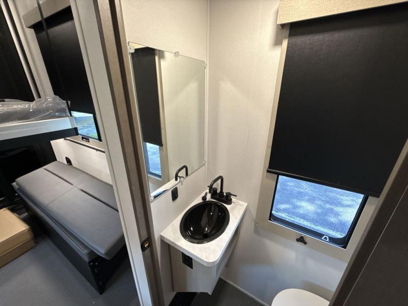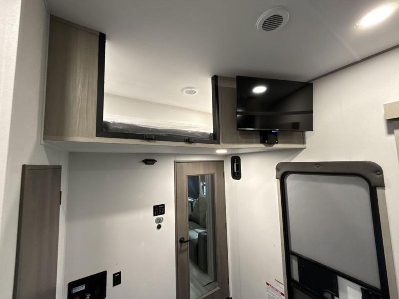 You want a toy hauler to carry your toys to the trails, and include many at-home comforts, and that's just what this unit delivers. A 14' separate garage includes an adjustable tie-down system, an optional Lifesuite System for more sleeping space, an optional half bath, plus washer and dryer prep. There is an overhead loft bed and an L-shaped sofa with recline in the main living area that offers sleeping space as well. Everyone can watch a movie on the LED TV with a fireplace below while sitting on the sofa, in the theatre seats, or while at the free standing dinette with four chairs. The chef will have upgraded appliances to make meals for everyone, an L-shaped countertop with a kitchen sink, and a USB charging outlet. You will love the shower with seat in the full bathroom with two space savings sliding doors that lead into the hallway, and into the front bedroom where you will have a walk-around queen bed, a slide out wardrobe and more USB charging outlets.