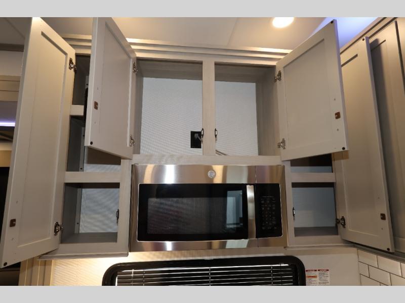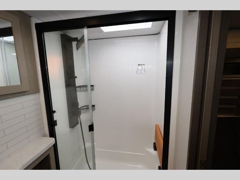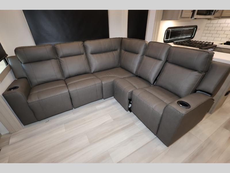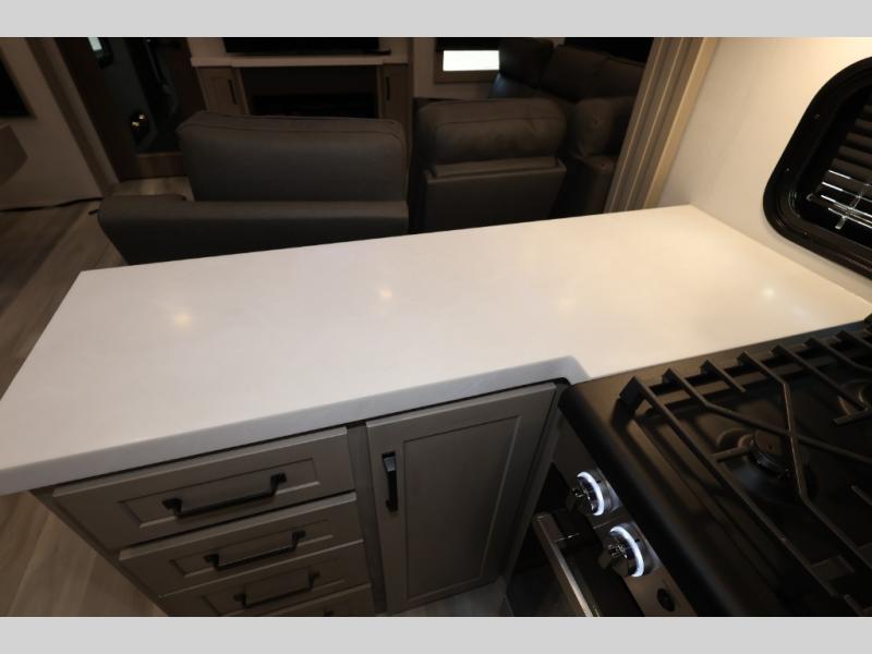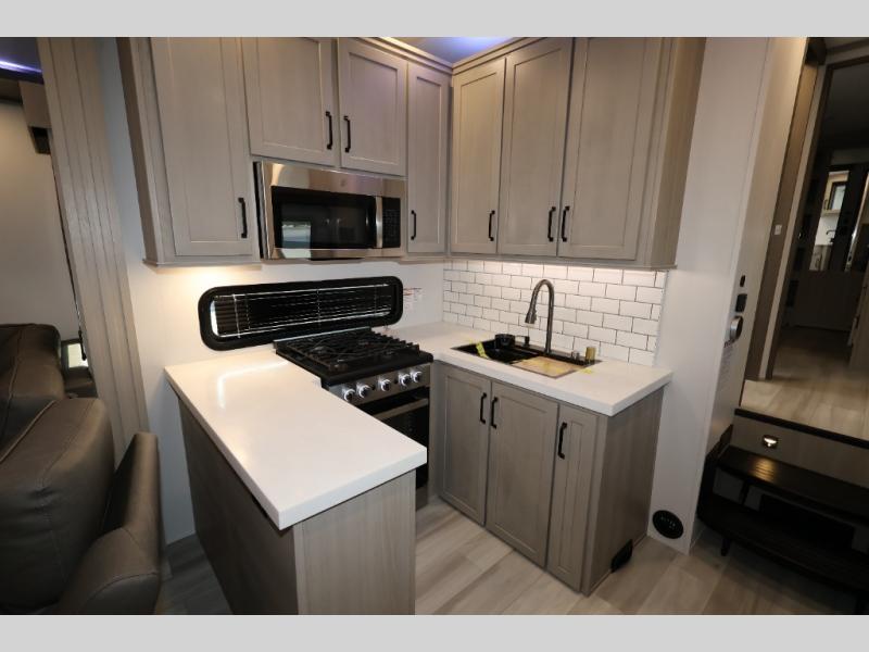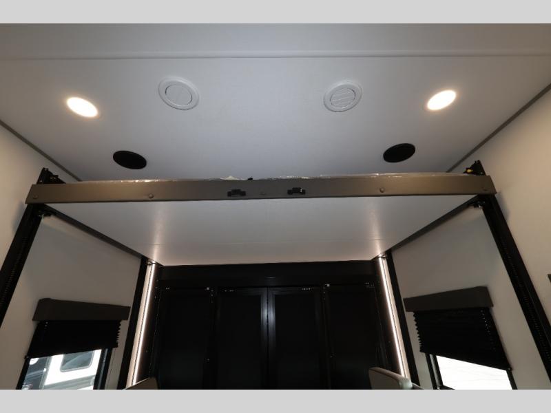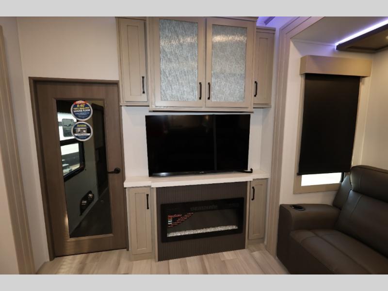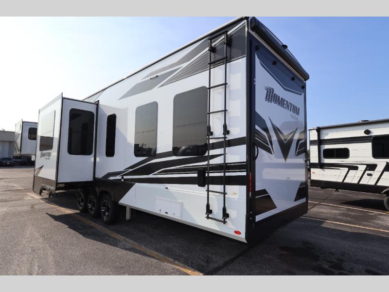 With any Momentum M-Class toy hauler by Grand Design, you will enjoy luxury at every turn! They have been constructed to a superior standard with a thermal roof design, triple insulated main floor and garage floor, and a Rail-Tite underbelly seal that will allow you to camp in all elements. Each model also features a, 8' 5" wide body chassis with a wide rail design, no wheel wheels, and a dovetail entry for easier loading. The Stealth A/C system provides maximum cooling power, and the CRE3000 suspension system means you can enjoy a smooth tow each time. You will love the luxurious interior with a professional grade stainless steel cooktop, interior color changing LED accent lighting, a fiberglass shower with a glass door, and solid surface countertops.