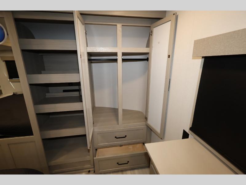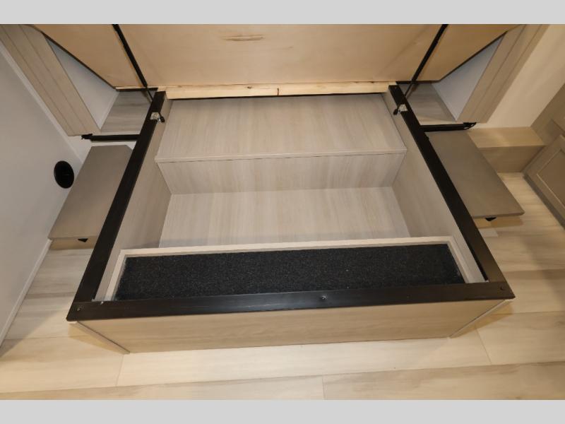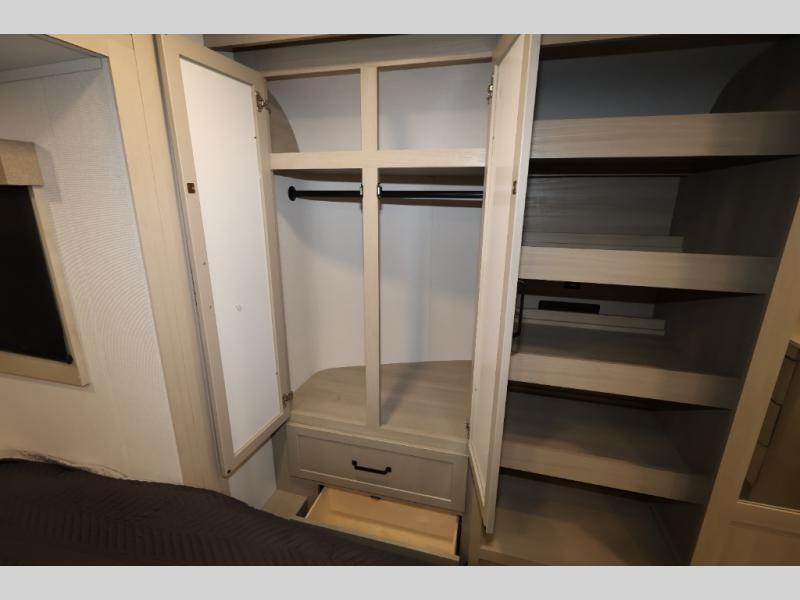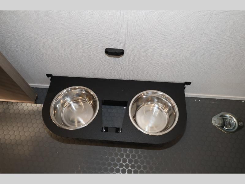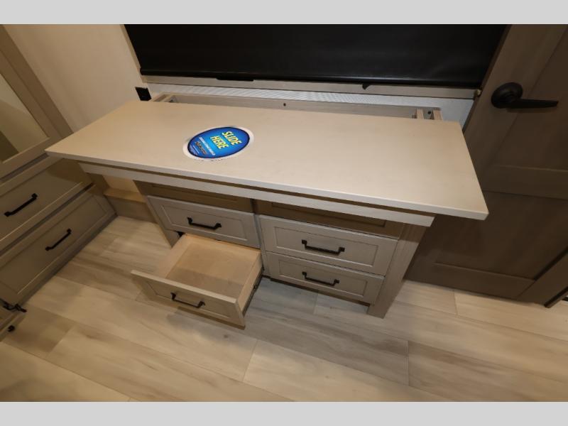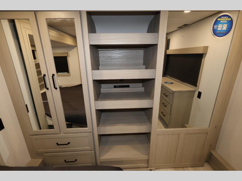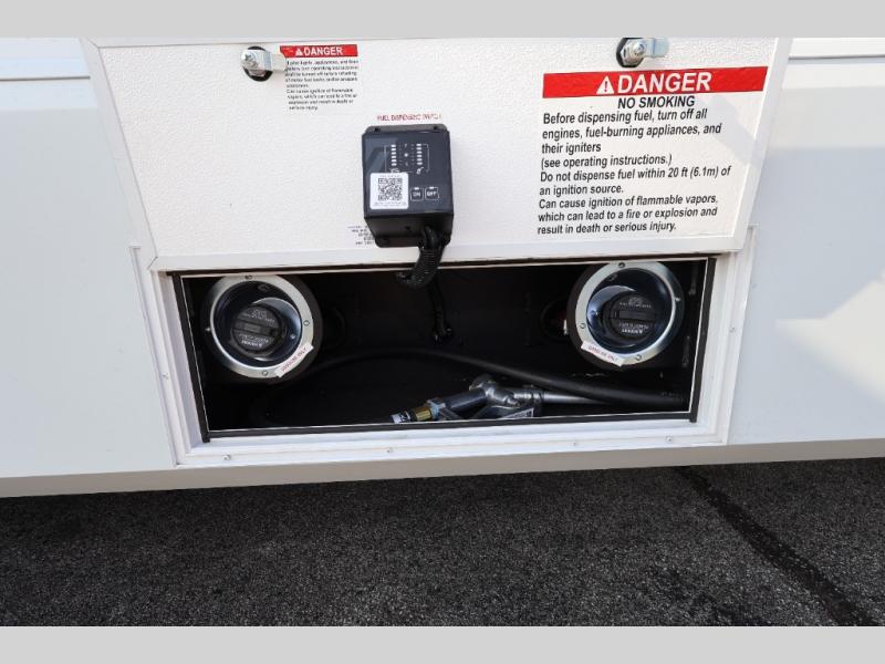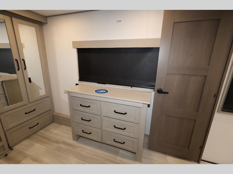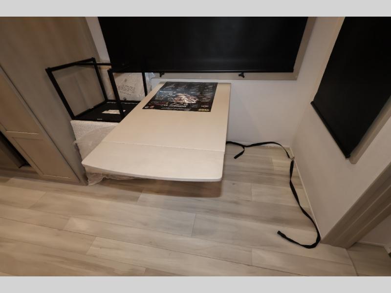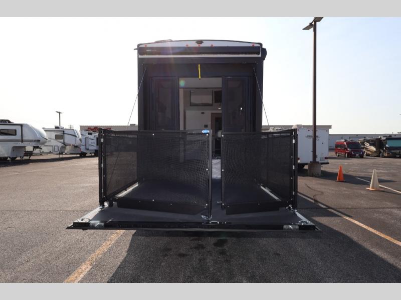 Any time spent in this spacious toy hauler will be time well spent! The 14' garage includes an overhead loft bed and a flip-up pet dish for your furry friends. If you're needing more sleeping space, you might want to choose the optional Happi-Jac rollover sofas and table with a drop down bed and optional half bath! Once you enter in the main living area, you can relax on the tri-fold sofa or theater seating across from the fireplace, and there is a free-standing dinette if you want to play a game or two. The chef of your group will love the generous counter space in the kitchen, and the dual entry bath will let everyone stay clean throughout your trip! Head to the front master bedroom to enjoy the queen bed slide out with an optional king bed, a slide top dresser with TV prep, plus a large front closet, complete with washer and dryer prep!