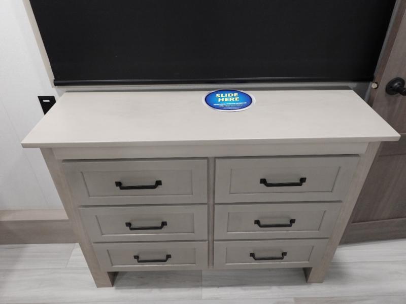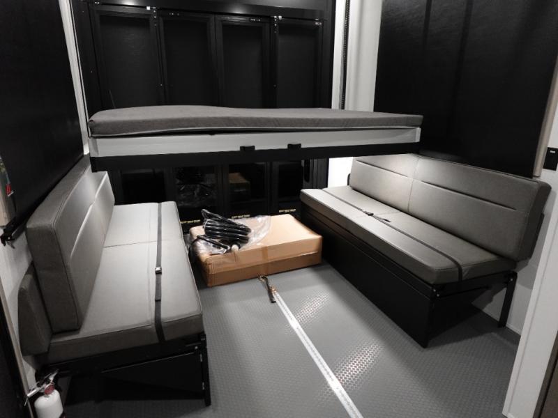 Any time spent in this spacious toy hauler will be time well spent! The 14' garage includes an overhead loft bed and a flip-up pet dish for your furry friends. If you're needing more sleeping space, you might want to choose the optional Liftsuite System and optional half bath. Once you enter in the main living area, you can relax on the L-shaped sofa with recline across from the fireplace, and there is a free-standing dinette if you want to play a game or two. The chef of your group will love the generous counter space in the kitchen, and the dual entry bath will let everyone stay clean throughout your trip! Head to the front master bedroom to enjoy the king bed slide out, a slide top dresser with TV prep, plus a large front closet, complete with washer and dryer prep!